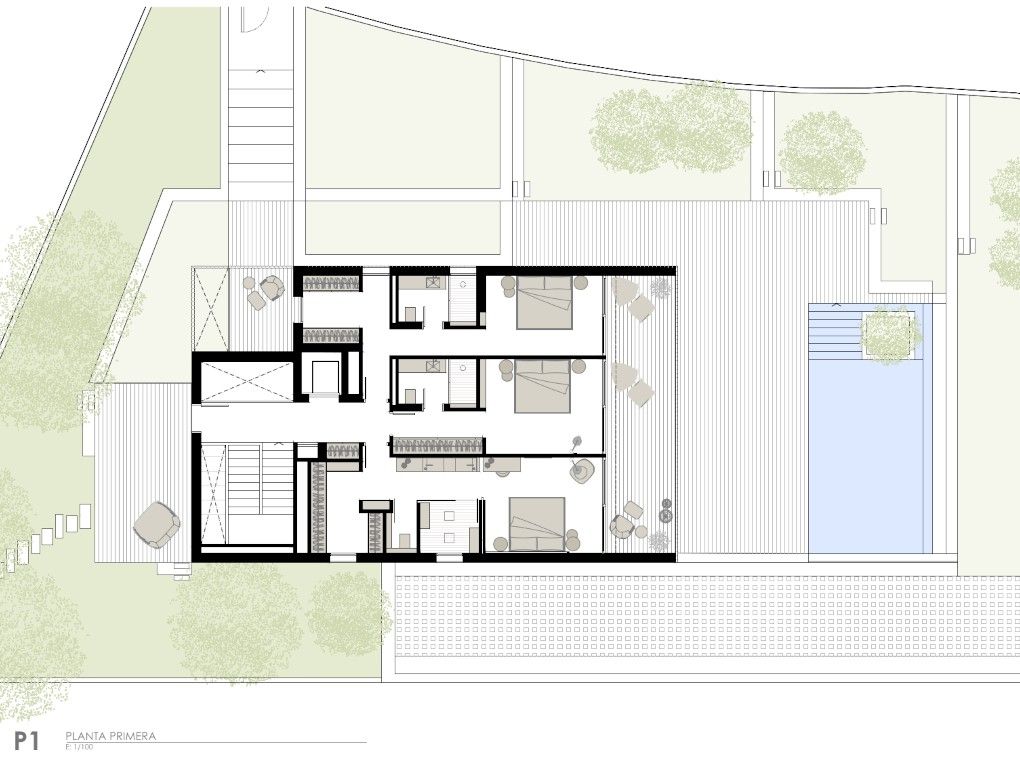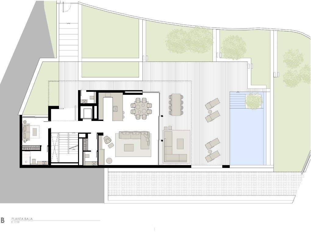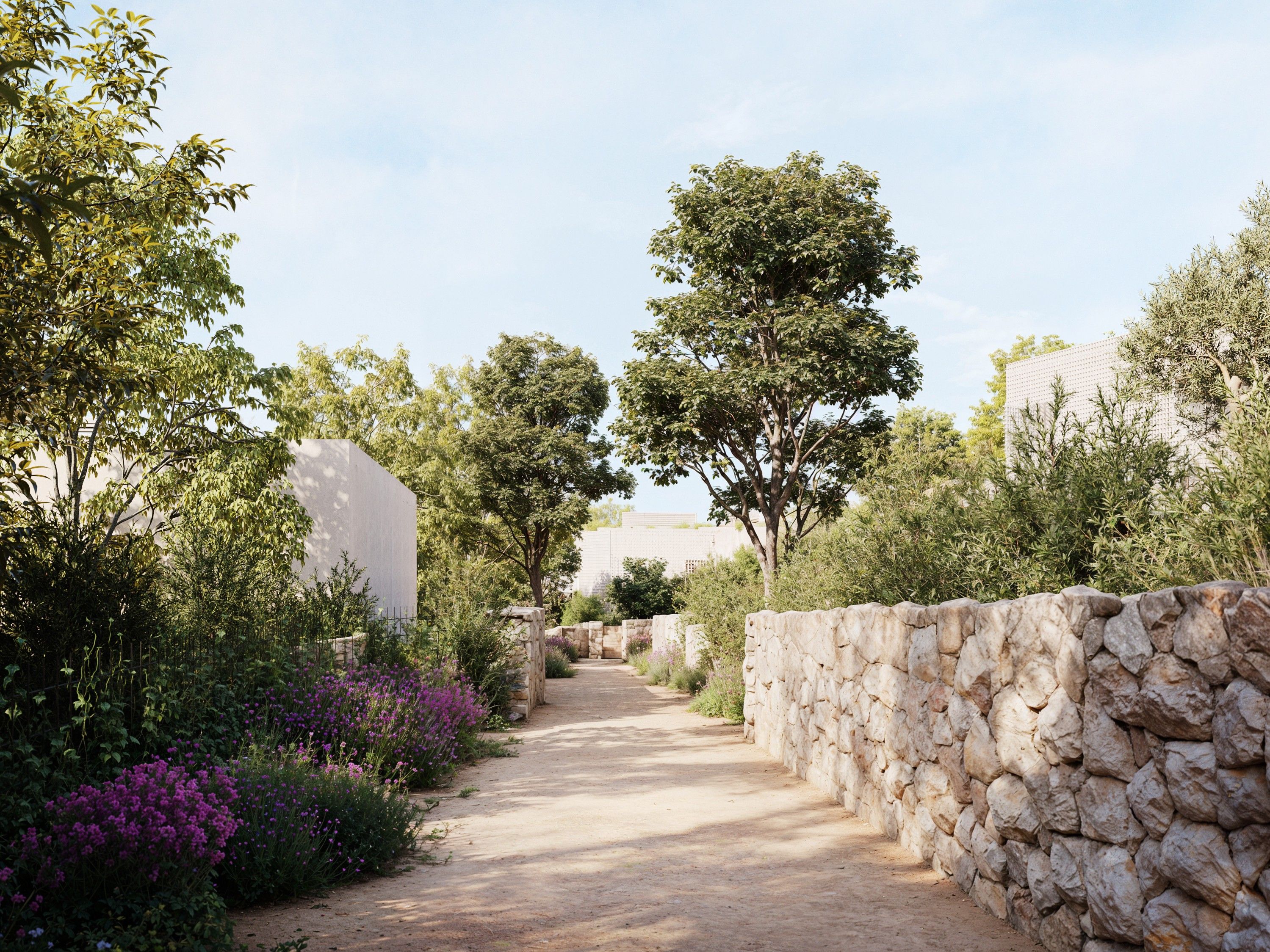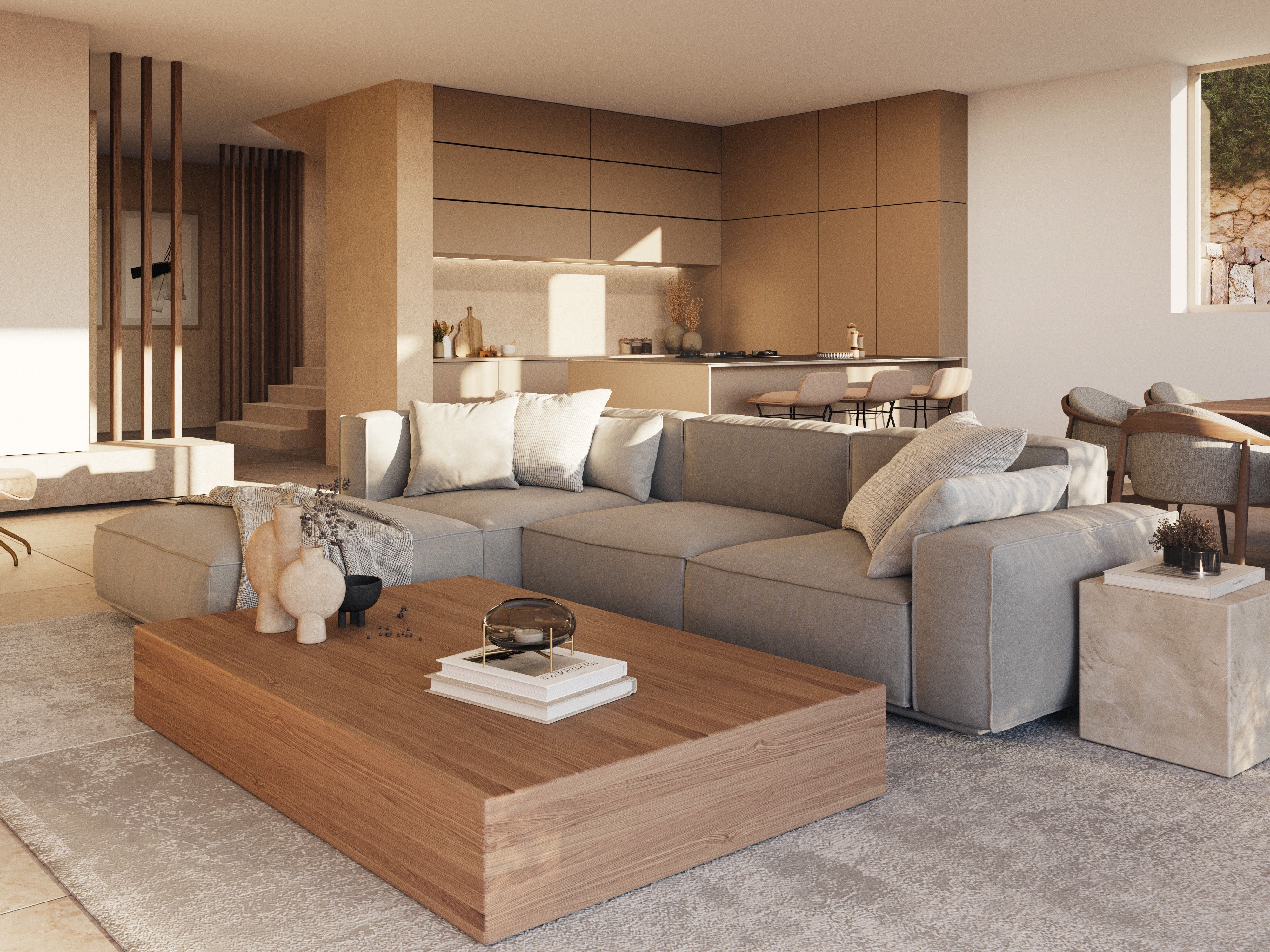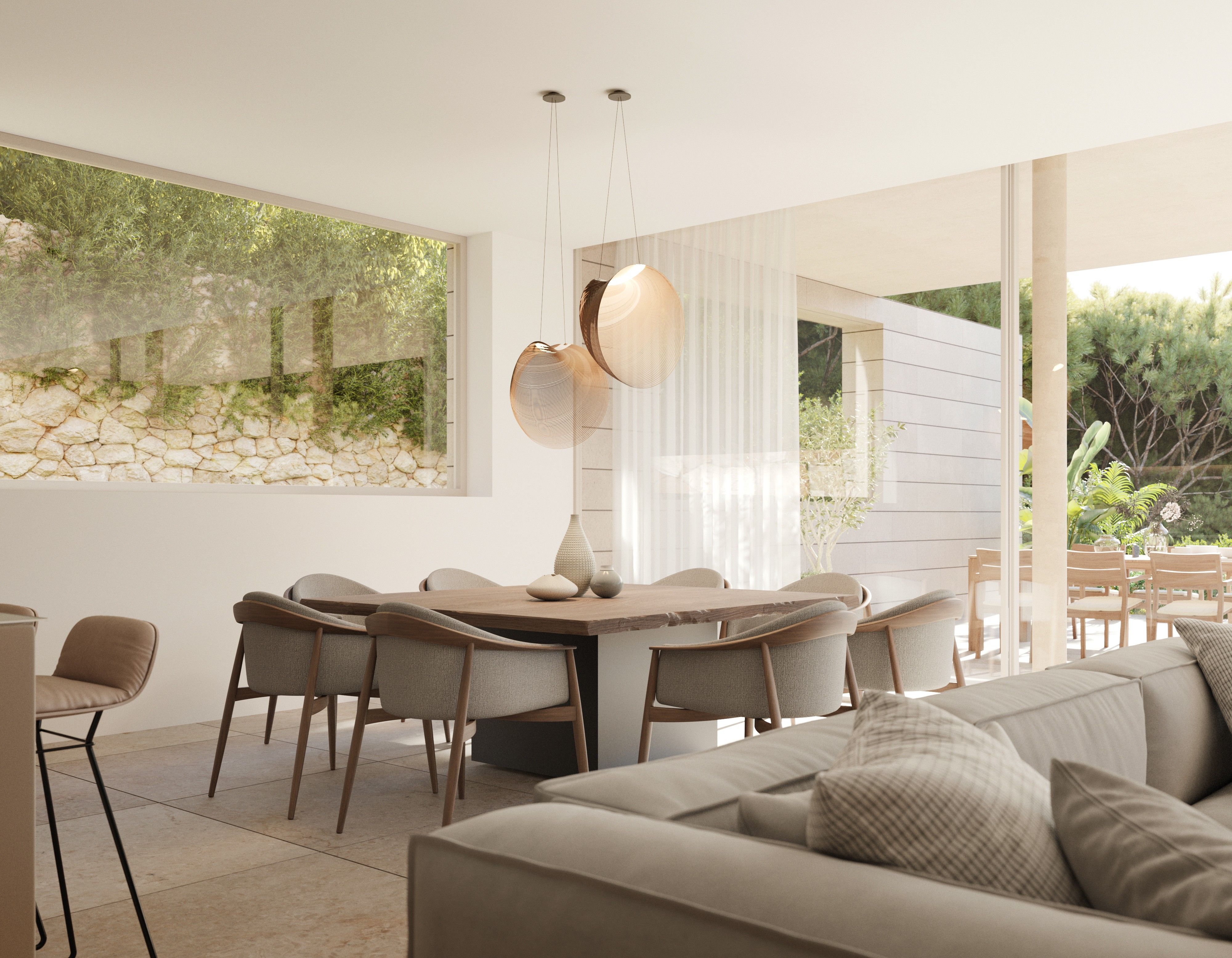 I hjertet af det sydvestlige Mallorca, omgivet af frodig middelhavsvegetation, opføres boligkomplekset VERDEMAR med 11 fritliggende villaer med private infinity-pools direkte ved havet. Beliggenheden er rolig og central, kun 15 minutter fra Palma og 25 minutter fra lufthavnen. Bugten Cala Vinyes med fin sandstrand, turkisblåt vand og en hyggelig strandbar kan nås til fods på få minutter. Familiens hverdag gøres også lettere af nærheden til internationale skoler, sports- og fritidsfaciliteter. Golfelskere har Poniente Golf Club kun et stenkast væk og andre golfbaner i det nærliggende område. De 11 villaer deler visse designelementer og er især kendetegnet ved arkitektur med rene linjer og en moderne fortolkning af det traditionelle laticcework samt sammensmeltningen af indendørs og udendørs rum. Nyd den intimitet og ro, som villaerne tilbyder dig. Under planlægningsprocessen blev der lagt særlig vægt på at sikre, at bygningernes orientering giver maksimalt privatliv. Ikke desto mindre skabes der en følelse af fællesskab ved hjælp af stien, der forbinder alle husene og det private grønne område. Der blev også lagt særlig vægt på brugen af lokale, bæredygtige materialer. Derudover er metalgitteret, der omgiver de tre soveværelser ovenpå, ikke kun et imponerende visuelt træk, men giver også luften mulighed for at cirkulere frit, mens det filtrerer direkte sollys og holder boligerne kølige. Samtidig giver det dig mulighed for at forvandle dine soveværelser og terrasse til en afsondret oase af ro. Alle soveværelser (3-4) er rummelige og udstyret med indbyggede garderobeskabe og eget badeværelse. Det store soveværelse har et integreret, men alligevel separat badeværelse med stor spabruser. Villaernes midtpunkt er opholds- og spiseområdet med åbent køkken fra bulthaup med kogeø og gulv-til-loft-vinduer, der åbner helt op til terrassen og den private have med pool, hvilket skaber en glidende overgang fra indendørs til udendørs ophold. En ekstra rummelighed skabes af, at der er lagt et lyst naturstensgulv i stort format i hele huset og på terrasserne. En behagelig atmosfære skabes af forskellige elementer af træ og varm belysning. Andre funktioner omfatter indbyggede Miele-apparater, Gessi-vandhaner eller lignende, minimalistiske vinduer fra METRA, KNX Smart Home, individuelt styret klimaanlæg w/c og gulvvarme. Hvert hus har også en garage eller overdækket parkering til flere biler.