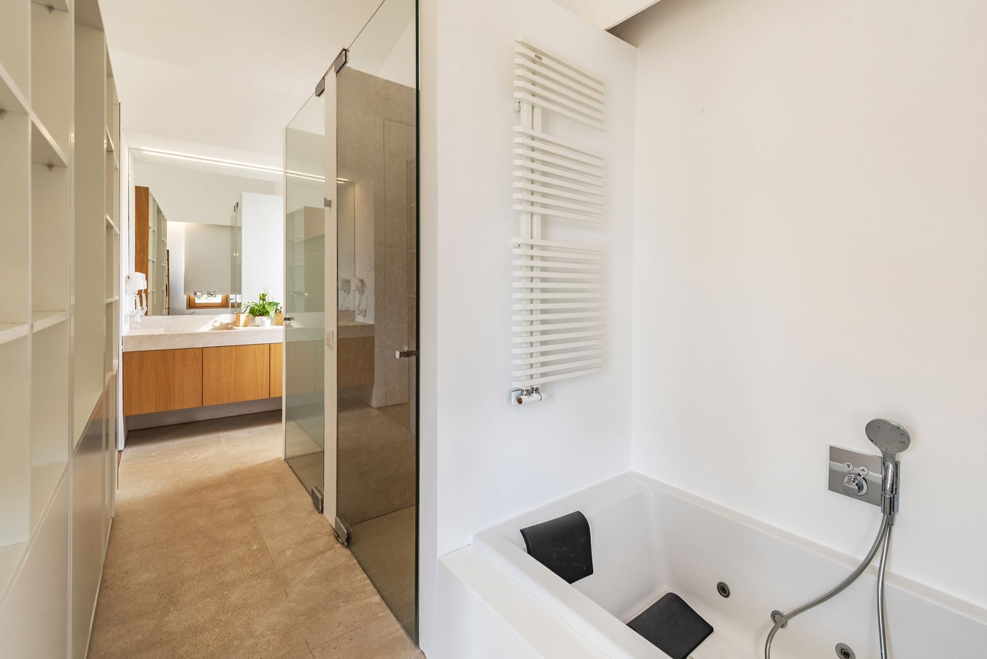 Villaen er fordelt på to niveauer og har fem soveværelser med eget bad, to gæstetoiletter og et ekstra brusebad ved siden af poolområdet. Det lyse opholdsrum består af en rummelig stue-spisestue med gulv-til-loft-vinduer, der oversvømmer rummet med naturligt lys. Det moderne, fuldt udstyrede køkken er elegant adskilt af en væg og byder på funktionalitet og stil. På denne etage er der også et gæstetoilet og det første soveværelse en suite.