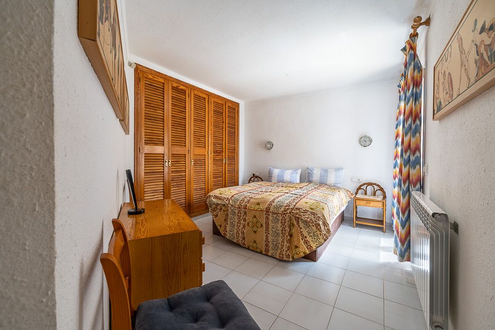 Denne ejendom ligger kun 700 meter fra stranden og består af en bungalow bygget i 1980. Villaen har i øjeblikket tre soveværelser og to badeværelser med bruser, hvoraf det ene er en suite. Der er også et lille køkken med direkte adgang til haven og en overdækket terrasse, perfekt til sociale sammenkomster i det fri. Desuden har villaen en lille tagterrasse med pragtfuld udsigt over omgivelserne. Stuen og spisestuen strækker sig over to niveauer og skaber et åbent og rummeligt opholdsområde. Det skal bemærkes, at dele af pergolaerne skal rives ned, da minimumsafstanden til den venstre nabo ikke blev overholdt.