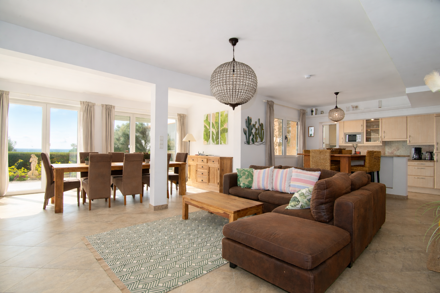 Velkommen til dette charmerende enfamiliehus i middelhavsstil, bygget i 1993 på en ca. 800 m² stor grund. Beliggende i et grønt miljø med frodig moden natur og panoramaudsigt over havet, tilbyder denne ejendom en unik oplevelse af ro og skønhed. Med en ferieudlejningslicens til 6 pladser ligger dette hus i anden linje af havet, så man kan nyde havbrisen fra komforten i dit hjem. I stueetagen er der en opholds- og spisestue med pejs. Det halvåbne køkken og det tilstødende vaskerum tilbyder bekvemmelighed og funktionalitet, mens to soveværelser giver plads til familie eller gæster. Derudover finder man et badeværelse med bruser og et gæstetoilet. I den øverste del af huset er der en spektakulær suite med en rummelig stue, et soveværelse med eget badeværelse og et kontorhjørne, der er perfekt til at arbejde hjemmefra. Et ekstra toilet gør denne luksuriøse suite praktisk, og den bliver ens private oase med en betagende udsigt over de naturlige omgivelser og havet. Ejendommen har også en garage til en bil. Udendørsområdet indbyder til at nyde middelhavsklimaet med en 37 m² stor pool, der er perfekt til afkøling på varme dage. En pergola-gazebo tilbyder et dejligt sted at slappe af og nyde udendørs måltider, mens en udendørs bruser giver et forfriskende touch efter en dag på stranden. Huset er udstyret med kanaliseret aircondition til både køling og opvarmning, hvilket sikrer en behagelig atmosfære på alle årstider. Kort sagt kombinerer denne ejendom komfort med middelhavscharme i idylliske omgivelser.