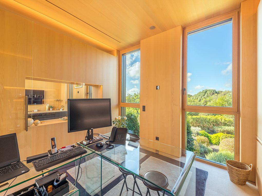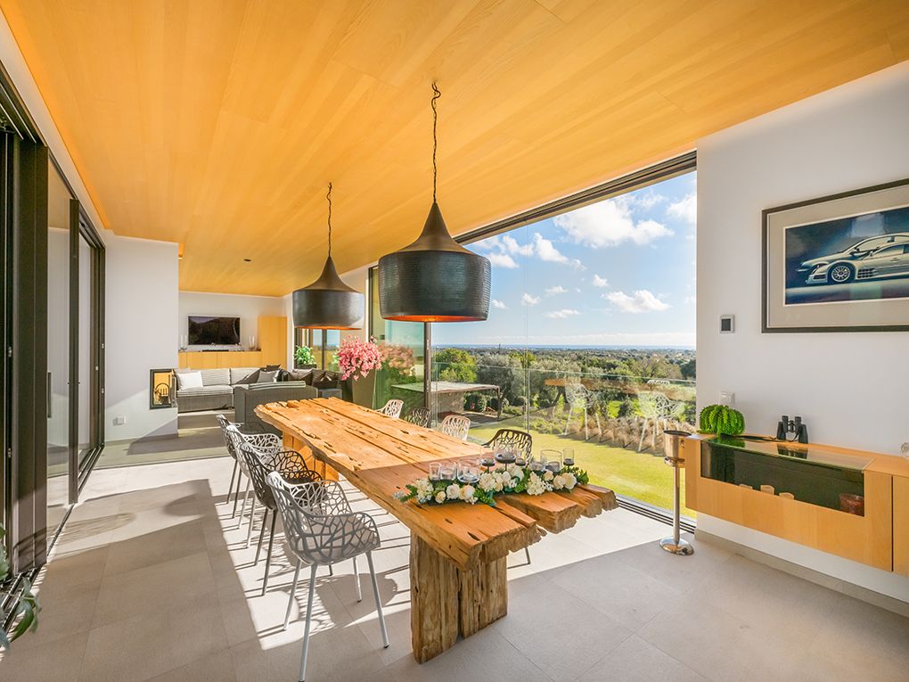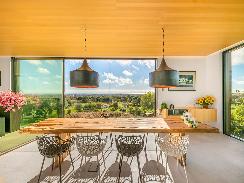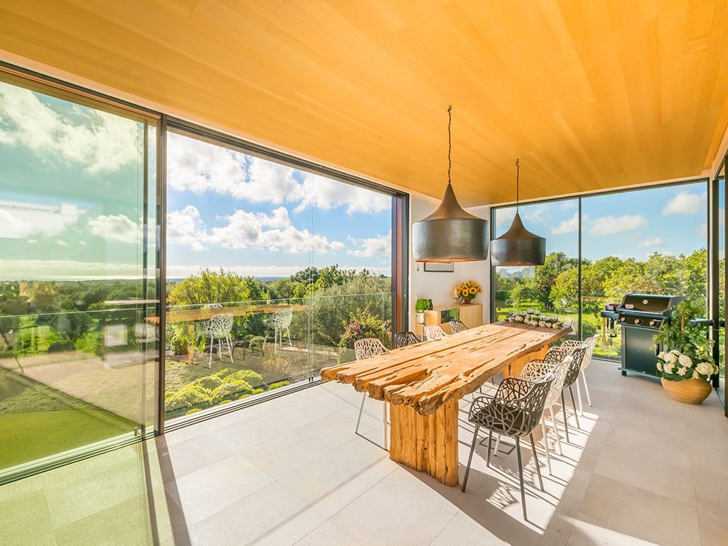 Diese luxuriöse Finca liegt in einer idyllischen Hügellandschaft nur wenige Autominuten von S’Alquería Blanca entfernt. Sie besticht durch ihren beeindruckenden Meerblick. Das ebenerdige Haus teilt sich in zwei Flügel auf. In einem Flügel sind der komplett verglaste Wohn- und Essbereich mit Kamin, eine vollausgestattete Küche mit Kühlraum, sowie ein Büro sowie ein Wohnzimmer untergebracht. Im anderen Flügel gibt es drei Schlafzimmer mit jeweils Bad en Suite und ein Gäste WC. Eines der Schlafzimmer verfügt über ein dazugehöriges Kinderzimmer. Das Masterschlafzimmer besitzt über einen eigenen Ankleidebereich. Das Herzstück des Anwesens ist der große verglaste Patio in der Mitte des Hauses in dem sich der voll automatisierte Pool befindet. Die bodentiefen Fenster in nahezu allen Räumen lassen viel Licht hinein und das Haus offen und hell erscheinen. Sowohl über einen Aufzug im Empfangsbereich als auch über eine Treppe in der Garage gelangen Sie zum separaten Gästeapartment. Darin befinden sich Wohnbereich mit kleiner Küchenzeile, ein Schlafzimmer sowie ein Bad. Ein Highlight ist der Fitnessbereich sowie die Sauna mit eigenem Duschbad und WC, von der Sie Zugang zum beachtenswerten Garten haben. Eine Fußbodenheizung und die Klimaanlage in den Schlafzimmern und in der Küche bieten ganzjährig eine angenehme Atmosphäre. Obendrein ist dieses Haus mit der neuesten und modernsten Technik, die eine rundum Fernsteuerung bietet ausgestattet. Eines der außergewöhnlichsten Immobilien im Südosten!