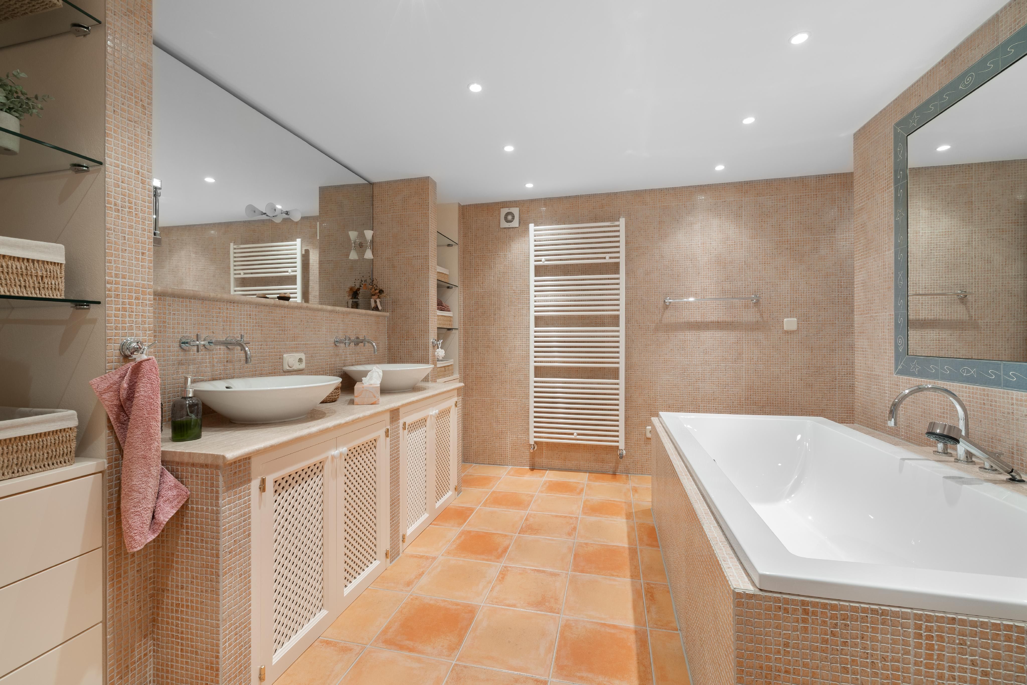 Im Obergeschoss erwartet Sie das Hauptschlafzimmer mit Bad en Suite und Ankleidebereich. Zwei weitere Schlafzimmer sowie ein zusätzlicher Wohnbereich mit eigenem Zugang bieten ideale Möglichkeiten für Gäste oder Familie. Von beiden Schlafbereichen aus gelangen Sie auf die große, überdachte Terrasse mit Zugang zum 50 m² großen Pool – ein Ort der Ruhe und Entspannung mit Weitblick über die Inselmitte.
