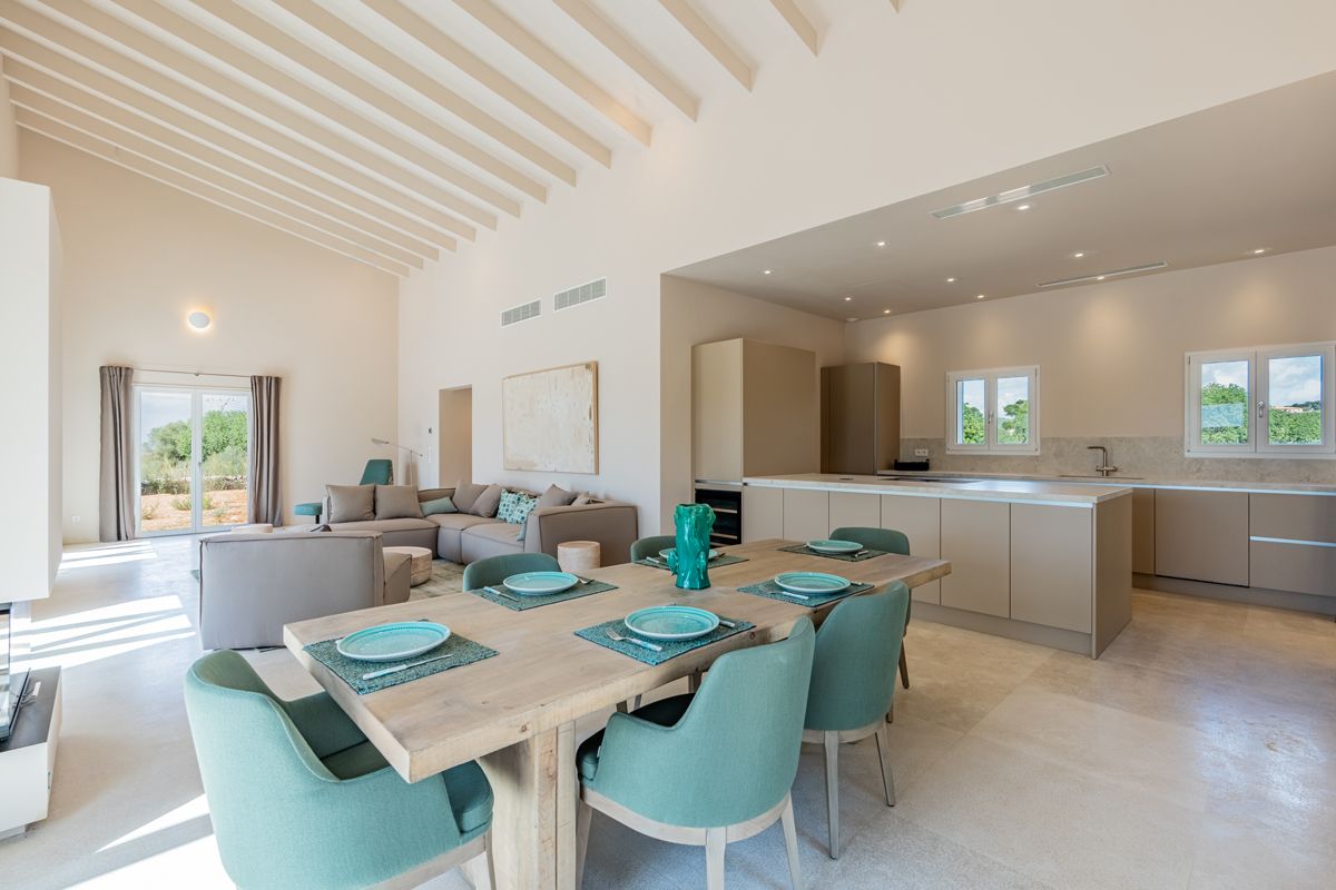 Diese moderne Finca aus dem Jahr 2025 befindet sich in ruhiger Lage nahe Felanitx. Sie wurde auf einer Ebene erbaut und verbindet minimalistisches Design mit dem Charme der mallorquinischen Landschaft. Das Herzstück der Immobilie ist ein großzügiger Wohnbereich mit hohen Decken und viel natürlichem Licht. Für gemütliche Abende im Winter lädt ein Kamin zum Verweilen ein. Die angrenzende Küche ist mit maßgefertigten Cuinart-Möbeln, einem BORA-Kochfeld sowie Einbaugeräten von Liebherr und Miele ausgestattet. Die Armaturen stammen von Grohe. Insgesamt stehen drei Schlafzimmer zur Verfügung, jeweils mit eigenem Bad. Eine weitere Fläche – derzeit als überdachte Terrasse mit Fußbodenheizung und separatem Bad angelegt – lässt sich bei Bedarf in ein viertes Schlafzimmer verwandeln. Eine Fußbodenheizung in Kombination mit Wärmepumpe sorgt für wohlige Wärme, während Klimaanlagen in den Sommermonaten für angenehme Frische sorgen. Die bereits installierte Alarmanlage lässt sich bequem per Handy aktivieren und ermöglicht den Zugriff auf die Außenkameras. Nachhaltigkeit spielt in diesem Zuhause eine zentrale Rolle: Das Regenwasser wird in zwei Zisternen mit je 20.000 Litern gesammelt, ein zusätzlicher Brunnen ist bereits beantragt. Die Internetverbindung erfolgt über Starlink und bietet selbst in ländlicher Lage eine stabile und schnelle Anbindung. Der Außenbereich lädt nicht nur zum Entspannen ein, sondern bietet neben einem 60 m² großen Pool auch einen traumhaften Panoramablick in die grüne Umgebung bis hin zum Sant Salvador.Der Garten darf – in Absprache mit der Gemeinde – nach der finalen Bauabnahme individuell gestaltet werden. So haben Sie hier Raum für Ideen und können einen Außenbereich entstehen lassen, der ganz auf Ihre Wünsche zugeschnitten ist – sei es mit mediterranen Pflanzen, schattigen Plätzen oder offenen Flächen zum Entspannen.