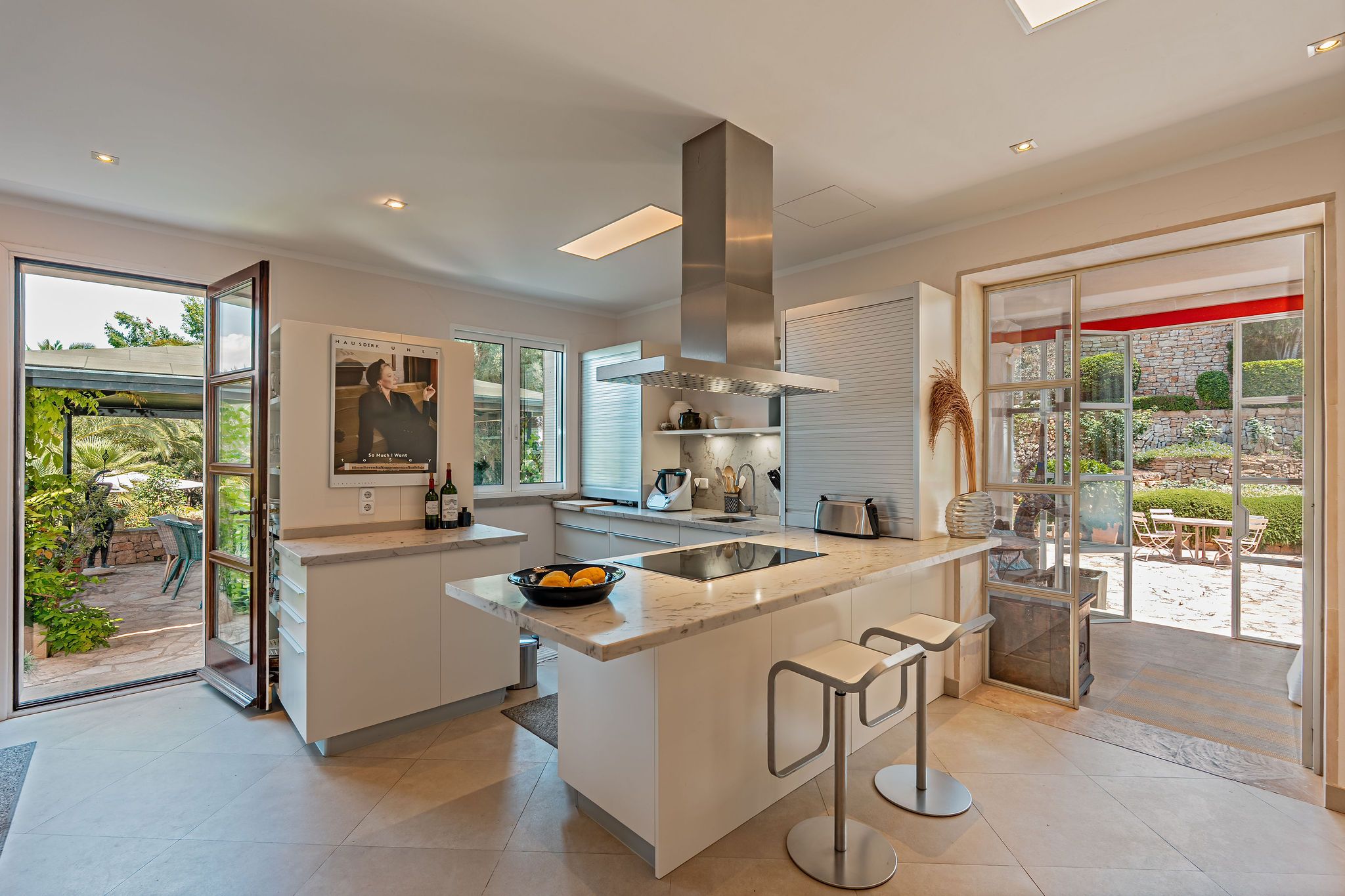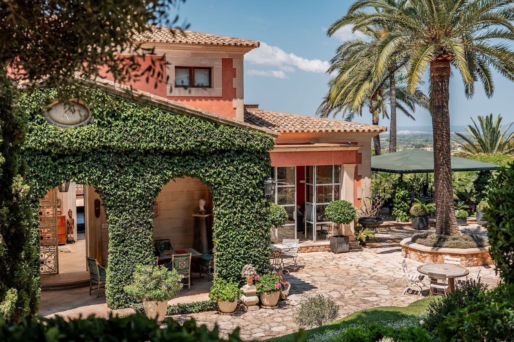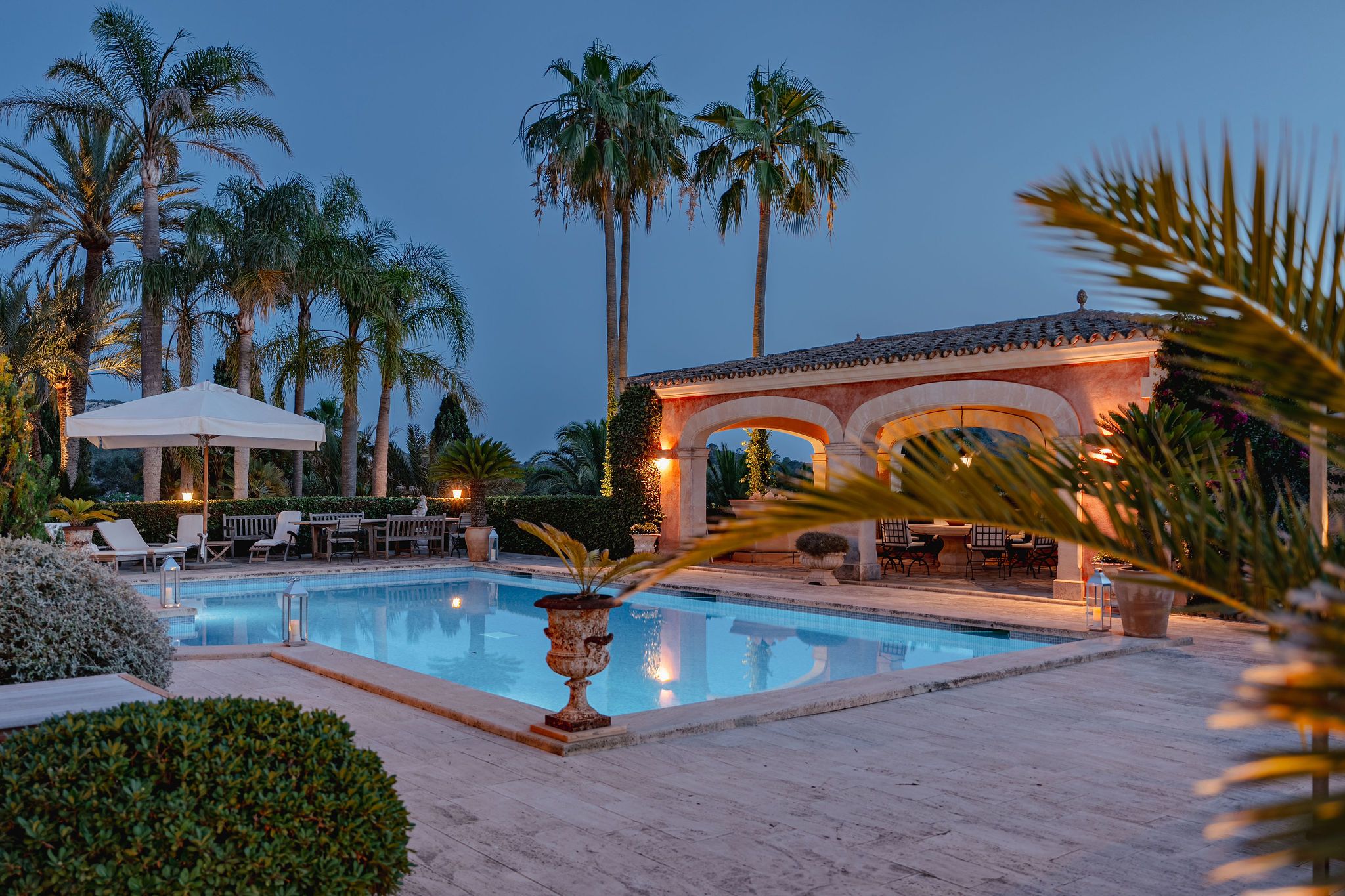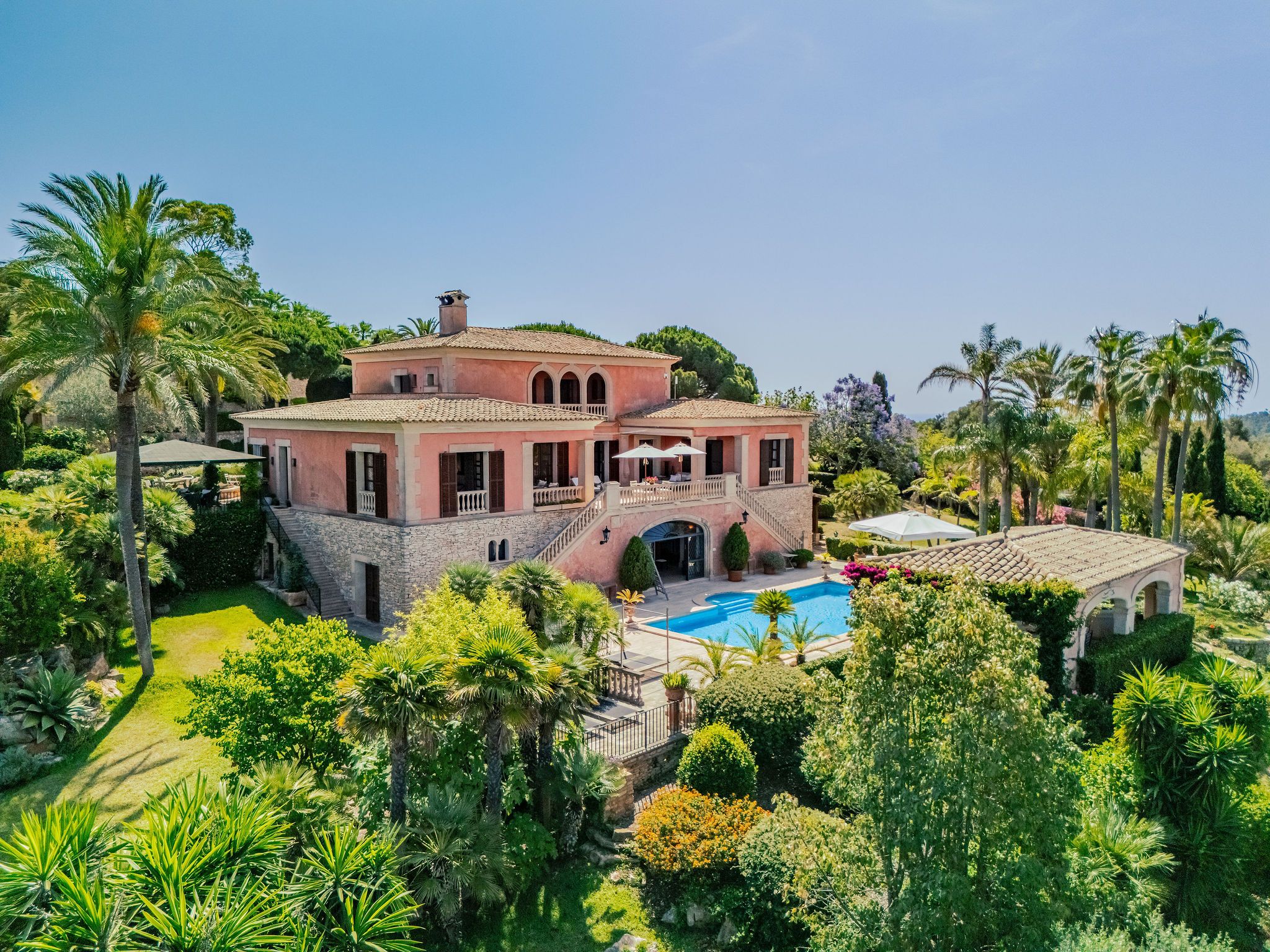 Eingebettet in die malerische Natur Mallorcas liegt dieses Anwesen rund 170 Meter über dem Meeresspiegel, in sanfter Hanglage mit Blick über die umliegende Landschaft. Es eröffnet überraschende Weitblicke nach Osten bis zum Meer; im Westen versinkt die Sonne über dem bekannten Naturstrand Es Trenc. Der liebevoll angelegte Park ist ein echtes Highlight dieses Anwesens. Mit unzähligen Palmen, einem 130 m² großen Teich und einer beeindruckenden Vielfalt an Pflanzen schafft er eine eindrucksvolle, mediterrane Atmosphäre. Immergrüne Zypressen, Palmen, schattenspendende Pinien und blühende Sträucher fügen sich harmonisch in das ca. 22.100 m² große Grundstück ein. Mit einer Gesamtfläche von ca. 1.500 m², verteilt auf das Haupthaus, zwei separate Gästehäuser sowie ein abseits gelegenes Personalhaus, bietet das Anwesen insgesamt 11 Schlafzimmer und 8 Bäder – genug Platz für große Familien & Gäste – bei gleichzeitiger Privatsphäre dank separat gelegener Gästebereiche. Das Haupthaus überzeugt durch eine geräumige und lichtdurchflutete Raumgestaltung. Man betritt das Haus über einen großzügigen, hellen Wintergarten. Von hier aus gelangen Sie in das Wohnzimmer mit einem imposanten Kamin und in den großen Essbereich, der ideal für gesellige Runden und Familienfeiern ist. Die angrenzende Küche ist funktional gestaltet und bietet ausreichend Platz zum Kochen und Arbeiten. Zudem verfügt die Küche über einen praktischen Kühlraum, der zusätzlichen Stauraum für Lebensmittel und Getränke bietet. Ein Schlafzimmer mit Bad en suite, einem Ankleideraum und einem hellen Homeoffice runden diese Etage ab. Im oberen Stockwerk befindet sich das großzügige Hauptschlafzimmer mit eigenem Bad en suite, einem Ankleidezimmer und einem zweiten, kleineren Raum. Von hier aus gelangen Sie direkt auf den Balkon, von dem aus Sie einen spektakulären Blick über das Anwesen und die weitläufige Umgebung genießen können. Im unteren Geschoss befinden sich zwei weitere Schlafzimmer mit Bad en suite, ein weiterer multifunktionaler Raum, eine klimatisierte Bodega sowie ein gemütliches Sommerwohnzimmer mit einer eigenen Küche und Bar, die direkt an den 15 × 7 m großen, beheizbaren Pool angrenzt und zum entspannten Verweilen einlädt. Neben dem Poolbereich befindet sich ein überdachter BBQ-Bereich mit Sitzmöglichkeiten – perfekt für gesellige Stunden im Freien. Wellness-Fans finden eine private Sauna; zudem steht ein großzügiges Natursteingebäude bereit, das sich ideal für kreative Aktivitäten wie etwa ein Atelier eignet. Draußen ermöglicht der Gemüsegarten den Anbau von eigenem Gemüse und Kräutern. Neben dem Turm aus Naturstein befindet sich eine Garage, die teilweise zu einer Werkstatt umgebaut wurde und weiteres Ausbaupotenzial bietet, während zwei PKW-Unterstellplätze zusätzlichen Komfort gewährleisten. Ein besonderes Highlight ist der spektakuläre Lounge-Platz. Von hier aus können Sie einen atemberaubenden Panoramablick über die Ostküste, Cala d’Or, Portopetro und das glitzernde Meer genießen – ein perfekter Ort zum Entspannen und Träumen. Trotz der idyllischen Lage und maximaler Privatsphäre erreichen Sie das beliebte Dorf Cas Concos mit seinen zahlreichen Restaurants in nur fünf Autominuten. Santanyí liegt 15 Minuten entfernt, der Hafen von Portopetro nur zehn Minuten. Die malerischen Buchten im Südosten mit ihren wunderschönen Stränden sind in nur zwölf Autominuten erreichbar, der Flughafen in 48 Kilometern Entfernung. Dieses Anwesen ist eine einmalige Gelegenheit für Liebhaber exklusiven Wohnens inmitten mediterraner Schönheit – ein Refugium, das keine Wünsche offenlässt.
