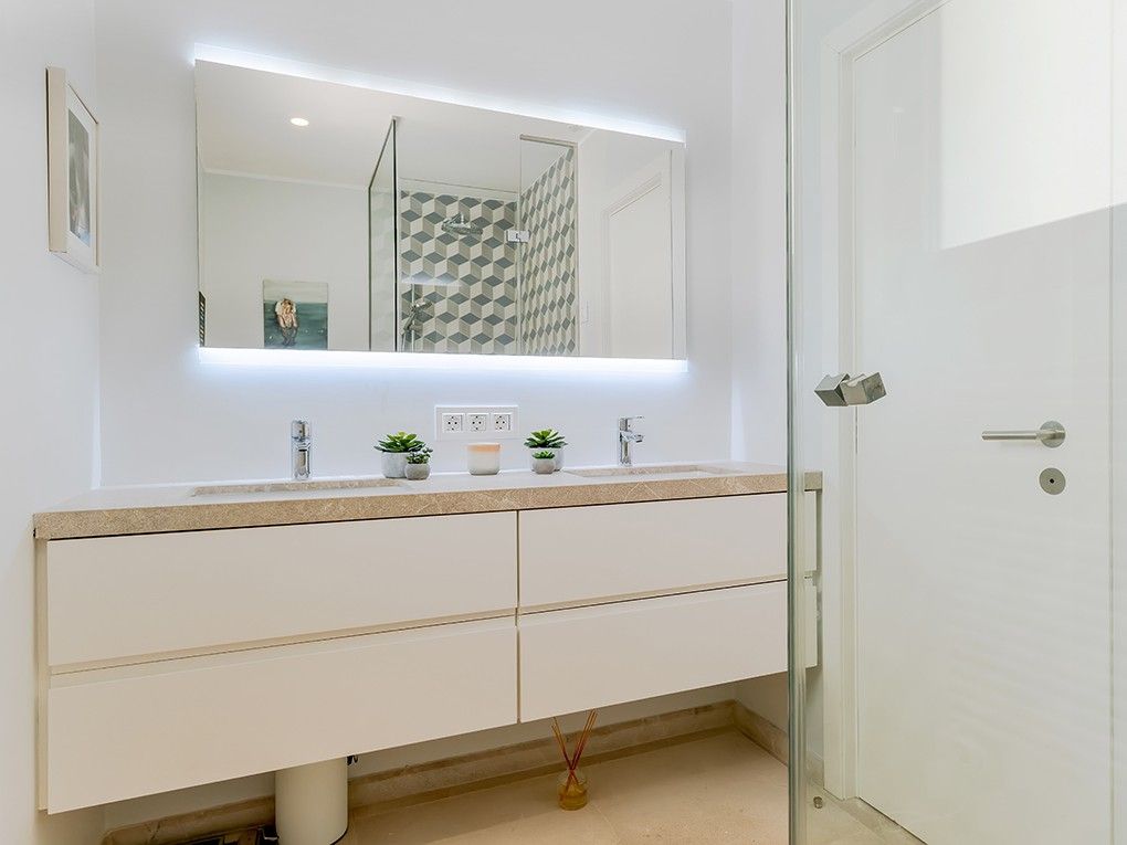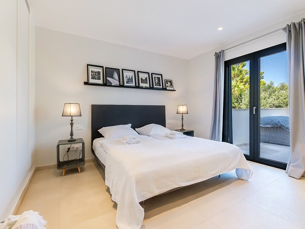 Diese großzugige, exklusive Villa mit dem Hauptwohnbereich auf nur einer Ebene befindet sich auf einem von Bäumen gesäumten Grundstück in einer der begehrtesten Villenwohnlagen des Südwestens der Insel. In der oberen Etage gibt es fünf Schlafzimmer, drei Bäder und einem Wirtschaftsraum sowie eine überdachte Terrasse. Ein Treppenzugang führt zur Poolebene. In der unteren Ebene befindet sich ein großer Gästebereich mit einem Esstisch für 12 Personen und gemütlicher Loungebereich. Der Außenbereich verfügt über einen Garten mit gepflegten Rasenflächen und eine Sonnenterrasse mit integriertem Swimmingpool und Außendusche. Nur wenige Autominuten von Ortskern, zwei Yachthäfen und mehreren Stränden entfernt und mit einer perfekten Anbindung an Palma und den Flughafen bietet die Lage viel Ruhe und Privatsphäre inmitten einer grünen Umgebung. Ein hochwertiger Grill der Firma „Weber“ und vier Elektrobikes, sowie ein Aussentrampolin runden den perfekten Aufenthalt ab.