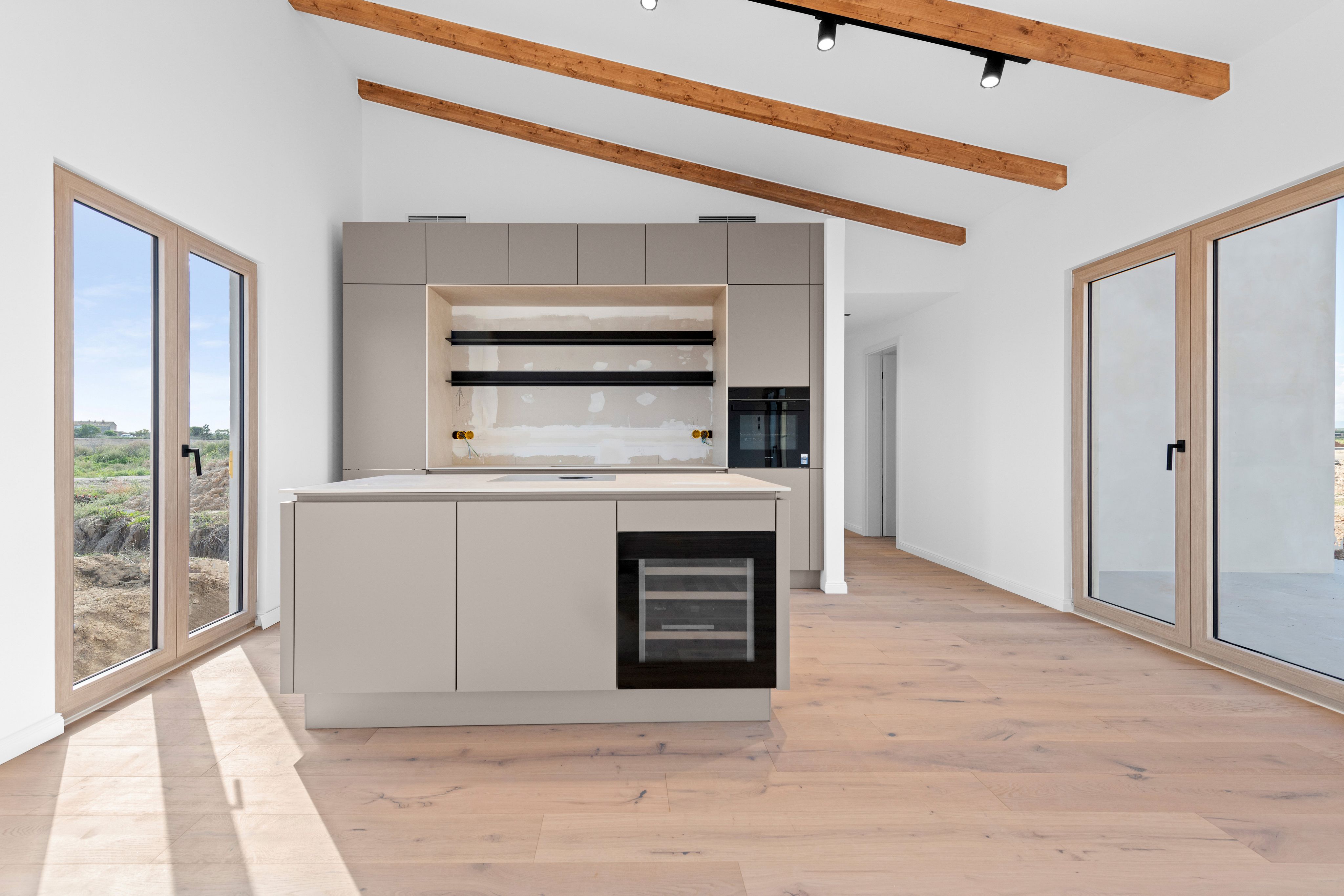 Die eingeschossige Villa besticht durch ihr elegantes Design und eine moderne Architektur mit mediterranen Akzenten. Natursteinfassaden verschmelzen harmonisch mit klaren, zeitgemäßen Linien. Die U-förmige Bauweise schafft einen geschützten, äußerst privaten Außenbereich – perfekt, um die Umgebung in vollen Zügen zu genießen.