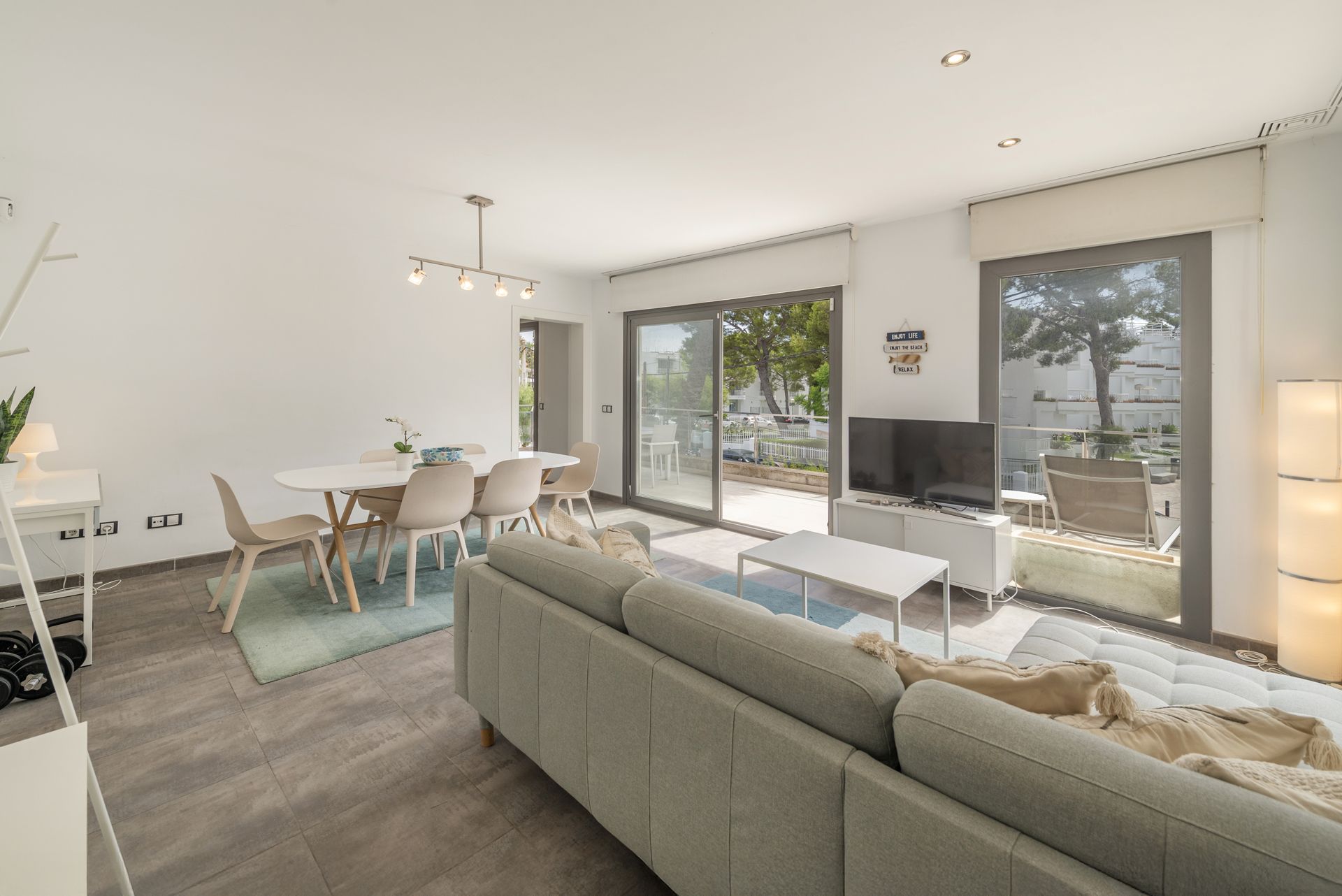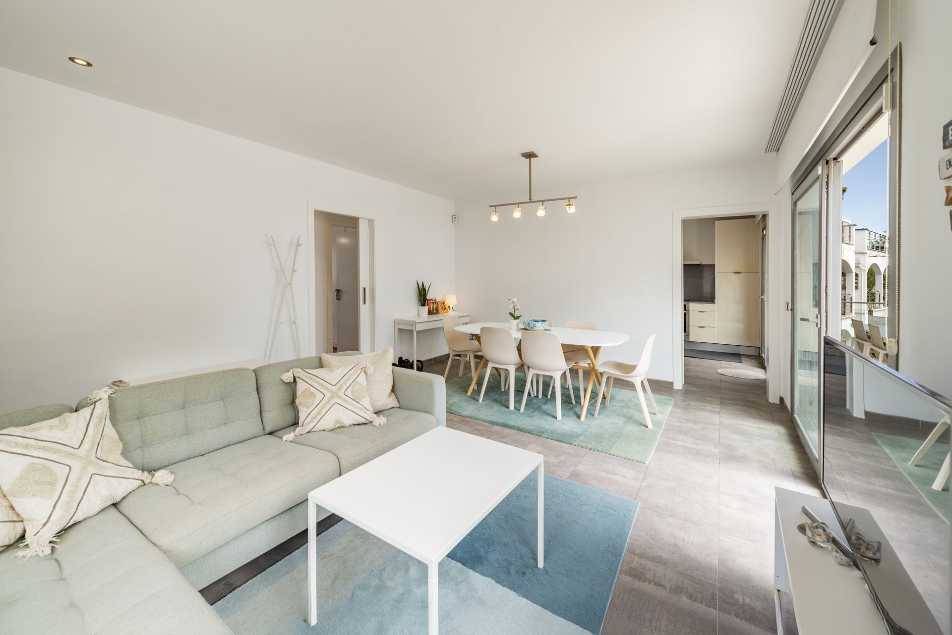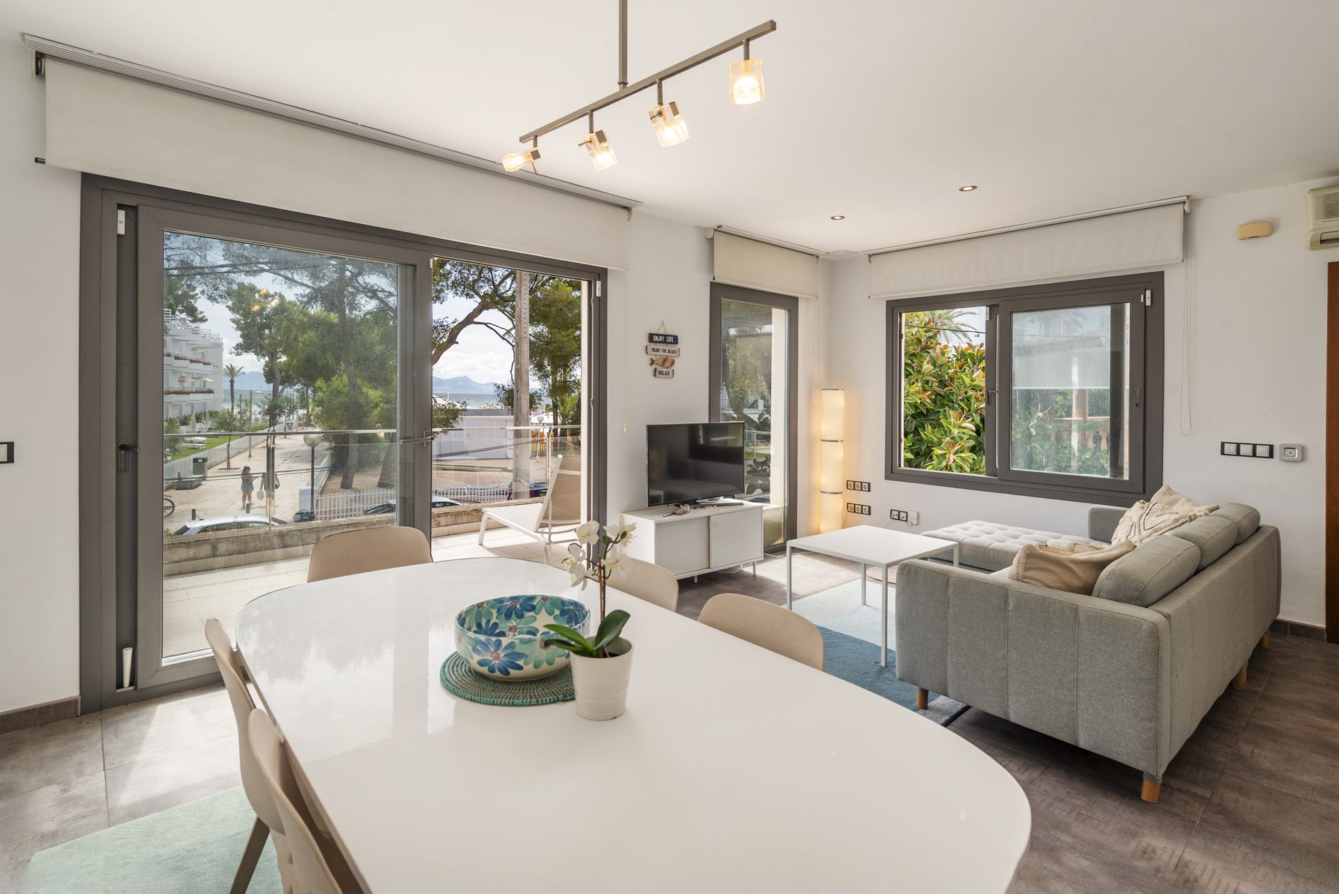 Diese lichtdurchflutete Wohnung befindet sich in bester Lage im begehrten Gebiet von Puerto de Alcudia, nur wenige Schritte von den weißen Sandstränden entfernt. Die hellen Wohn- und Essbereiche führen nahtlos auf eine private, sonnige Terrasse mit Meerblick – der ideale Ort für Mahlzeiten im Freien. Die Küche bietet ebenfalls direkten Zugang zur Terrasse und unterstreicht das angenehme Wohngefühl zwischen Innen- und Außenbereich.