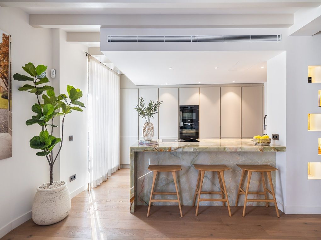 Auf 230m2 bietet diese exklusive Immobilie alles, was Sie sich von Ihrem Palma-Domizil wünschen! Der offene Wohnbereich verschmilzt harmonisch mit der modernen Küche, deren Kochinsel aus edlem Onyx-Marmor zum Mittelpunkt des Geschehens wird. Hochwertige Einbaumöbel und Geräte erfüllen höchste Ansprüche; zusätzlich sorgt eine integrierte Osmoseanlage für frisches Trinkwasser. Der angrenzender Wintergarten kann durch eine stilvolle Glaswand abgetrennt werden und bietet eine vielseitige Nutzungsmögichkeit. Die drei großzügig gestalteten Schlafzimmer im italienischen Design verfügen alle über ein Badezimmer "en-suite" und bieten luxuriösen Komfort mit durchdachter Funktionalität. Die komplette Wohnung ist mit hochwertigem Parkettboden und Natursteinböden ausgestattet was den Räumen eine angenehme, zeitlose Atmosphäre verleiht. Ein separater Hauswirtschaftsraum und das Gäste-WC sorgen für zusätzliche Annehmlichkeiten im Alltag. Für ein behagliches Wohnklima sorgen die zentrale Klimaanlage, die Fußbodenheizung, sowie die doppelt verglasten Fenster.