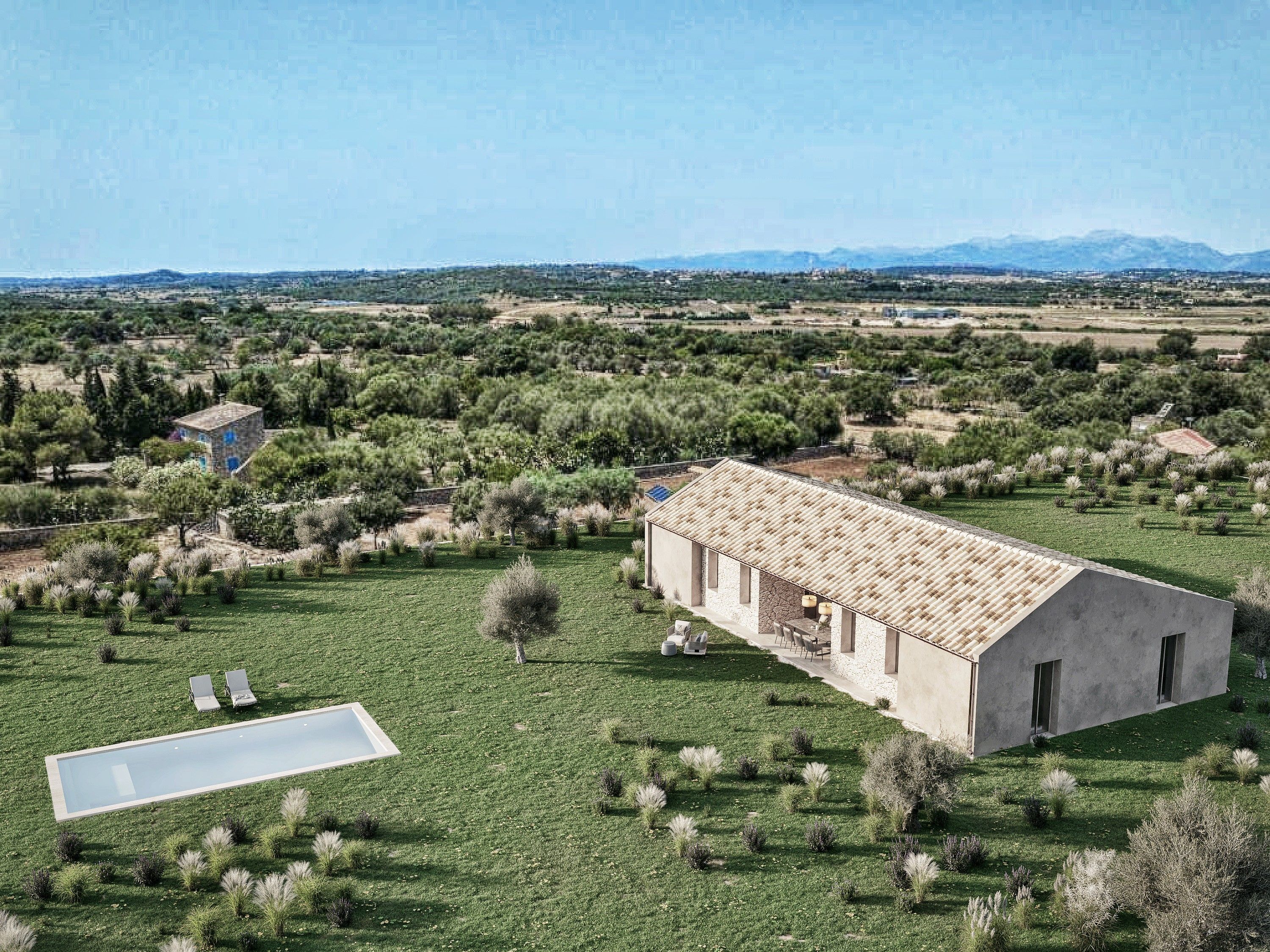 Das Grundstück liegt in einem kleinen Tal und hat eine Gesamtfläche von 15.048 m2. Es verspricht eine herrlich grüne Umgebung mit Blick zum Tramuntana Gebirge. Besonders hervorzuheben ist die ruhige und friedliche Lage, es gibt keine großen Straßen, absolut kein Flugverkehr und auch keine unschönen Strommasten. Das Haus ist auf einer Ebene mit 210 m2, drei Schlafzimmern, zwei Badezimmern und einem Swimmingpool geplant. Auf dem Grundstück befindet sich auch ein kleines bestehendes Haus, welches sich ideal eignet, als Gästehaus auszubauen. Die Versorgung ist autark durch Photovoltaik. Es befindet sich ein Wasserbrunnen auf dem Grundstück. Die Baulizenz wurde im Juli 2024 ausgestellt und man kann direkt anfangen zu bauen.
