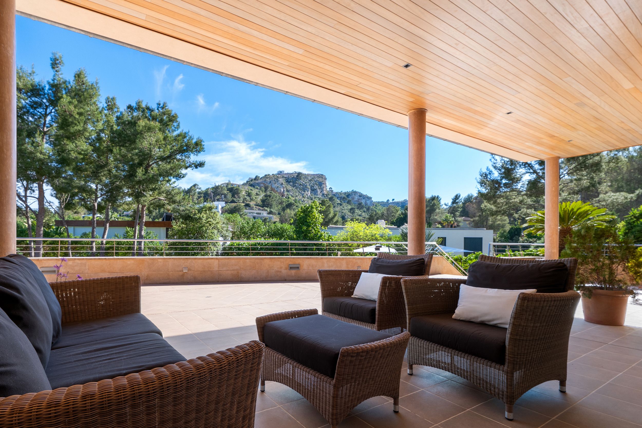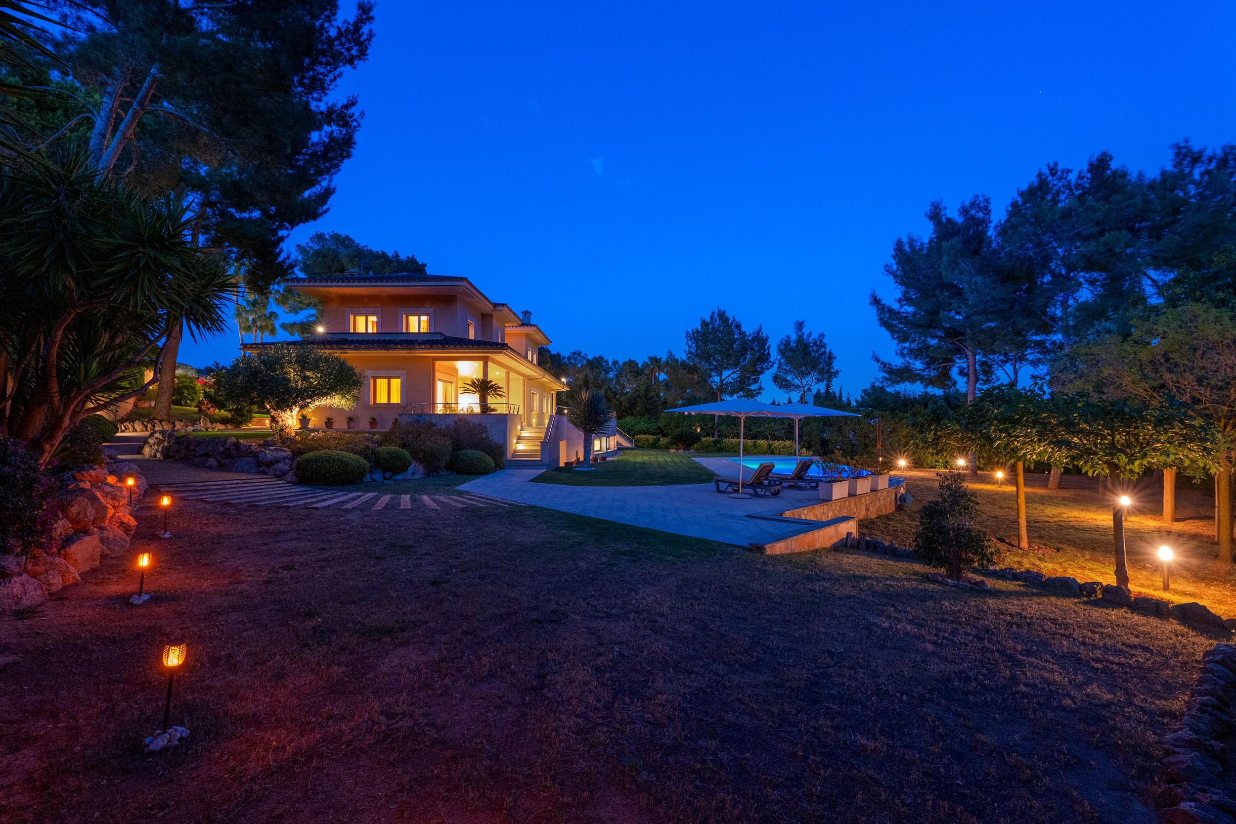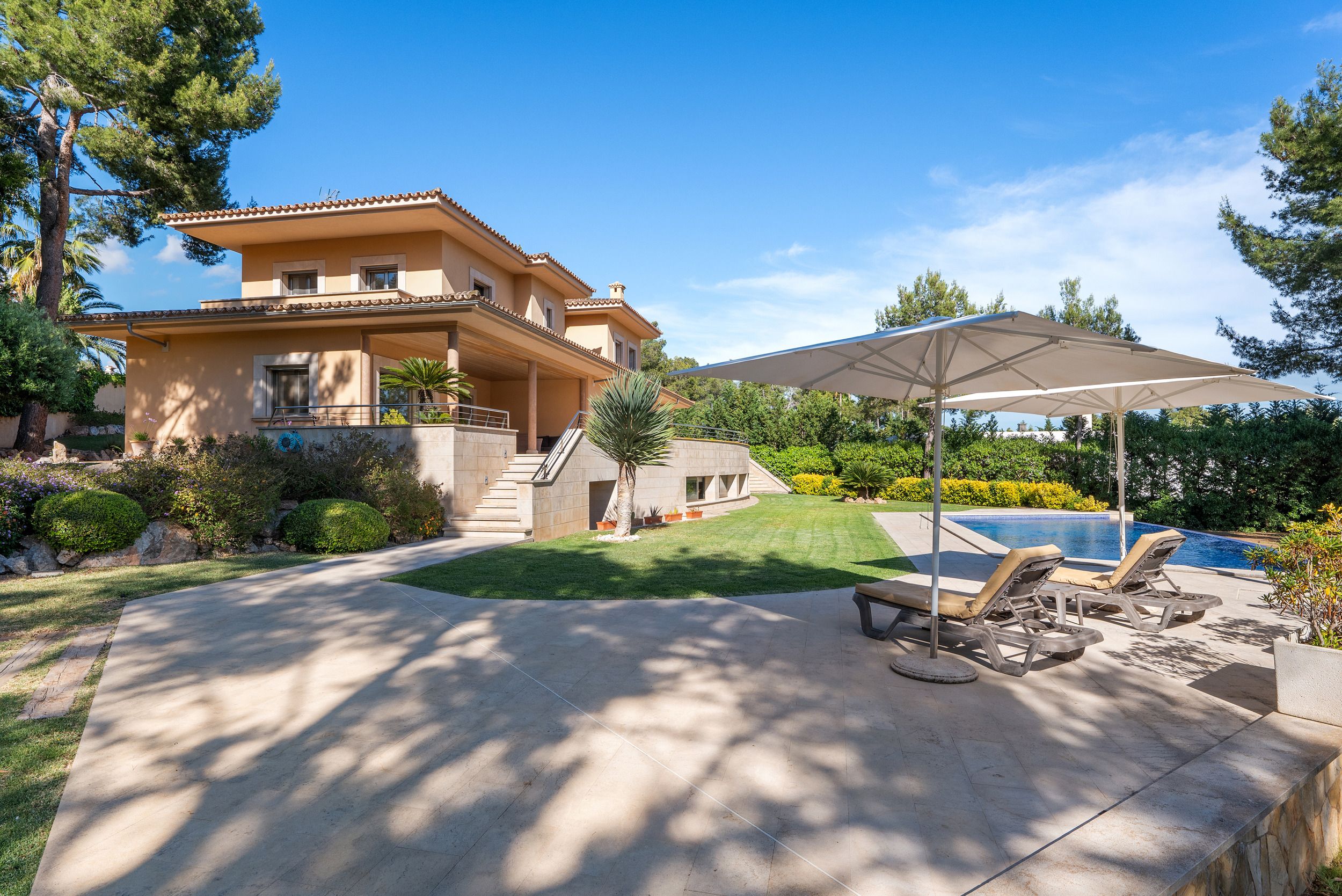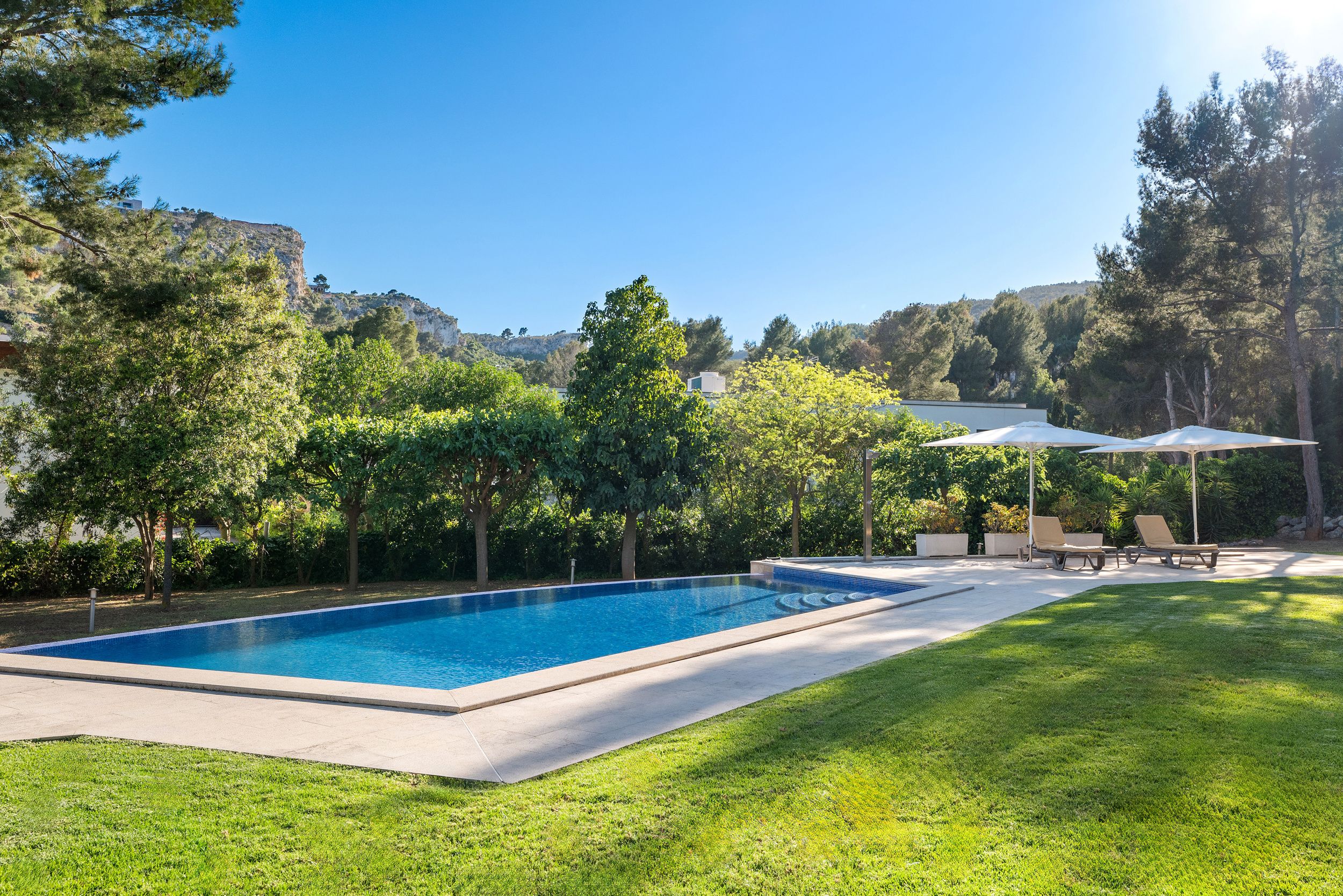 Der Außenbereich begeistert mit einem spektakulären Pool, weitläufigen Sonnenterrassen und sorgfältig angelegten Gärten, die ganztägige Sonne und absolute Privatsphäre garantieren.