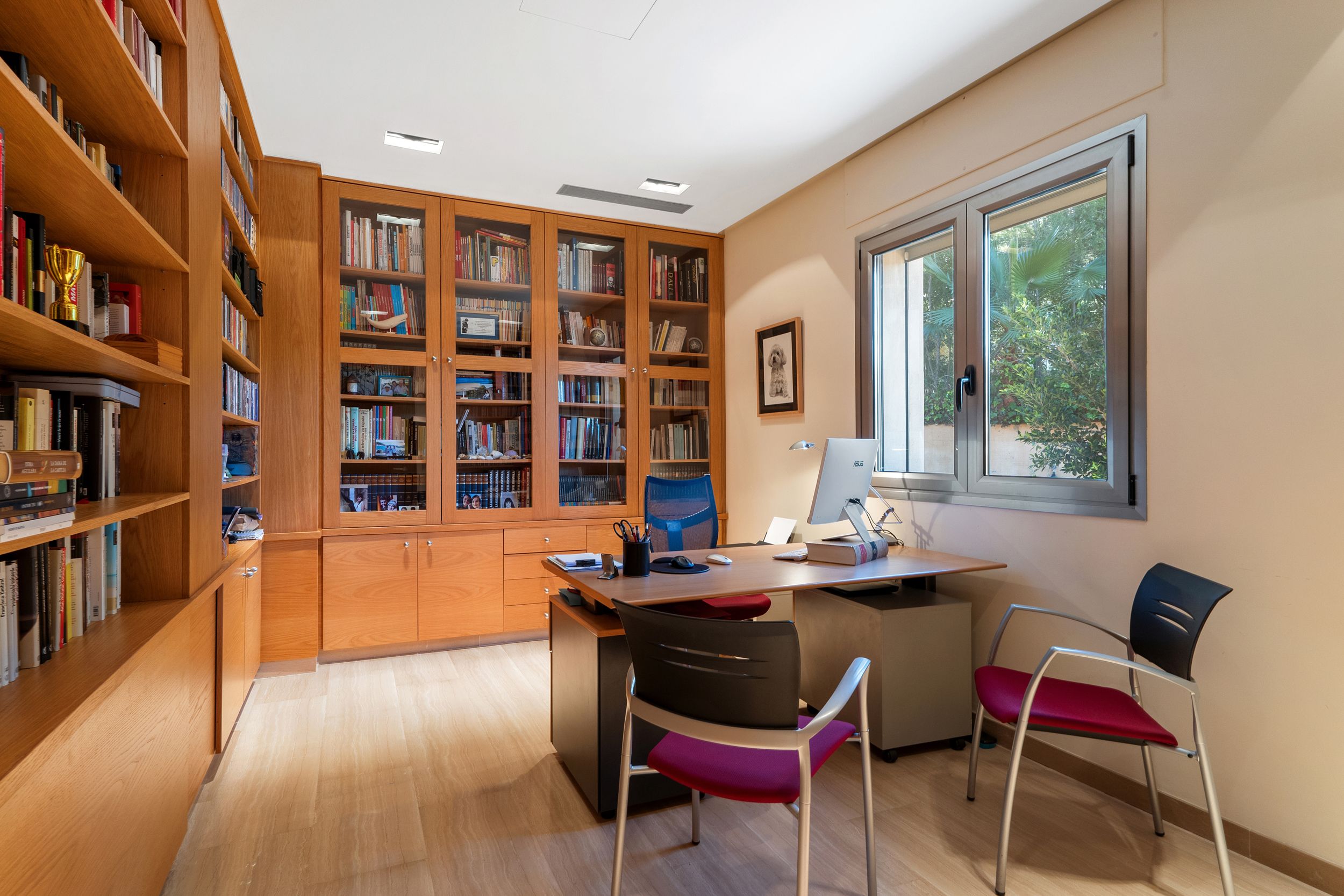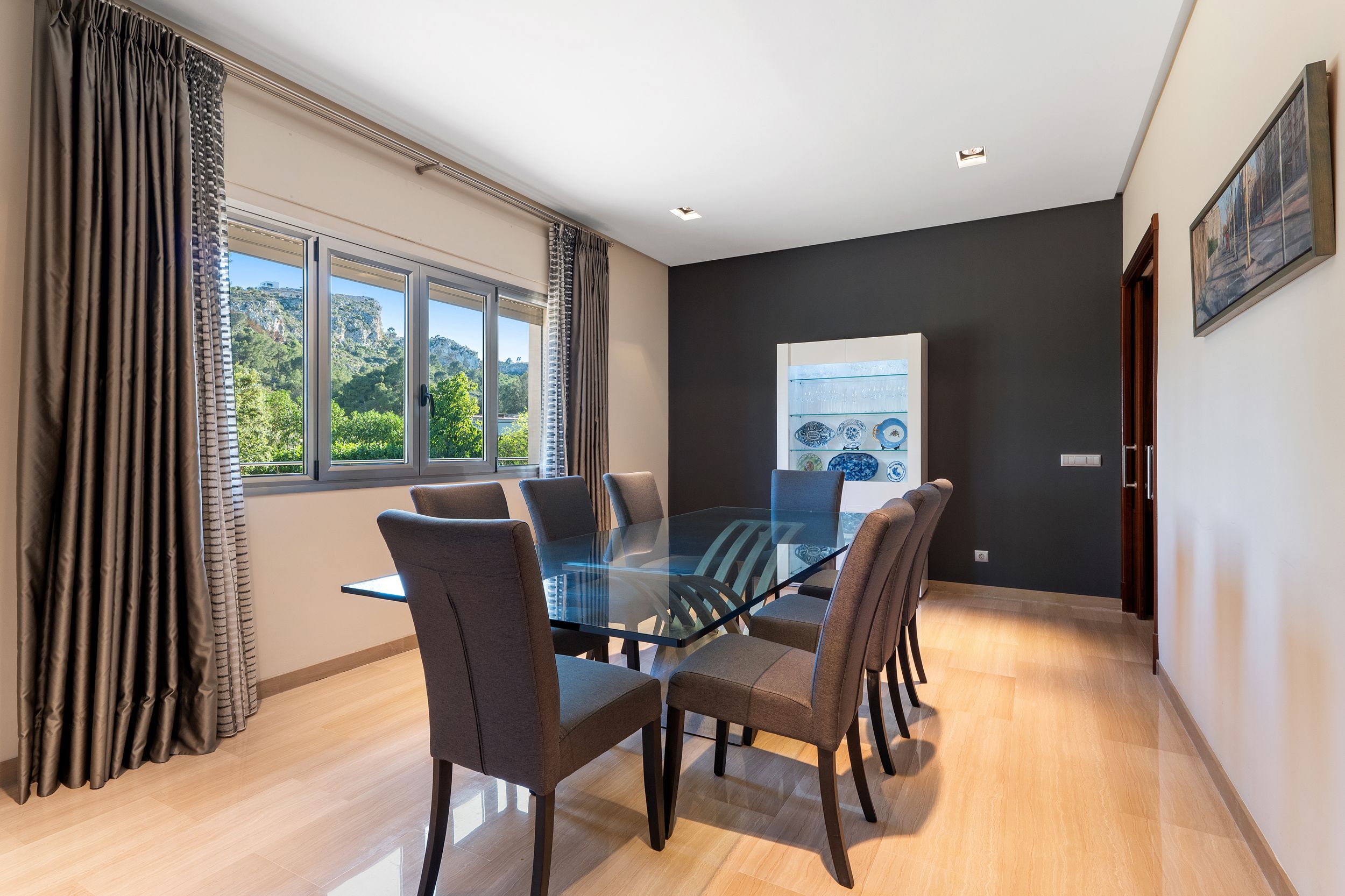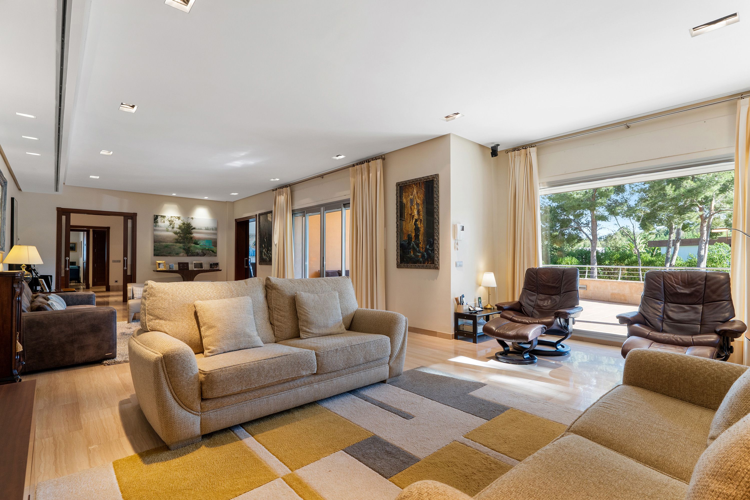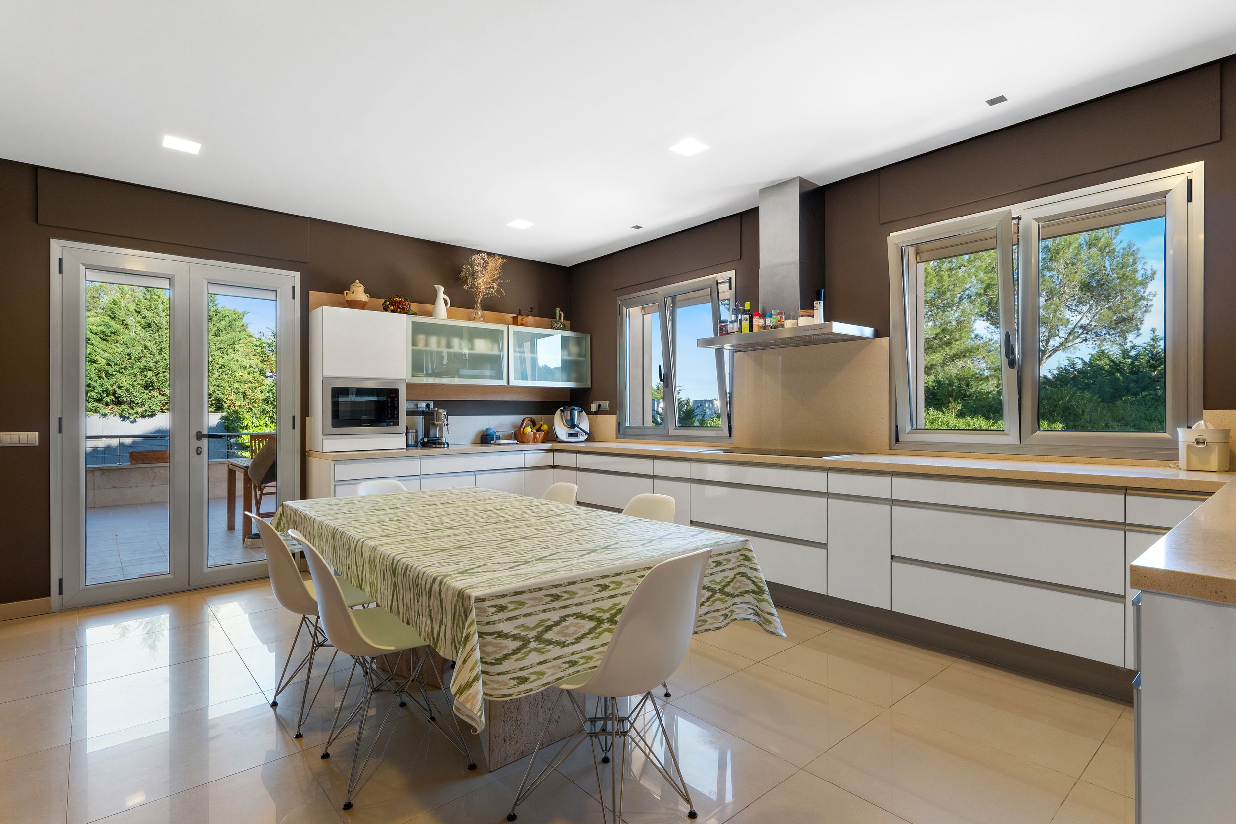 Im Erdgeschoss erwartet Sie ein lichtdurchflutetes Wohnzimmer mit direktem Zugang zur Terrasse und zum Poolbereich, ein separates Esszimmer sowie eine voll ausgestattete, großzügige Küche mit Zugang zu einer privaten Terrasse. Ein Schlafzimmer mit eigenem Bad, ein Gäste-WC sowie ein vielseitig nutzbares Büro, das sich ideal als fünftes Schlafzimmer eignet, runden das Raumangebot auf dieser Ebene ab.