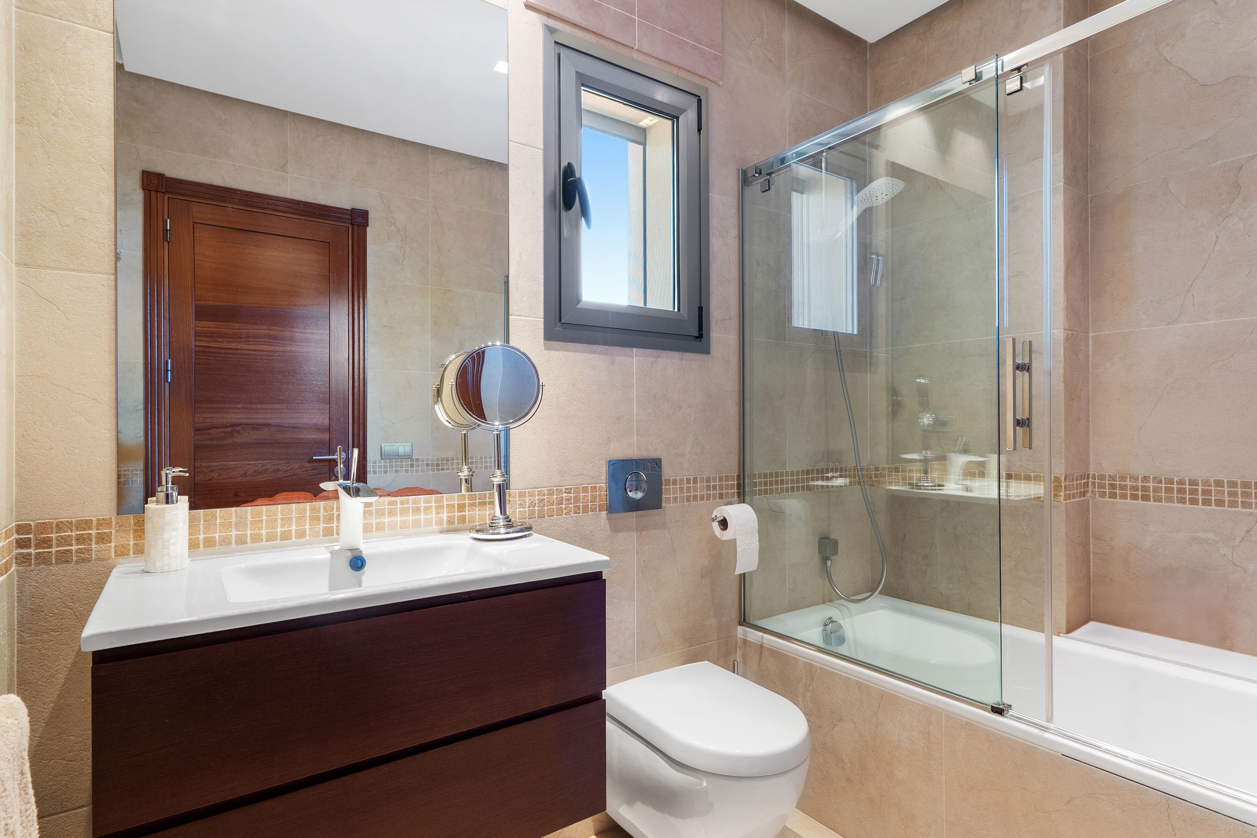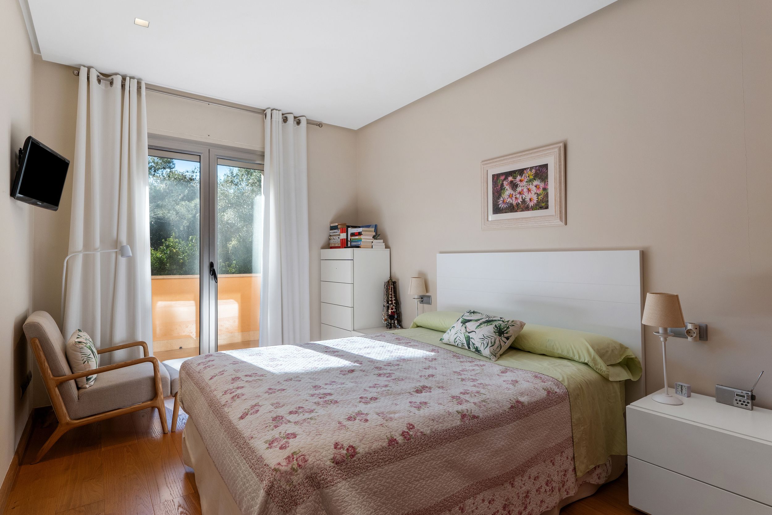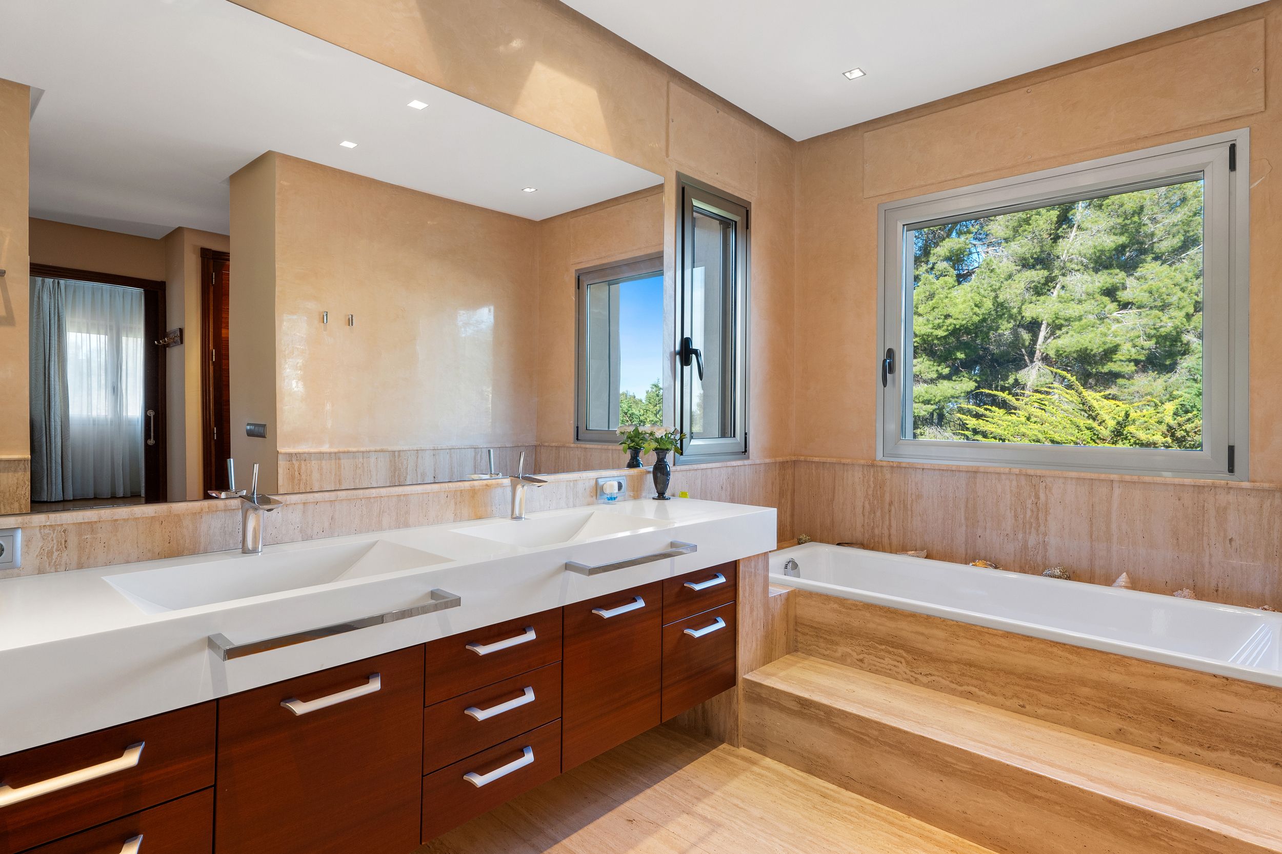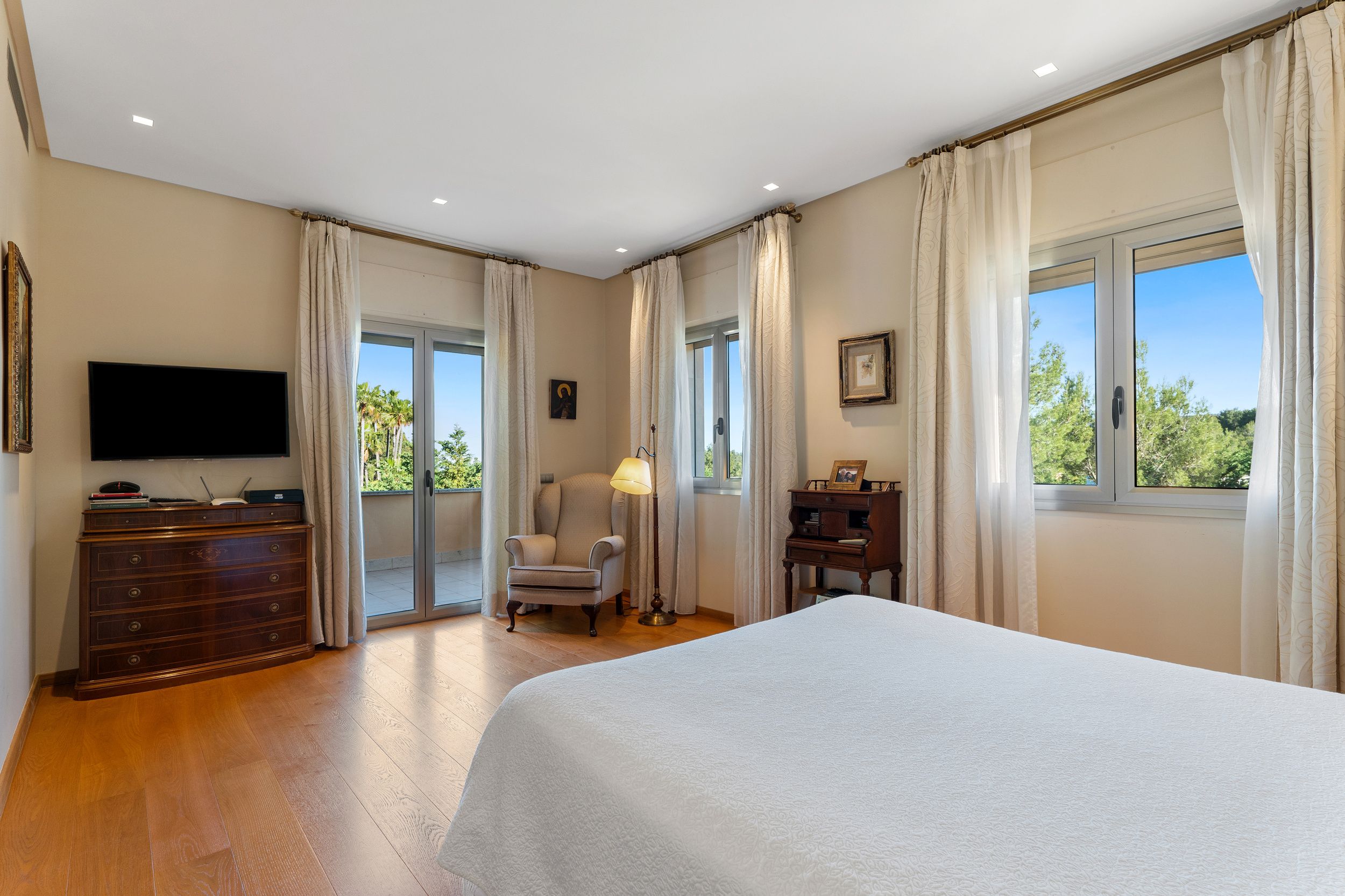 Im Obergeschoss befinden sich drei großzügige Schlafzimmer. Die elegante Mastersuite verfügt über einen begehbaren Kleiderschrank, ein Bad en Suite und direkten Zugang zu einer privaten Terrasse. Die beiden Gästezimmer sind mit eigenen Badezimmern sowie einem privaten Balkon ausgestattet.