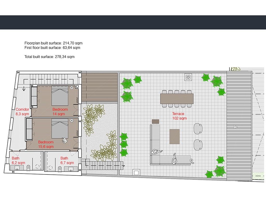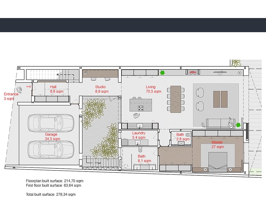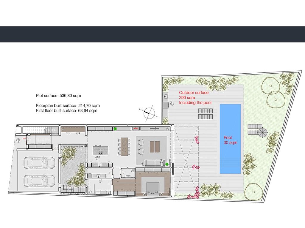 Typ: Haus • Region: Son Vida & Palma Umgebung • Baujahr: 2024 • Gesamtfläche: 278 ㎡ • Schlafzimmer: 3 • Badezimmer: 3 • Grundstück: 537 ㎡ • Stellplätze: 2 • Terrasse • Einbauküche • Pool • Gäste WC • Heizungsart: Fußbodenheizung, Zentrale Klimaanlage • Heizungsart: Wärmepumpe • Bodenbelag: Parkett, Stein