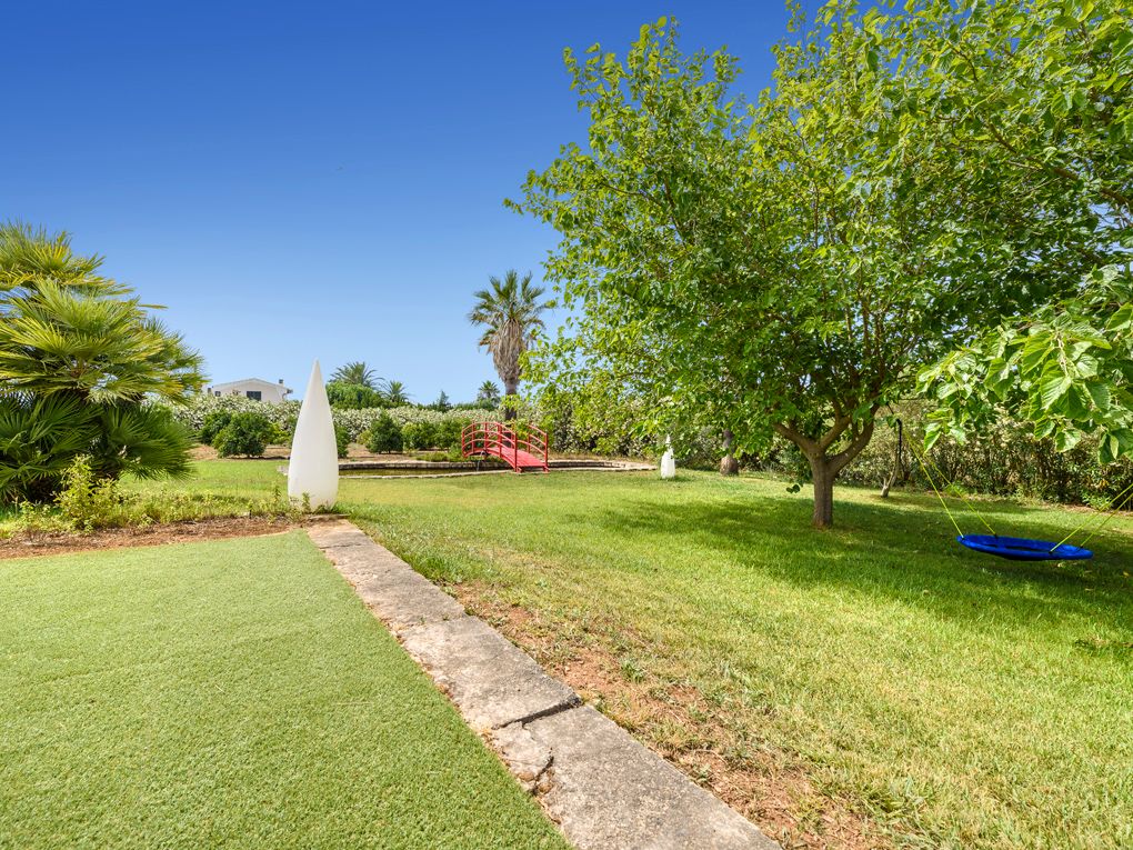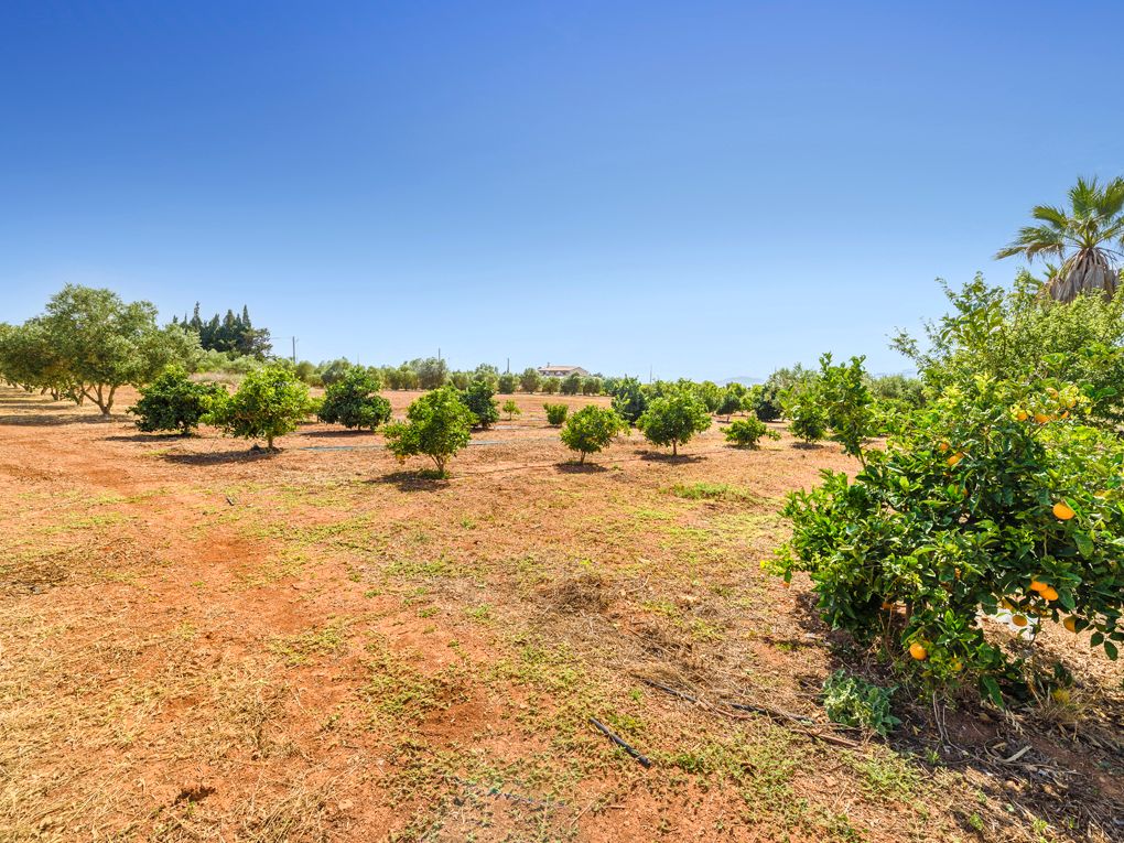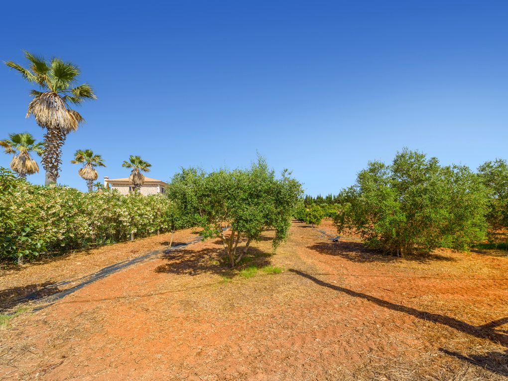 Insgesamt sind es drei Grundstücke, die zu dieser Immobilie gehören. Das Grundstück auf dem das Gebäude steht, misst ca. 18.000m2 und bietet gepflegte Rasenflächen, einen großen überdachten Pool, einen Teich mit einer Brücke im Japanischen Stile, so wie eine große Garage und Abstellraum. Dazu gehören ca. 800 Orangenbäume und weitere Obst- und Olivenbäume. Wasser ist über die insgesamt vier Brunnen reichlich vorhanden.
