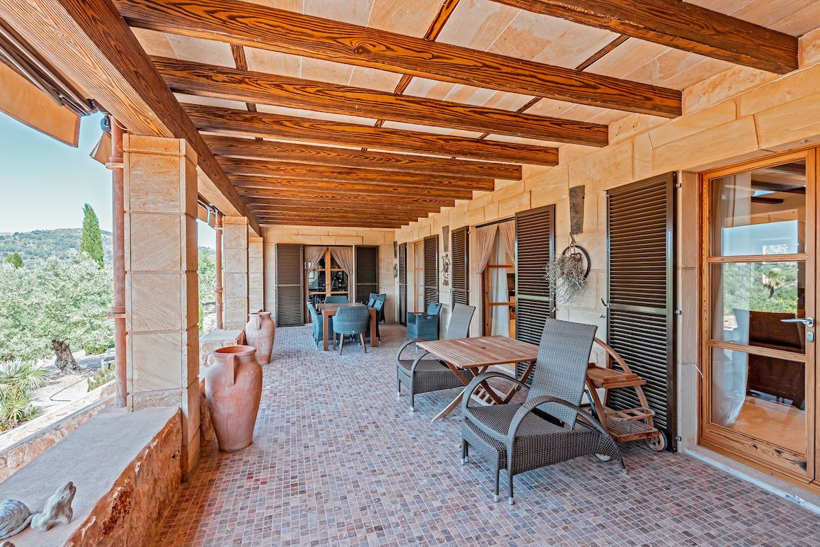 Das schöne Wort „Lebensgefühl“ kommt einem in den Sinn, wenn man über den gewundenen Weg auf das Landhaus zufährt: Vor dem Entrée findet sich eine freie, zentrische Fläche, die von den Bauherren lächelnd „unser Hubschrauberlandeplatz“ genannt wird. Und mit dem gleichen Sinn für Humor, schöne Dinge und das Leben an sich geht es auch weiter durch eine schwere Tür aus massivem Edelholz in die großzügige, gleichzeitig einladende Halle des Hauses, das man mit gutem Gewissen ein kleines Schloss nennen kann. In Frankreich wäre es wohl ein Chateau du Coeur, ein Schloss des Herzens … Hinter jeder Materialentscheidung beim Bau 2011/2012 steht die Freude, diese Materialien auch zu benutzen – jeden Tag. Seien es die beleuchteten Einbauschränke aus hochwertigem, altem Pinienholz, der edle Marés-Stein oder der Marmor im Bad, die in die Wände und Decken eingelassene indirekte (und dimmbare) Beleuchtung oder auch die Dachbalken der Veranda, die raffiniert wie Holz aussehen und doch nie verrotten: Hier ist alles durchdacht und mit Qualität gemacht. Übrigens waren hier ausschließlich lokale mallorquinische Firmen am Werk. Vier Doppelschlafzimmer hat das Haus, jedes mit einem eigenen Bad, von denen jeweils ein Fenster mit Fliegengitter davor gekippt werden kann. Alle Schlafräume haben Fernsehanschlüsse und verfügen über eine Vor-Installation für eine zentrale Klimaanlage. In einem der Schlafzimmer gibt es einen Tresor der Marke Fichet Bauche. Der Wohnkeller, der als klassisches Souterrain noch immer Tageslicht bekommt, enthält neben der Garage (mit direktem Zugang zum Haus) außerdem einen Weinkühlschrank, der die Augen jedes Weinliebhabers leuchten lässt. Er ist die konsequente Ergänzung zu der großen Wohnküche im Landhausstil, die sich zur überdachten Bankett-Veranda öffnet, von wo man mit wenigen Stufen in den Garten und zum Salzwasser-Pool mit Außendusche kommt. Ein herrliches Setting für kulinarische Abende, Gastgeberkultur und gemeinsame Zeit mit Familie und Freunden. Die Fußbodenheizung wird von einer Öl-Zentralheizung befeuert, Solarpaneele versorgen mit Warmwasser. Ein eigener, genehmigter Brunnen beliefert über drei Zisternen Garten, Haus und eine Wasser-Reserve, wobei das Wasser für das Haus gefiltert und entkalkt wird. Die Geräte für die Pool-Elektrolyse sind neu! Und der Strom kommt von der Stadt Artà, auf die man von der oberen Terrasse auch blicken kann.