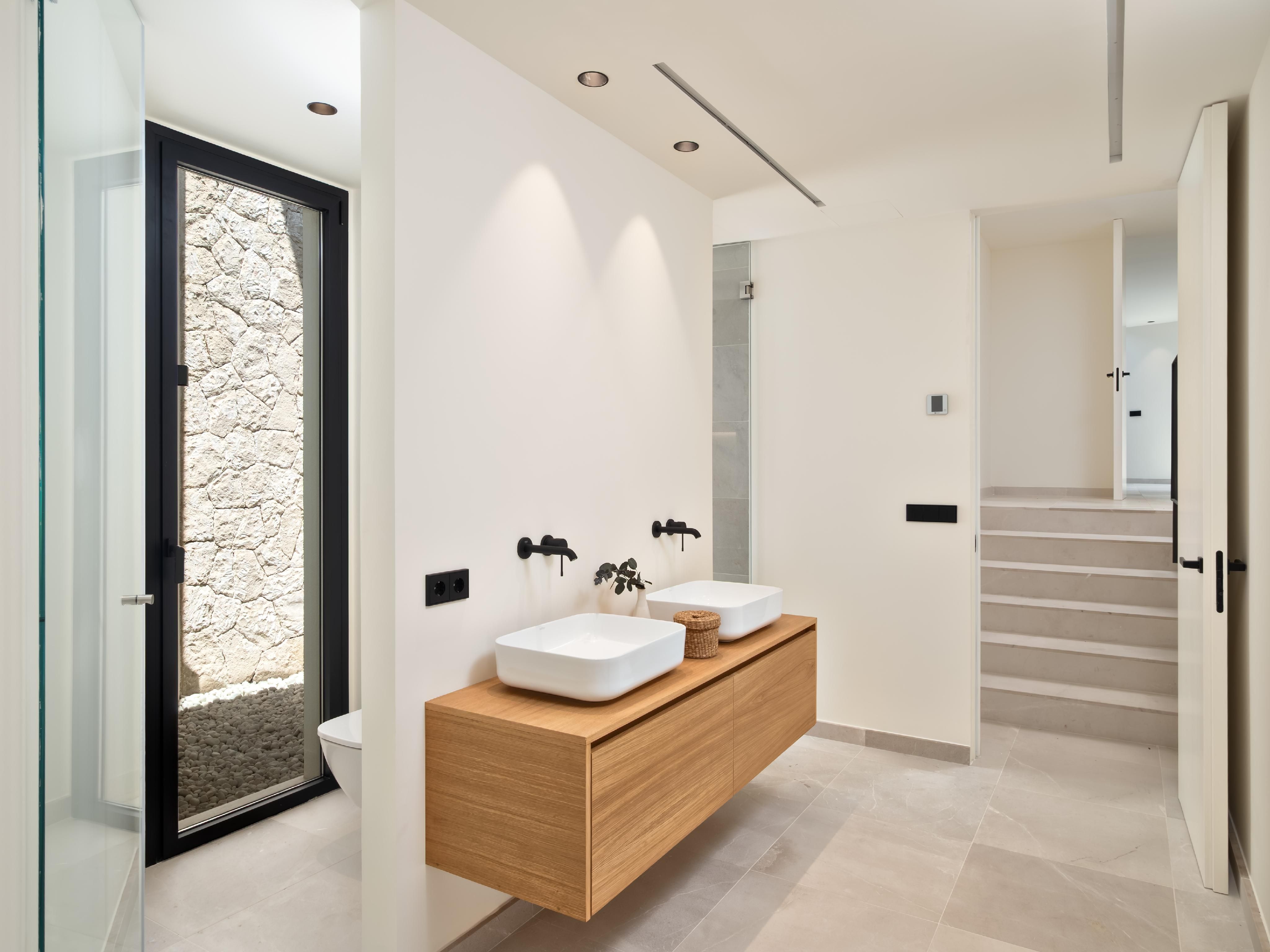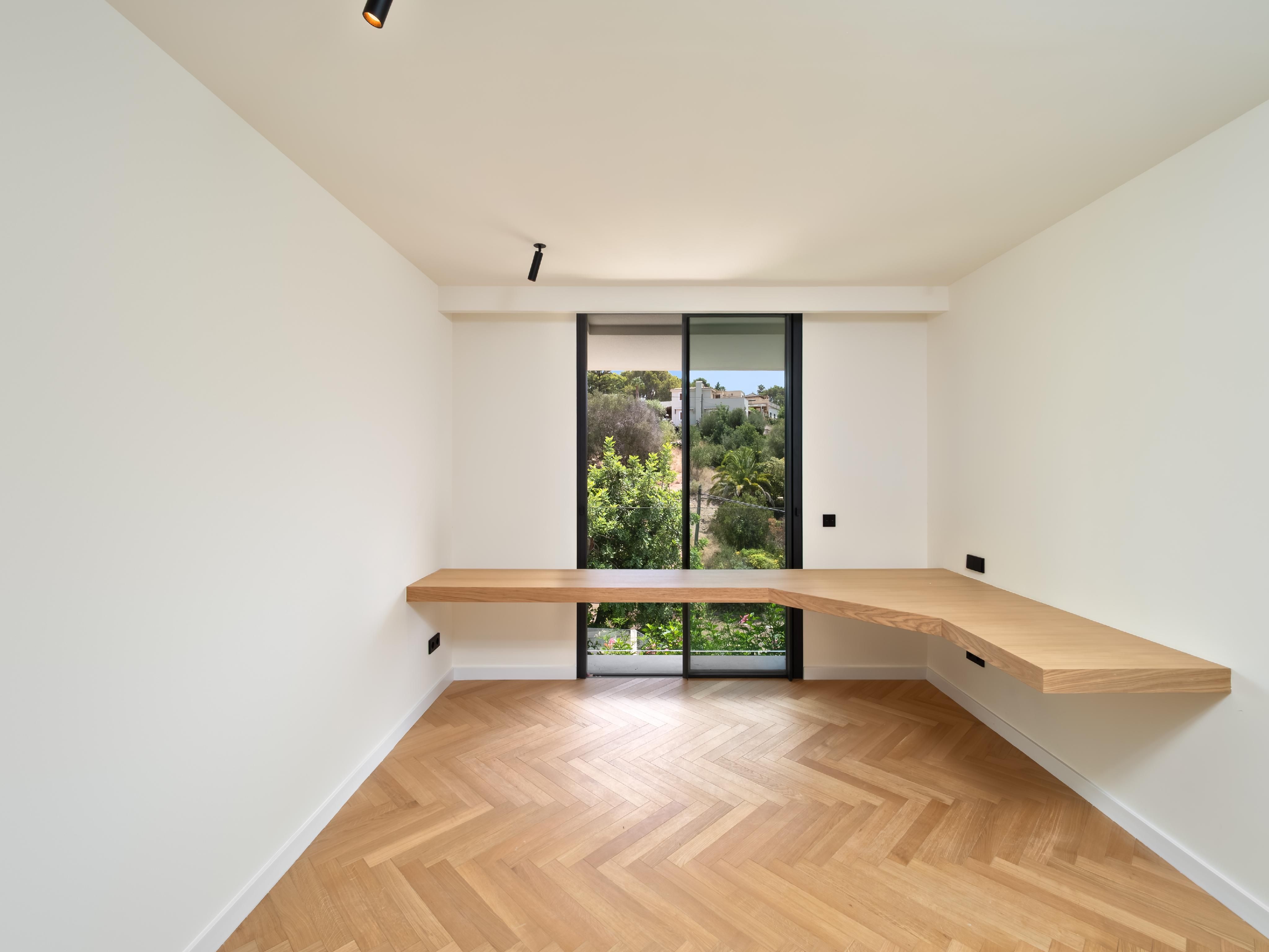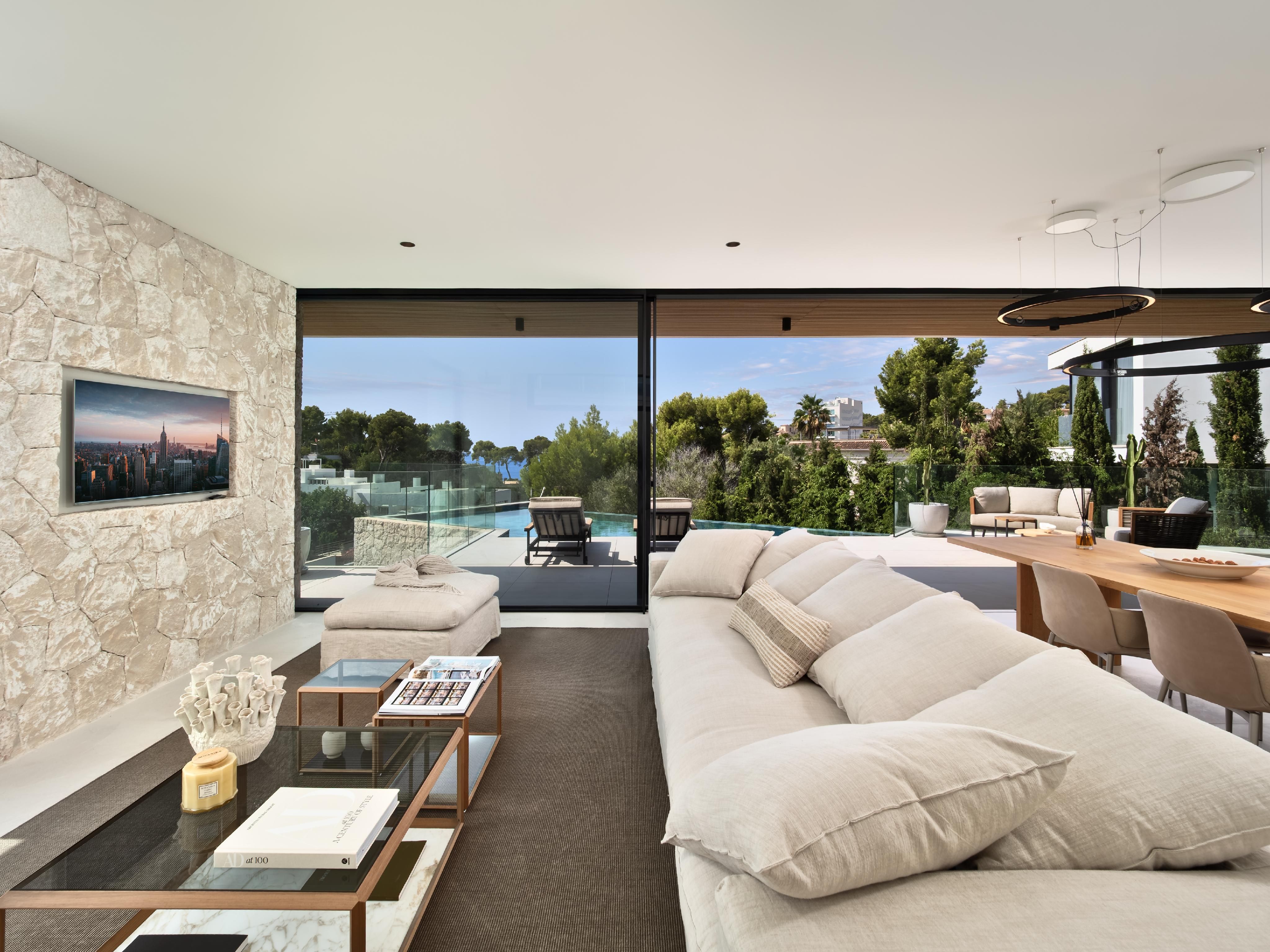 Nur einen kurzen Spaziergang vom Strand von Portals Nous entfernt, bietet diese bezugsfertige, neu gebaute Villa eine luxuriöse Ausstattung, die auch den anspruchsvollsten Käufer zufriedenstellt. Das Anwesen verfügt über vier Schlafzimmer, einen offenen Wohnbereich mit teilweisem Meerblick, einen Echtholzkamin und eine geräumige Siematic-Küche, die mit Gaggenau-Geräten ausgestattet ist. Vom Wohnbereich aus führen Türen auf großzügige Terrassen, die zu einem schönen beheizten Pool und einem üppigen Garten führen. Das Design der Villa betont die Wärme, mit Holz- und Steinböden und einer neutralen Farbpalette. Zu den weiteren Annehmlichkeiten gehören ein Aufzug, der alle Ebenen miteinander verbindet, eine Klimaanlage, eine Fußbodenheizung, eine Garage für ein Auto und ein sicherer Parkplatz für zwei weitere Fahrzeuge. Genießen Sie ein morgendliches Bad oder einen Ausflug mit dem Paddleboard am Strand von Portals Nous, der nur zwei Gehminuten entfernt ist. Der Hafen und das Dorf Portals Nous sind ebenfalls in 10 Minuten zu Fuß zu erreichen.