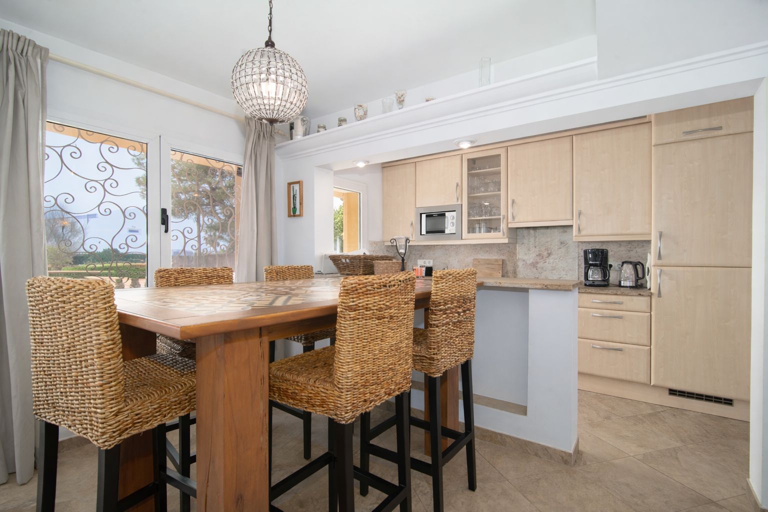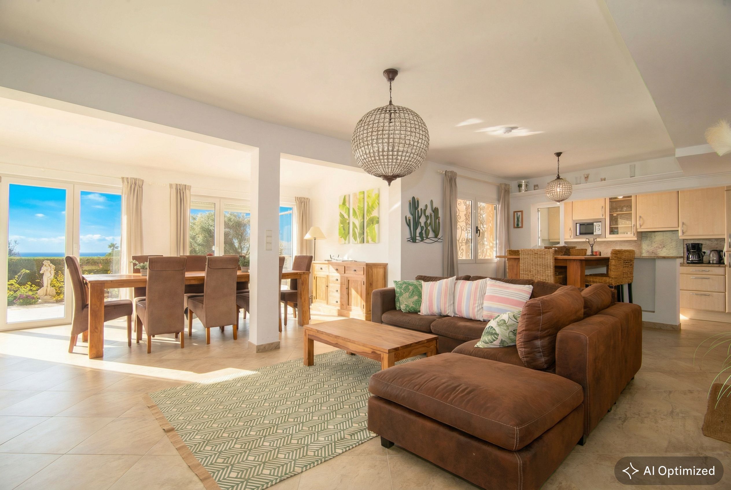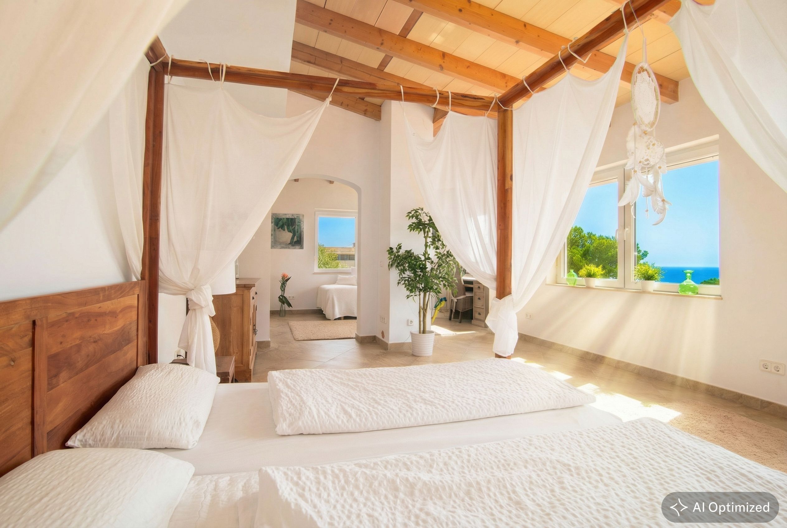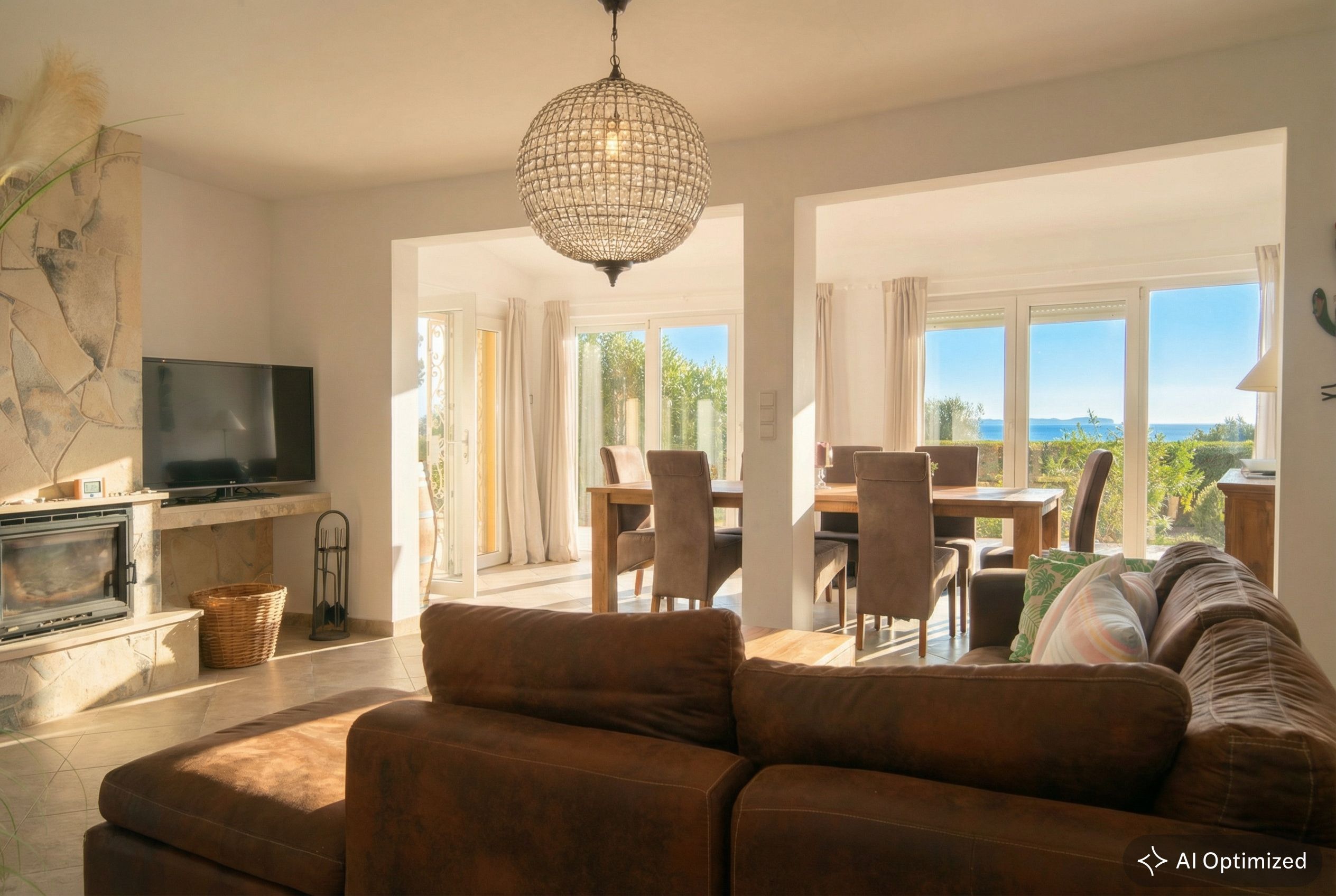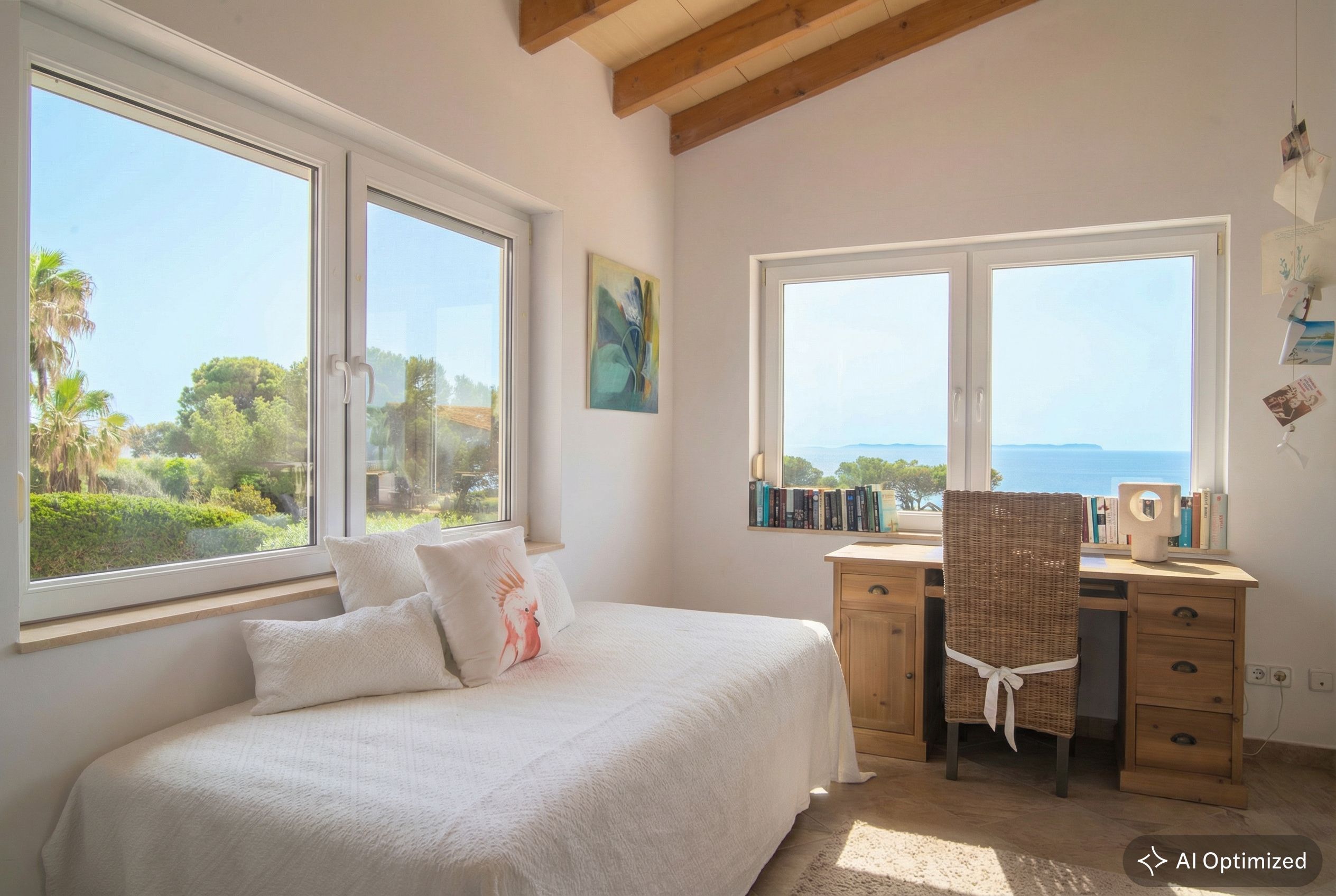 Willkommen in diesem charmanten Einfamilienhaus im mediterranen Stil, erbaut im Jahr 1993 auf einem Grundstück von ca. 800 m². Das Anwesen liegt in einer grünen Umgebung mit üppiger, ausgereifter Natur und Panoramablick auf das Meer, was eine einzigartige Erfahrung der Ruhe und Schönheit bietet. Mit einer Ferienvermietungslizenz für 6 Plätze befindet sich dieses Haus in der zweiten Reihe zum Meer und ermöglicht es Ihnen, die Meeresbrise vom Komfort Ihres Zuhauses aus zu genießen. Das Erdgeschoss verfügt über ein Wohn- und Esszimmer mit einem Kamin. Die halboffene Küche und der angrenzende Waschraum bieten Komfort und Funktionalität, während zwei Schlafzimmer Platz für Familie oder Gäste bieten. Zusätzlich finden Sie ein Badezimmer mit Dusche und eine Gästetoilette. Der obere Teil des Hauses beherbergt eine spektakuläre Suite, die ein geräumiges Wohnzimmer, ein Schlafzimmer mit eigenem Bad und eine Ecke für das Homeoffice umfasst. Ein zusätzliches WC trägt zur Praktikabilität dieser luxuriösen Suite bei, die zu Ihrer privaten Oase mit atemberaubendem Blick auf die natürliche Umgebung und das Meer wird. Das Anwesen verfügt außerdem über eine Garage für ein Auto. Der Außenbereich lädt Sie ein, das mediterrane Klima mit einem 37 m²großen Pool zu genießen, ideal zum Abkühlen an warmen Tagen. Eine Pergola-Gartenlaube bietet einen schönen Ort zum Entspannen und Genießen von Mahlzeiten im Freien, während eine Außendusche nach einem Tag am Strand für eine erfrischende Note sorgt. Das Haus ist mit einer Klimaanlage mit Kalt- und Heizfunktion über Kanäle ausgestattet, die ein angenehmes Ambiente in allen Jahreszeiten gewährleistet. Zusammenfassend vereint dieses Anwesen Komfort mit mediterranem Charme in einer idyllischen Umgebung.