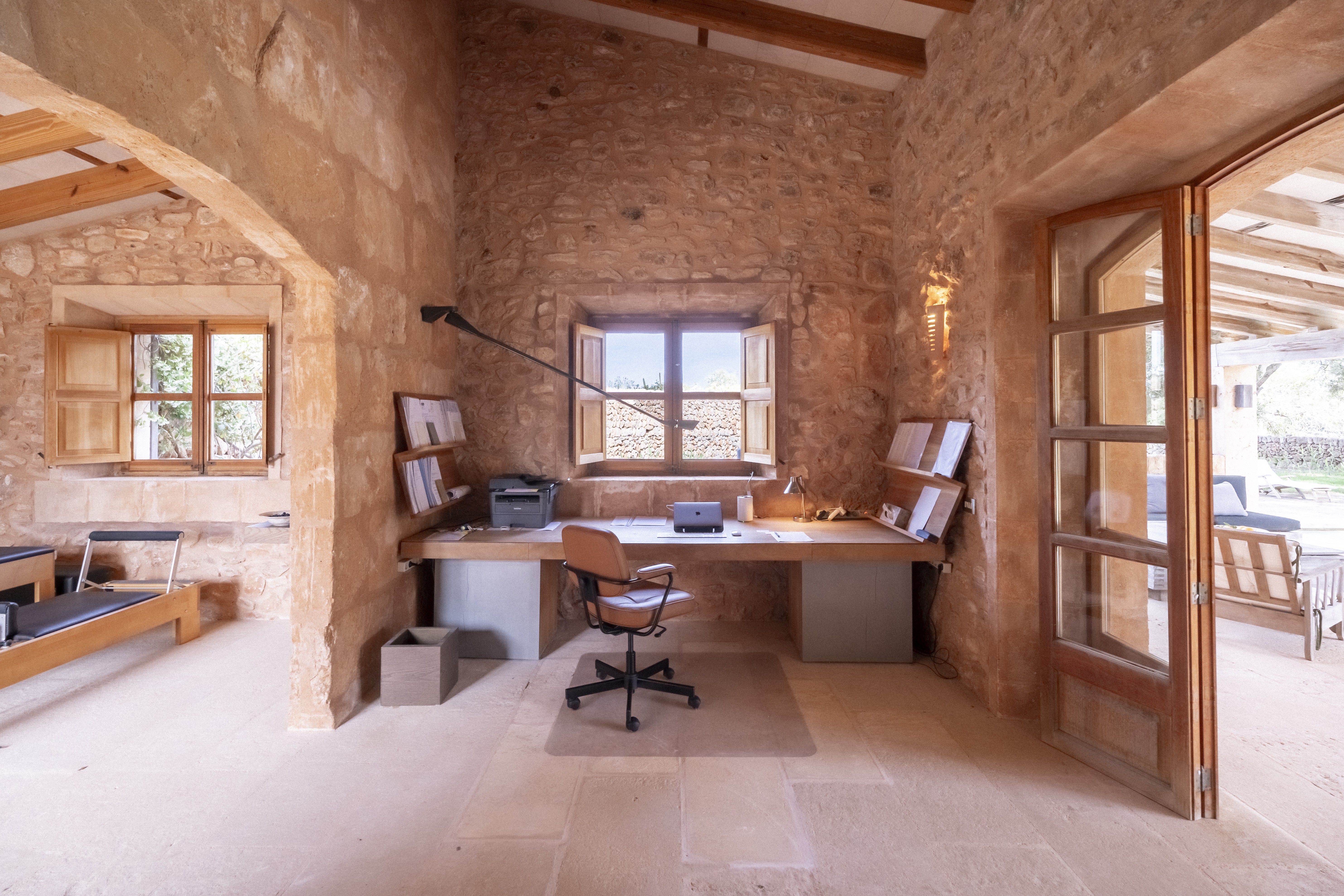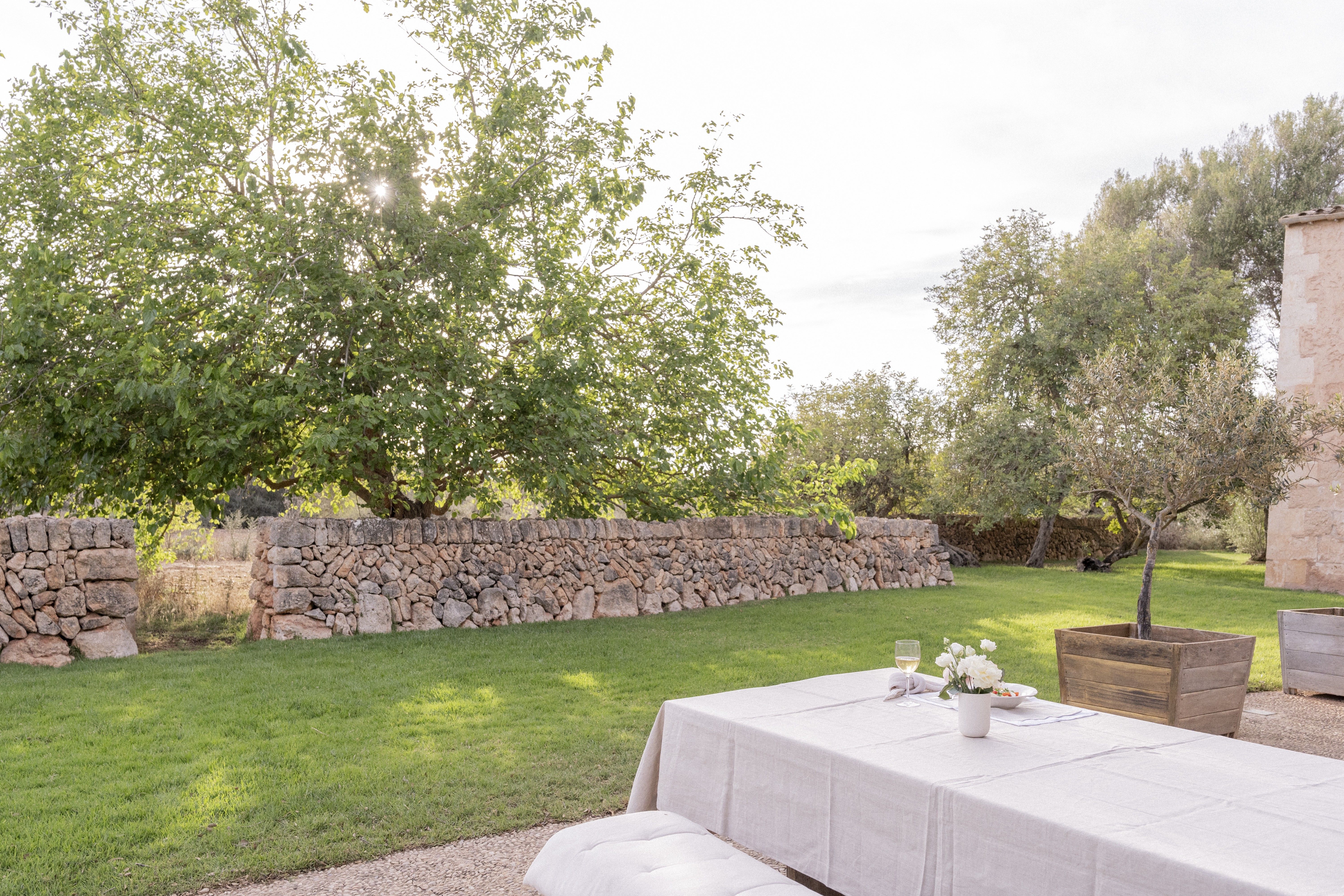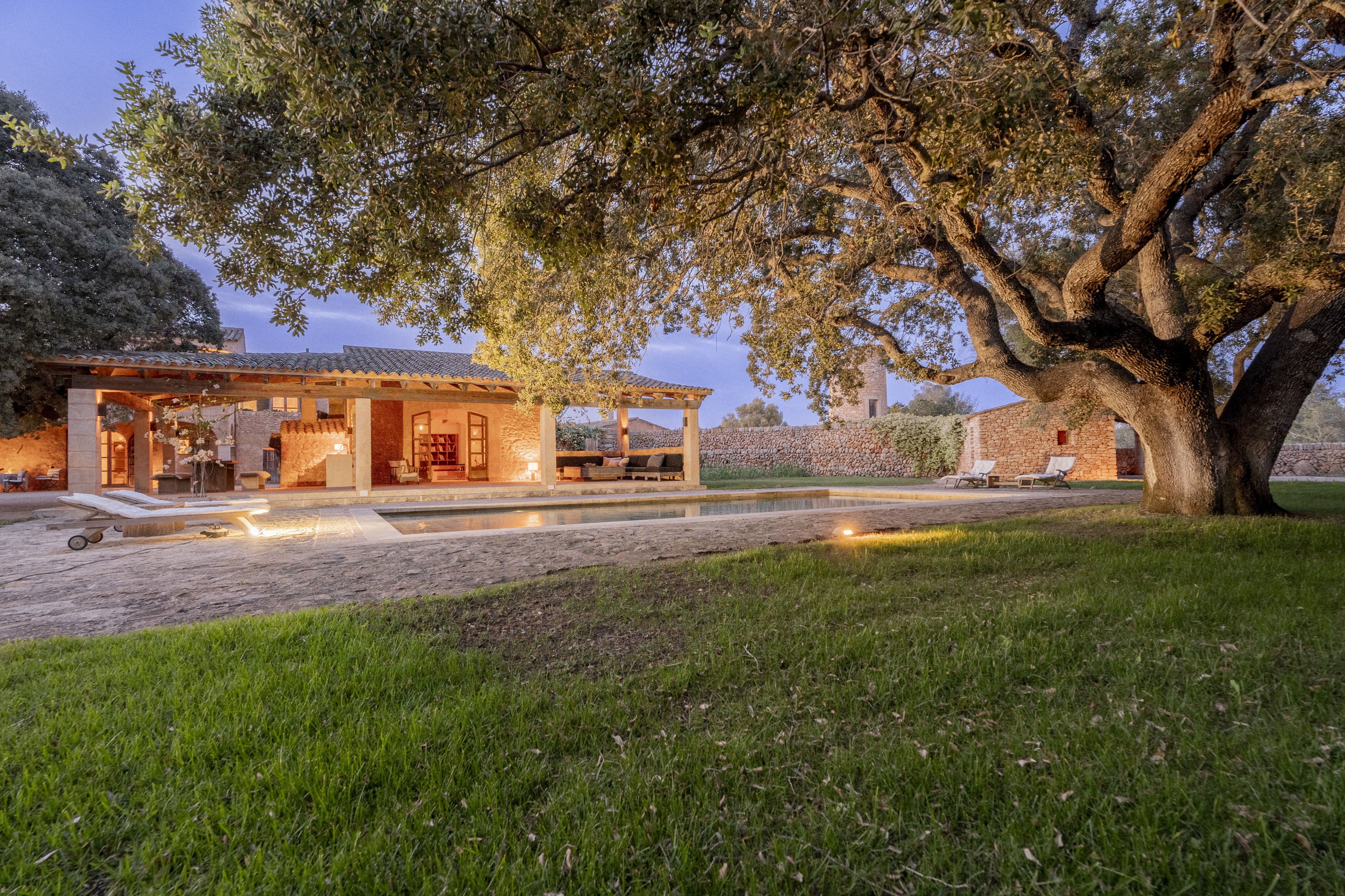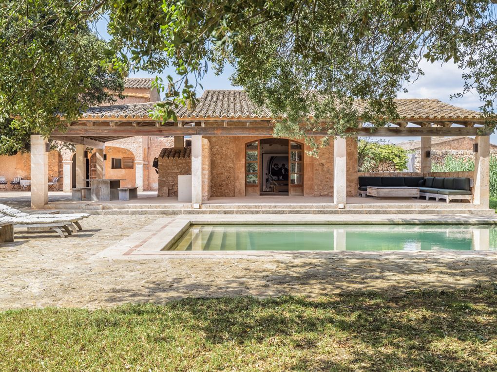 In seinem Entwurf legte der Architekt Vincent Van Duysen den Schwerpunkt auf Komfort in Harmonie mit der Umgebung, und somit ist die Natur ein integraler Bestandteil dieser Immobilie. Das einzigartige Merkmal dieser Immobilie ist ein gepflegter mediterraner Garten, ein natürliches Paradies mit einer 200 Jahre alten Eiche, die einen 12m x 6m großen Pool überschattet. Ruhiger Luxus und die feinsten Materialien zeichnen diese Finca aus, mit Teakholz, sandgestrahlter französischer Eiche, italienischem Marmor und handgefertigten Keramiken, die überall zu finden sind. Die weißen Keramiklampen des Künstlers/Designers Jos Devriendt wurden speziell für die Finca angefertigt, ebenso wie Teller, Schalen und Vasen. Im Esszimmer steht ein großer rustikaler Ulmentisch mit Ahornstühlen von Christian Liaigre. Vincent Van Duysen konzentrierte sich auf das Wesentliche und schuf einen Ort, der das Auge erfreut und den Geist entspannt.