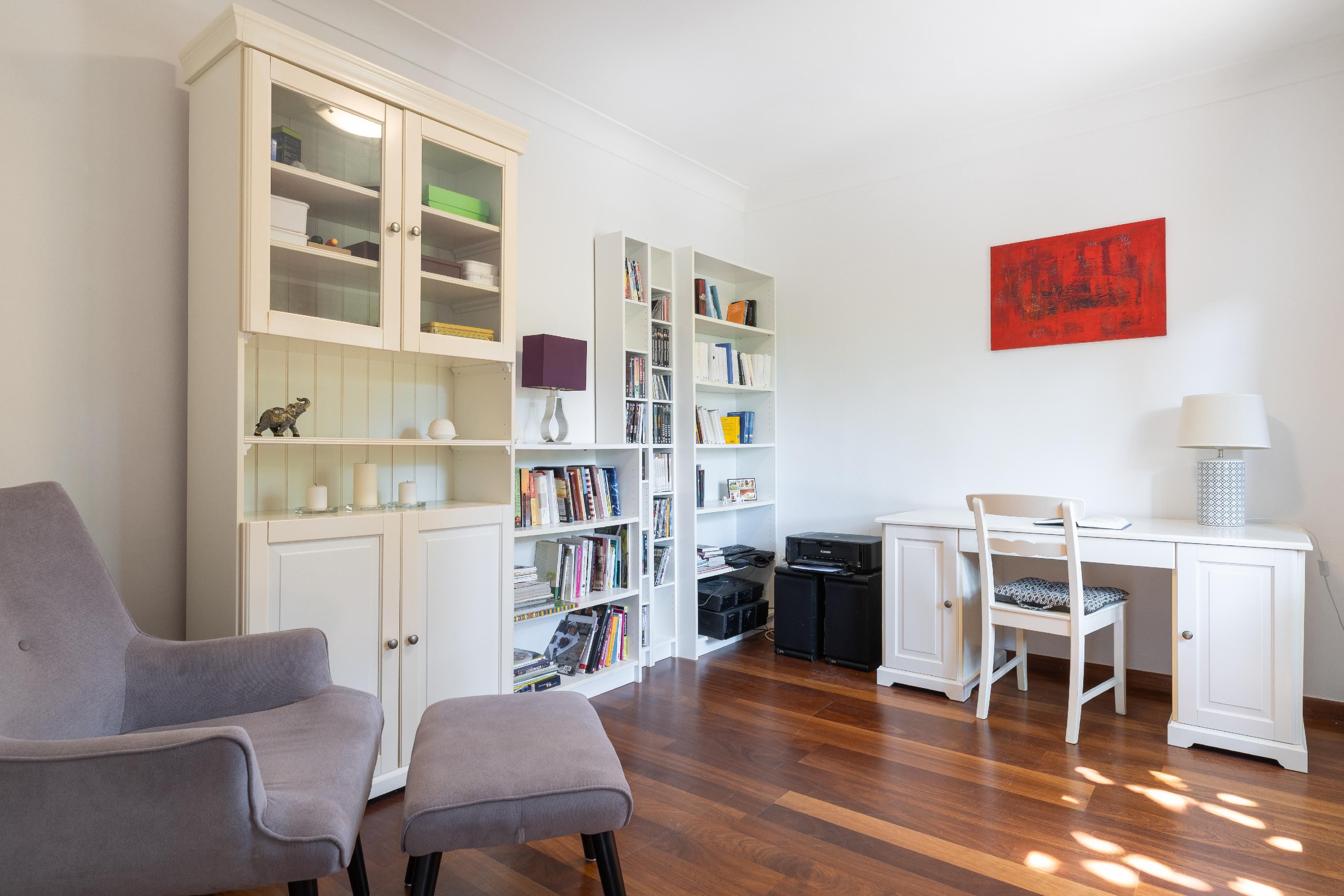 Die halbkreisförmige Architektur der Villa umschließt eine großzügige Terrasse mit beheizbarem Pool und schafft so einen fließenden Übergang zwischen Innen- und Außenbereich. Auf der unteren Ebene mit separatem Zugang befinden sich ein zusätzliches Schlafzimmer mit Bad en suite, der Technikraum, mehrere Abstellräume sowie ein flexibel nutzbarer Bereich, der derzeit als Studio eingerichtet ist.