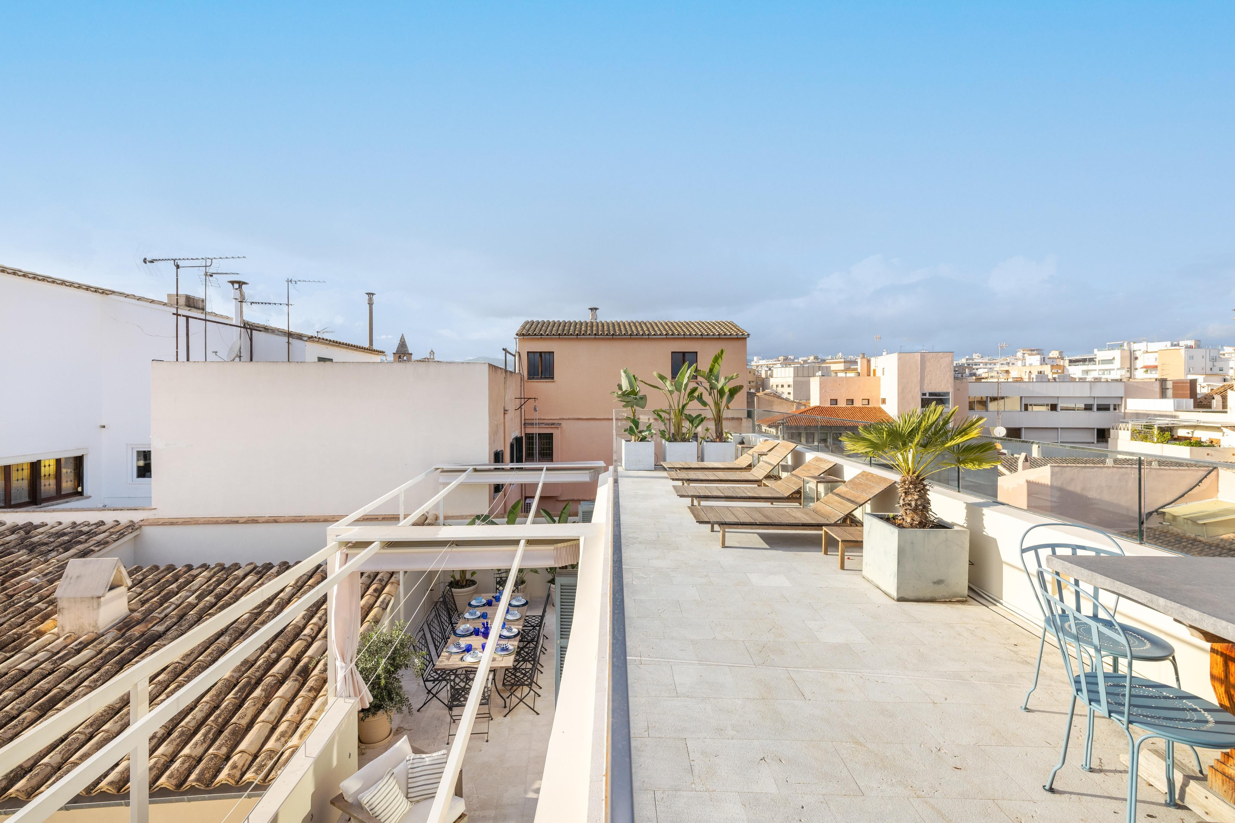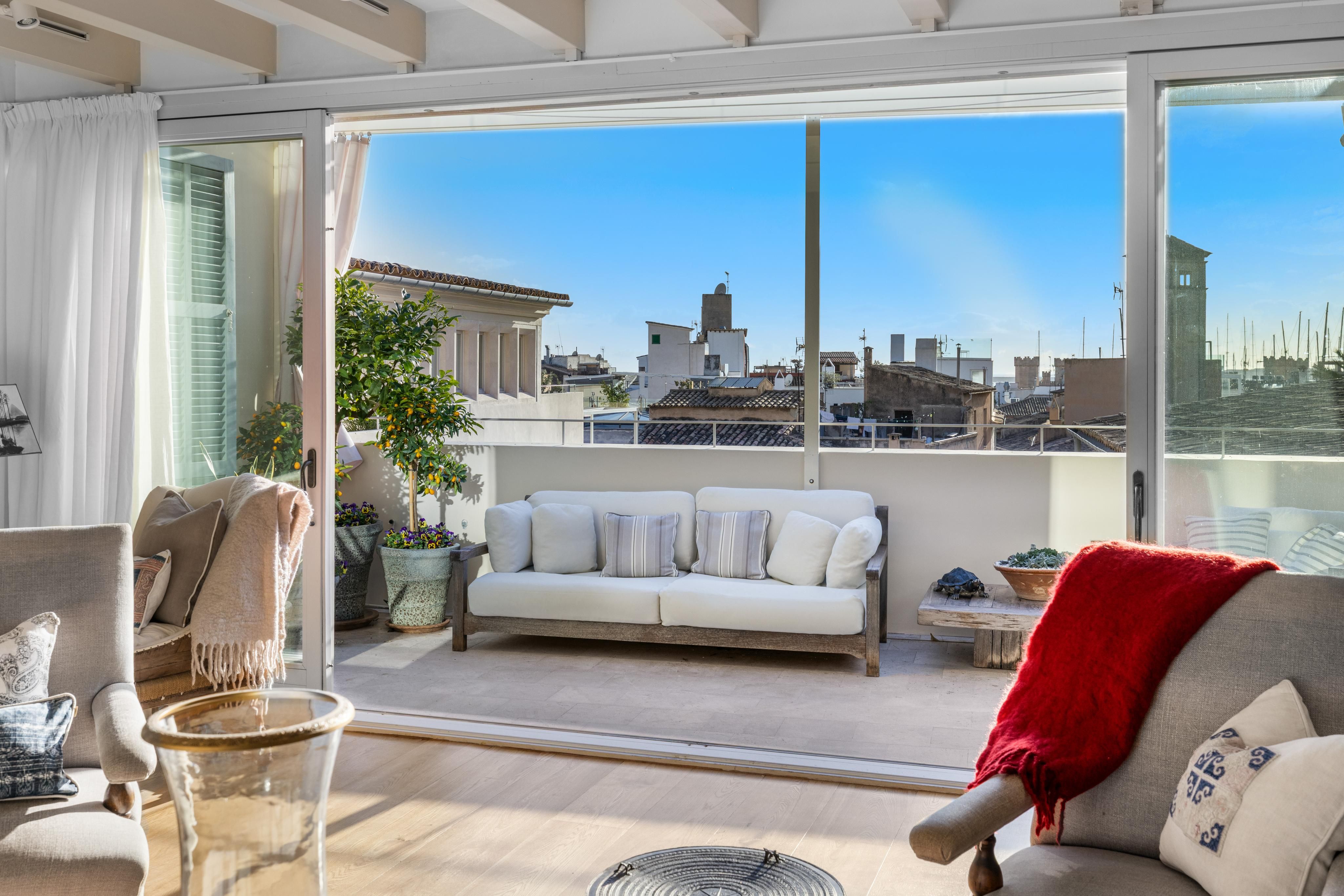 Diese sehr geschmackvoll eingerichtete und ausgestattete Penthouse liegt im historischen Herzen der Altstadt von Palma und bietet einen besonderen Luxus, den nur wenige Gebäude in dieser Lage vorweisen können: einen Aufzug und zwei großzügige und private Dachterrassen (37m2 + 42m2) mit atemberaubender Aussicht. Diese laden dazu ein, den Blick über die Stadt schweifen zu lassen, entspannt auf den Sonnenliegen einen Sundowner zu genießen und dabei nicht nur die majestätische Kathedrale, sondern sogar das Meer zu sehen. Der große Esstisch auf der unteren Terrasse ist einfach nur perfekt, um mit Freunden zu speisen und das Leben zu genießen und zur kühleren Jahreszeit versammeln sich dann alle um den Kamin, der im sonst Sonnenlicht durchfluteten Salon vor sich hin knistert. Die weiß gehaltenen, traditionellen Holzdeckenbalken verleihen der Wohnung eine moderne Leichtigkeit, ohne ihren mediterranen Charme zu verlieren. Dies wird sogar noch durch eine Maresstein-Wand in der Küche betont. Der elegante Holzdielenboden sorgt für eine warme, einladende Atmosphäre, während in den Badezimmern hochwertige Steinfliesen verlegt sind. Zur Ausstattung gehören zwei Schlafzimmer mit Badezimmern en-suite, eine Klimaanlage, Einbauschränke, ein praktischer Wirtschaftsraum sowie ausgewählte Möbel des exklusiven „Rialto Living“ Stores – all das macht dieses außergewöhnliche Penthouse zu einem ganz besonderen Rückzugsort mitten in der Altstadt im begehrten La Lonja Viertel.