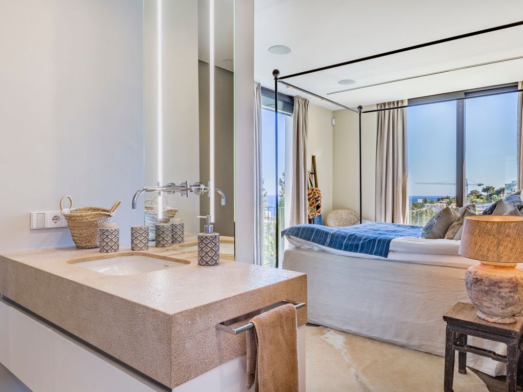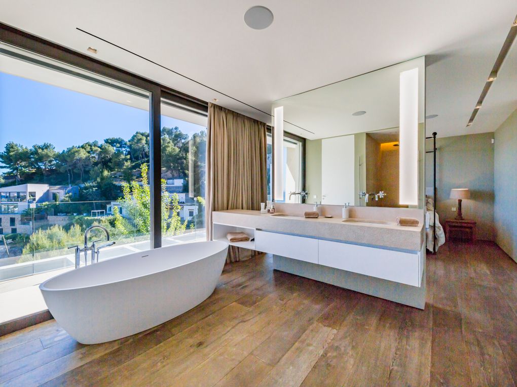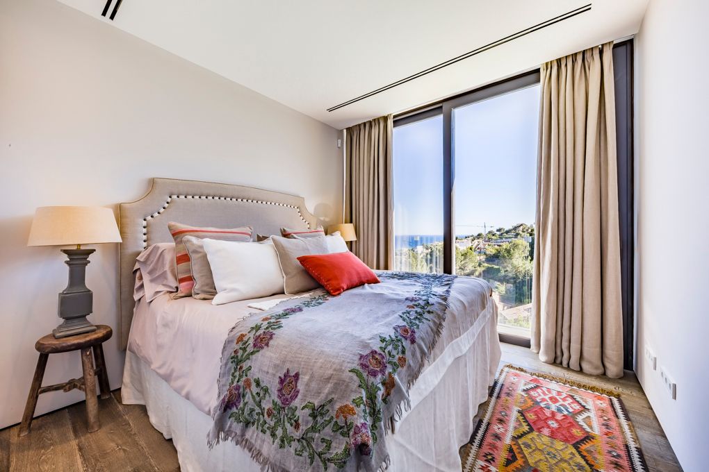 Diese wunderschöne, moderne, nach Südwesten ausgerichtete Villa wurde mit den besten Qualitäten gebaut und die Aussicht auf die Bucht von Palma ist atemberaubend. Das Objekt wurde mit klaren und offenen Linien entworfen, die das natürliche Licht in das Haus eindringen lassen. Die Verarbeitung der Materialien ist hochwertig und der Fußboden besteht hauptsächlich aus Stein kombiniert mit Holzböden in den Schlafbereichen. Sie werden von seiner Einfachheit und dem Reichtum der Materialien verführt werden. Die bebaute Fläche beträgt über 400 qm mit mehr als 60 qm offenen Terrassen auf einem schön terrassierten Garten mit Palmen und Olivenbäumen. Der Außenbereich verfügt über einen Infinity-Pool sowie ein separates Gästeapartment mit eigenem Zugang sowie einer Doppelgarage.