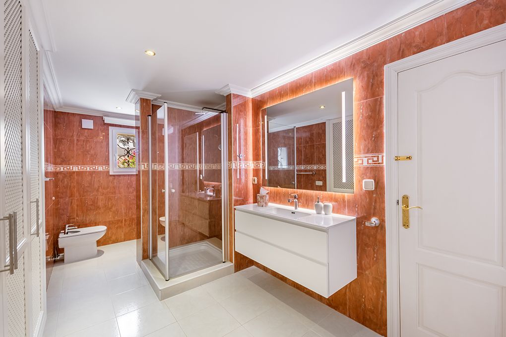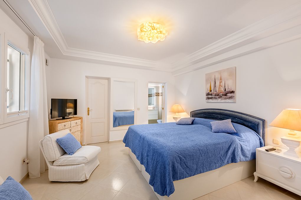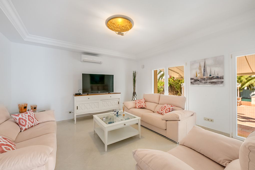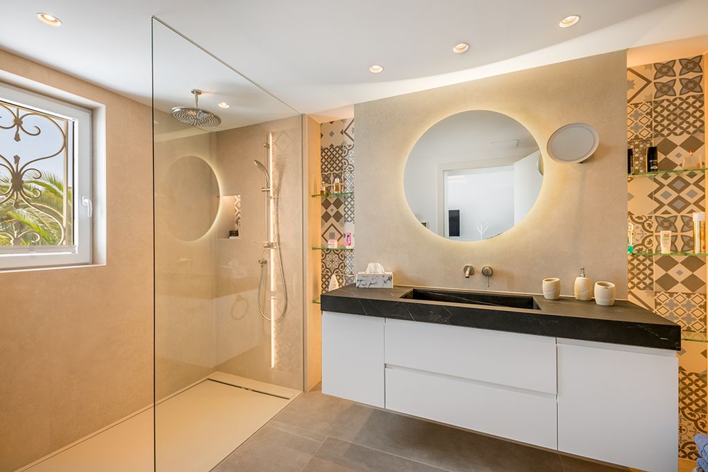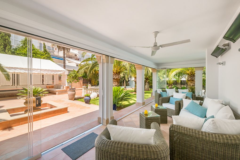 Diese in 2019 komplett renovierte Villa finden Sie in unmittelbarer Nähe der Altstadt von Cala d’Or. Den Sandstrand Cala Gran erreichen Sie fußläufig in nur zwei Minuten. Im Erdgeschoss des sanierten Haupthauses finden Sie den lichtdurchfluteten Wohn-/Essbereich mit Ethanol-Kamin und offener Küche. Von hier aus haben Sie Zutritt zu einer großen Terrasse, die durch faltbare Glaselemente komplett geschlossen werden kann und über eine moderne Außenküche verfügt. Ein separater Schlaftrakt verfügt über zwei Schlafzimmer mit Einbauschränken und jeweils Bad en Suite, sowie ein Gäste-WC, das auch von außen zugänglich ist. Im Obergeschoss sind neben dem Master-Schlafzimmer mit Ankleidebereich und Bad en Suite noch drei weitere Schlafzimmer sowie zwei Badezimmer – eines en Suite – untergebracht. Ein großzügiger Hauswirtschaftsraum ist von außen begehbar. Eine Fußbodenheizung sowie die zentrale Klimaanlage bieten ganzjährig eine angenehme Temperatur im Haus. Das separate, unterkellerte Gästehaus verfügt über ein Wohnzimmer, eine Küche sowie zwei Schlafzimmer mit jeweils Bad en Suite. Das Gästehaus verfügt über eine Klimaanlage warm/kalt. In dem pflegeleichten Garten finden Sie den beheizbaren Pool, eine Sauna mit Dusche sowie zahlreiche, teils beschattete Sitzgelegenheiten. Genießen Sie hier wunderschöne Stunden mit der Familie und Freunden. Zahlreiche Restaurants und Geschäfte sind zu Fuß zu erreichen. Der exklusive Yachthafen von Cala d’Or ist ca. fünf Autominuten entfernt.