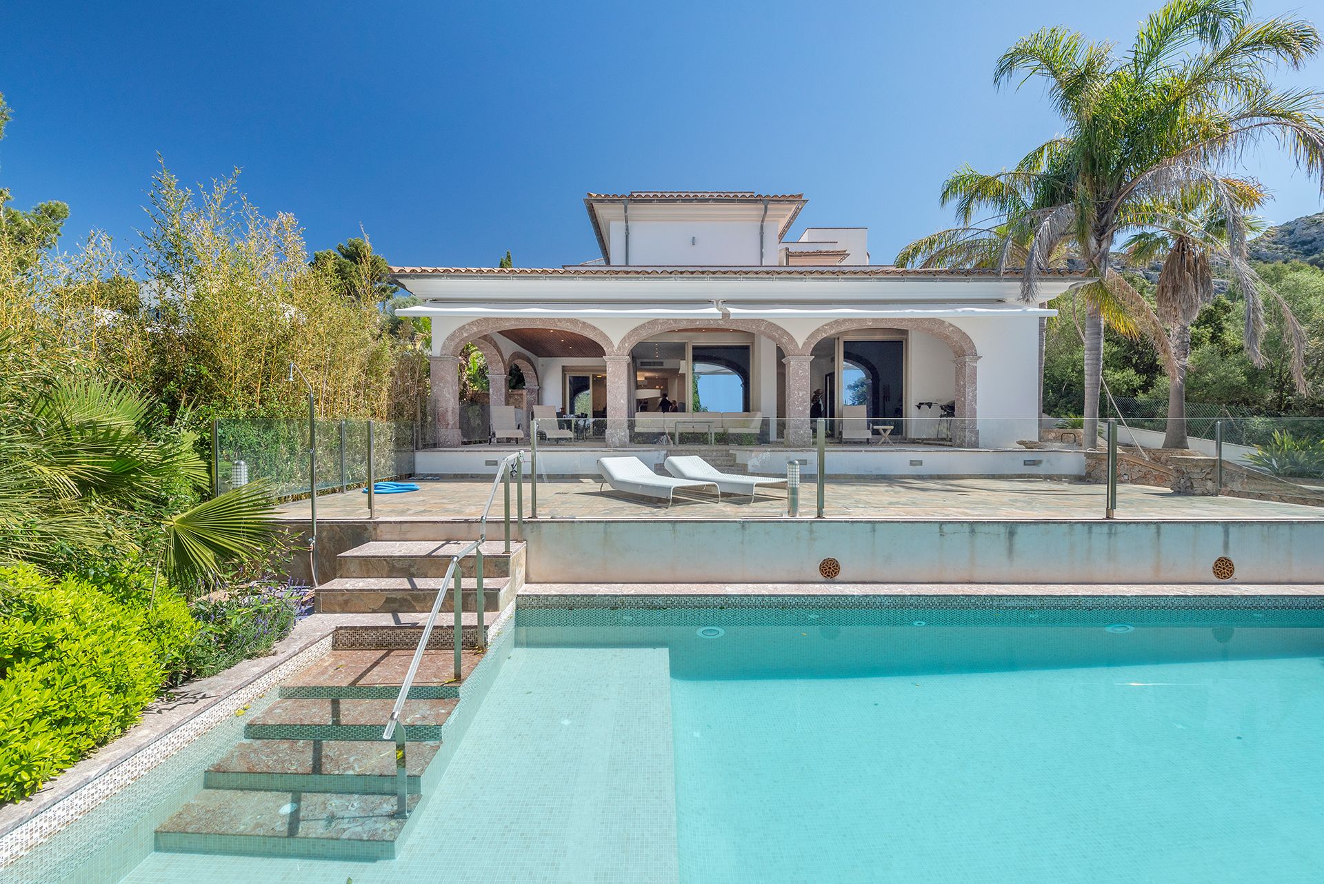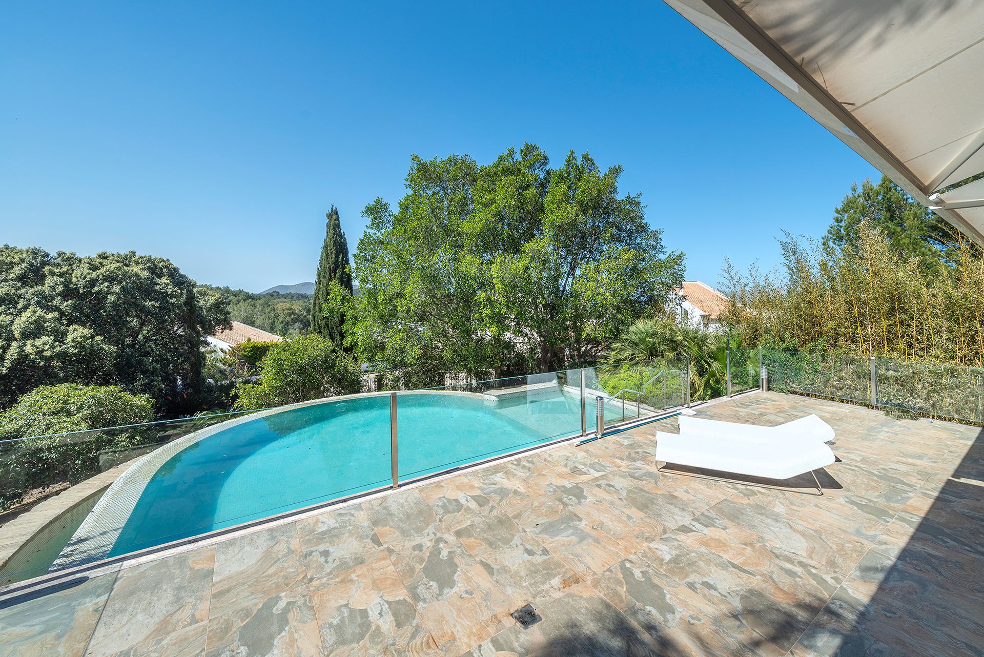 Vom Wohnbereich aus gelangt man direkt auf die überdachte Veranda mit Zugang zum Infinity-Pool, die zum Entspannen und Genießen einlädt.