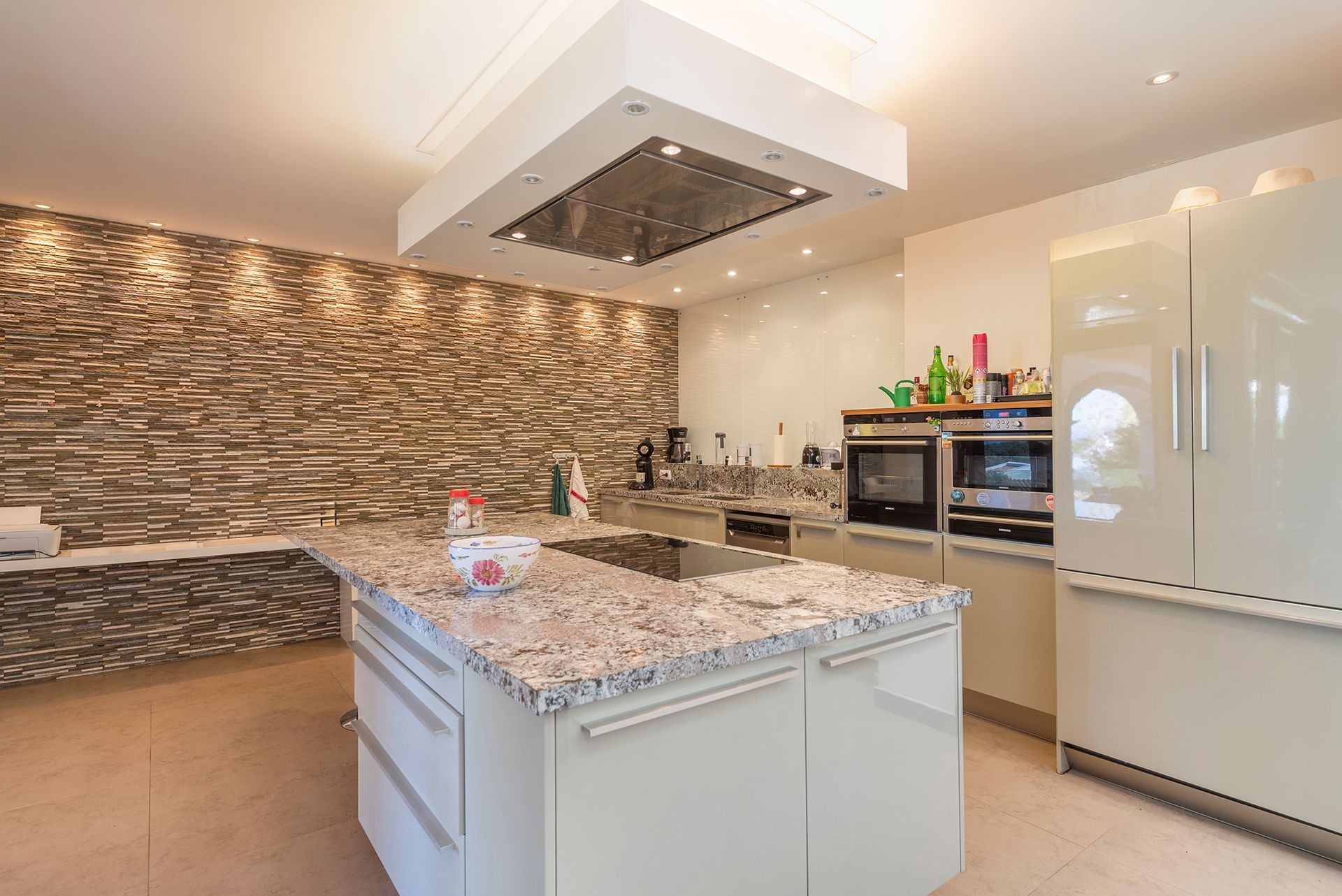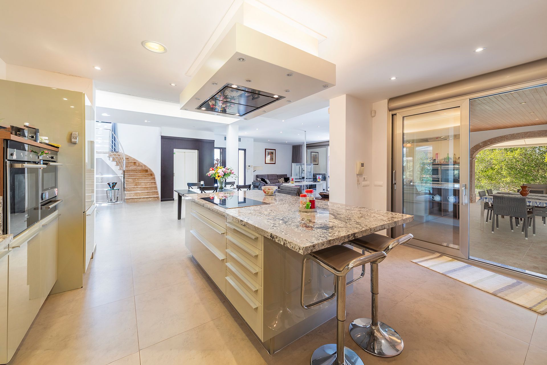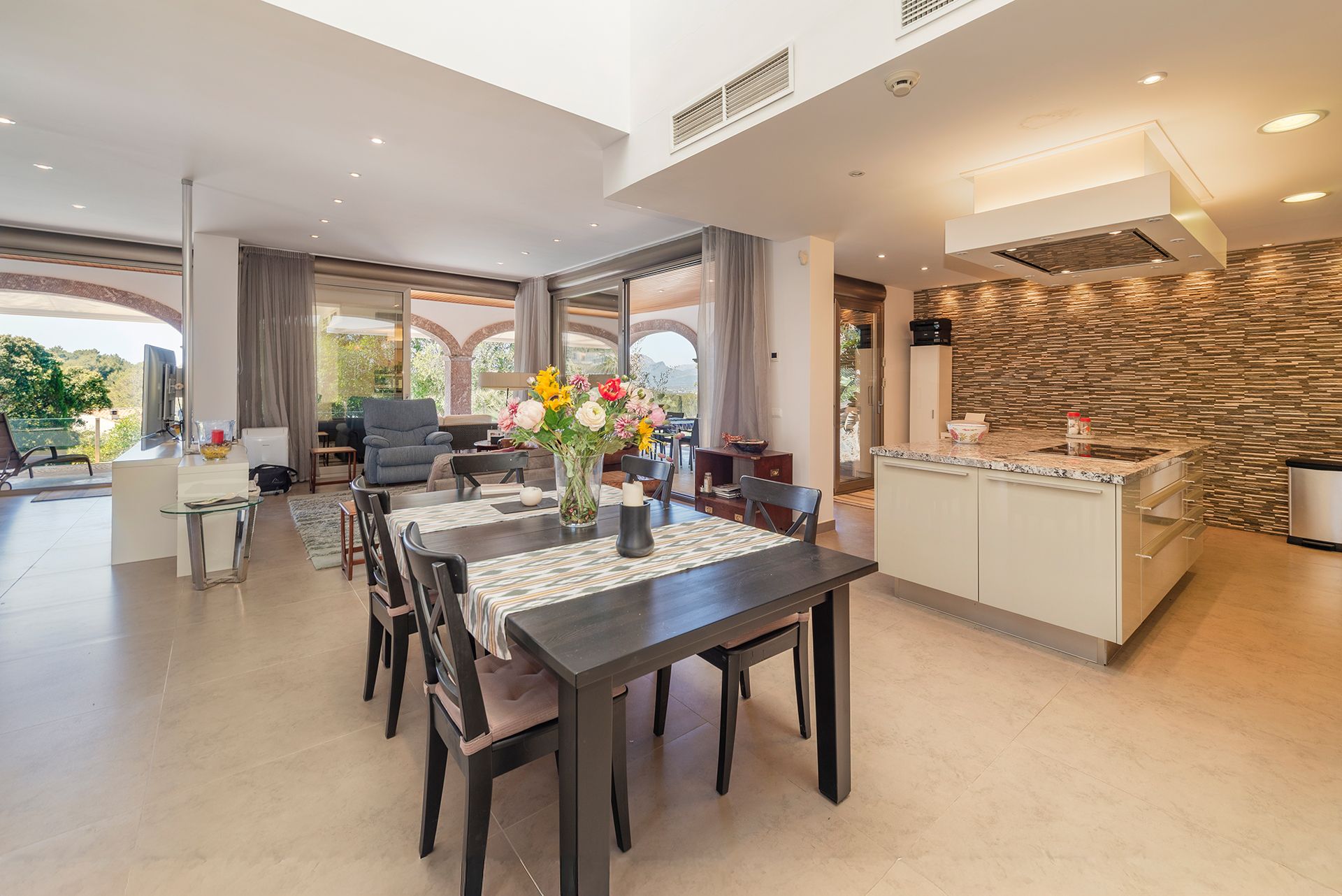 Die Immobilie verfügt über insgesamt 6 Schlafzimmer und 6 Badezimmer und bietet somit ausreichend Platz für Familie und Gäste. Herzstück der Villa ist der großzügige, offen gestaltete Wohn- und Essbereich mit integrierter Designerküche. Die hochwertige Küche ist mit einer eleganten Porzellan-Arbeitsplatte ausgestattet und fügt sich harmonisch in das moderne Gesamtbild ein.