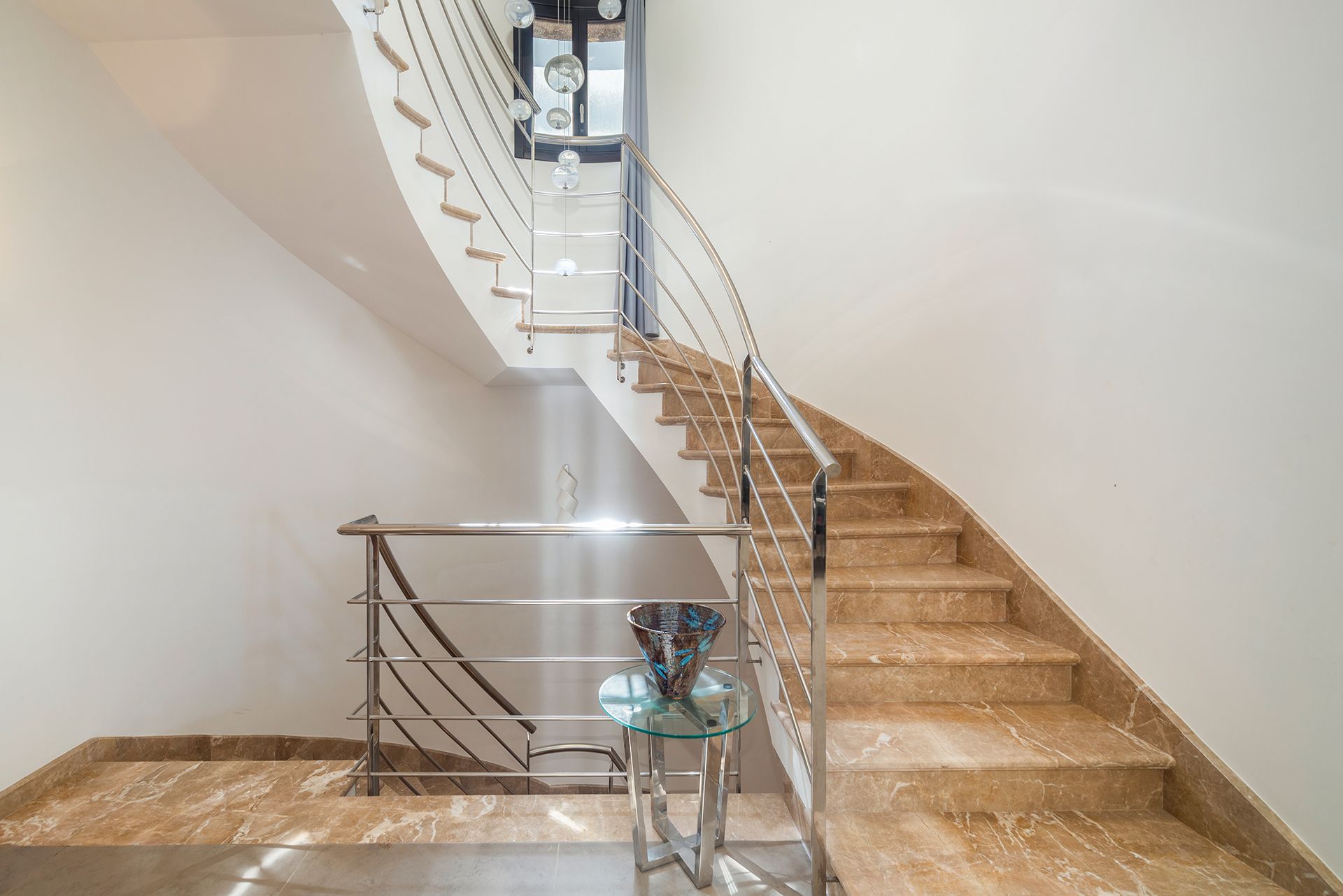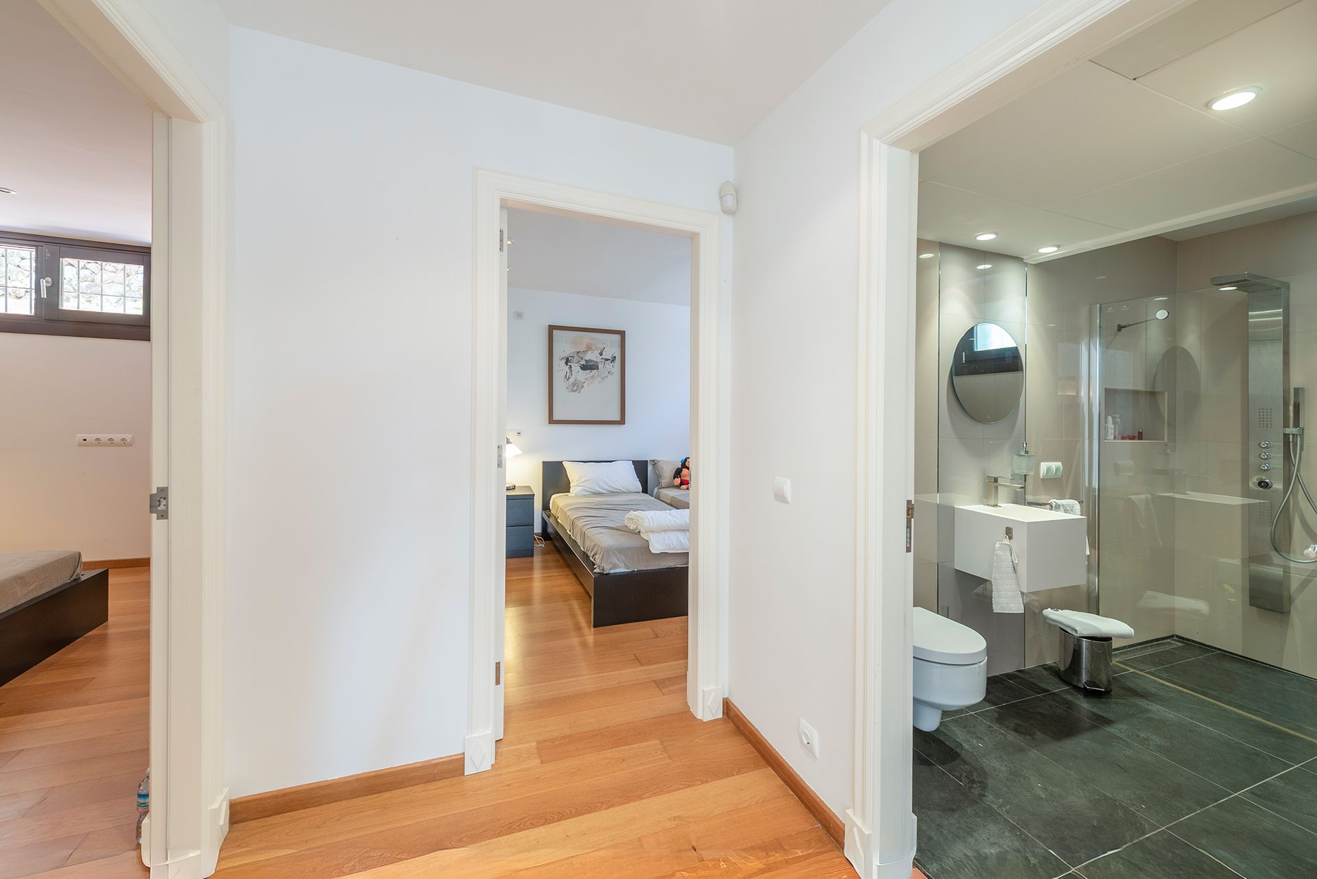 Im Erdgeschoss befinden sich 3 Schlafzimmer sowie 3 Badezimmer, während sich im Obergeschoss weitere 3 Schlafzimmer und 3 Badezimmer befinden. Über eine elegante Treppe gelangt man in das Obergeschoss, von dessen Flur aus man einen offenen Blick in den Wohnbereich genießen kann, ein weiteres Highlight der offenen Architektur. Zudem bietet das Obergeschoss Zugang zu einer Dachterrasse mit Meerblick.