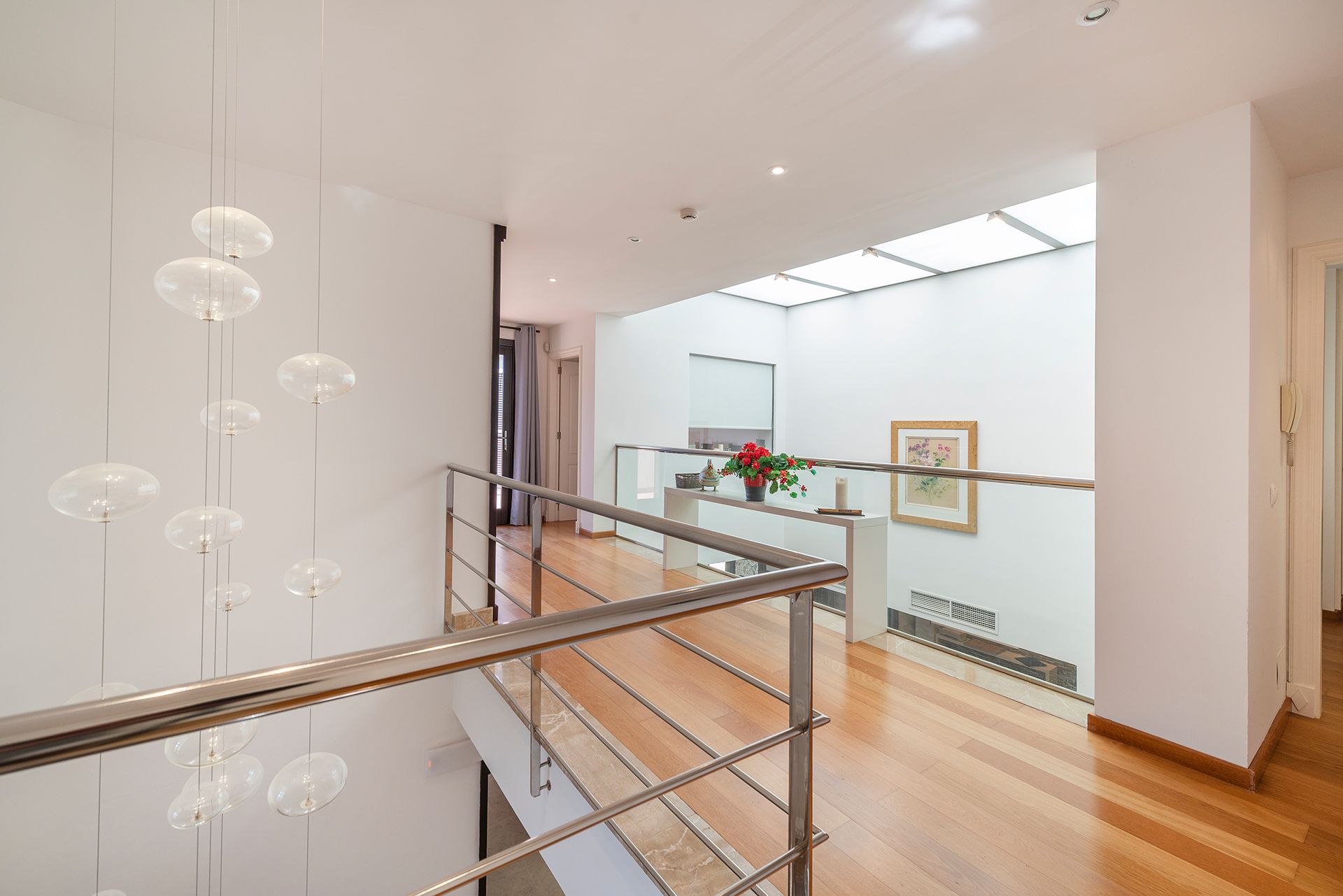 Ein besonderes architektonisches Highlight ist die außergewöhnliche Deckenhöhe im Wohnbereich. Ein stilvoll integrierter Lichtschacht sorgt dafür, dass natürliches Licht direkt vom Dach in den Wohnraum fällt und eine helle, luftige Atmosphäre schafft.