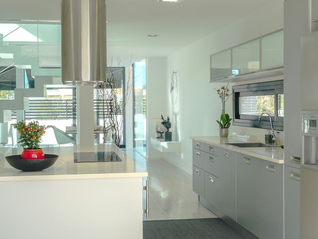 Modern kitchen with island and high-end appliances integrated with living-dining area