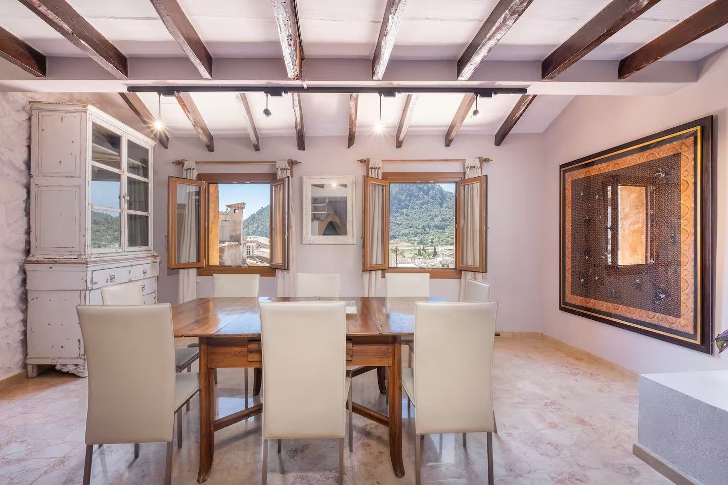 In one of the most emblematic areas of Pollença, beside the iconic Calvario steps, stands this traditional house that captivates with its authentic character and rich history. Its stone façade and imposing arched entrance, framed by two sturdy studded wooden doors, announce the charm of a home that preserves the true essence of Mallorca’s past.