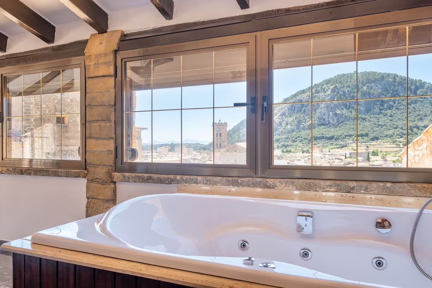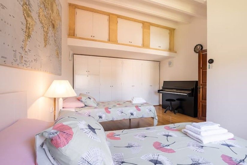 On the ground floor, a generous entrance hall leads to the first bedroom with en-suite bathroom and to traditional Mallorcan stone flooring that adds authenticity and character. The first floor features an elegant living room with a family dining area, a cast-iron wood-burning stove and large windows that flood the space with natural light. The fully equipped kitchen, with breakfast area, connects to a separate pantry and a practical laundry room. This level also includes a double bedroom with wooden floors and a bathroom with bathtub.