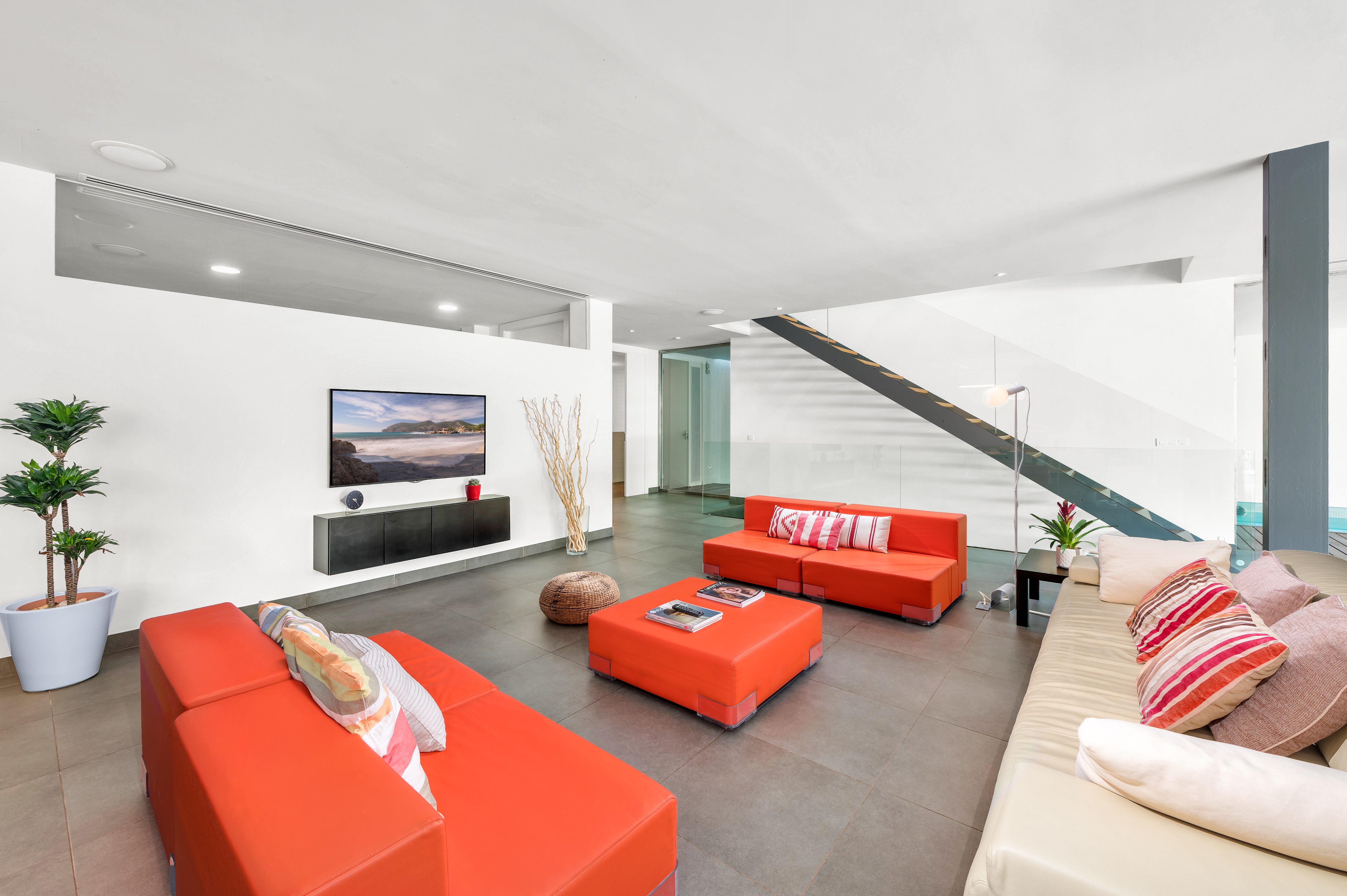The outdoor areas are thoughtfully designed for relaxation and recreation, offering a basketball court, a small football field, rose bushes, and orange trees, creating a peaceful and private Mediterranean setting. Additional features such as air conditioning, heating, automatic shutters, and ample parking ensure convenience and ease throughout your stay. Whether you prefer lounging by the pool, enjoying various activities, or simply unwinding amidst the lush surroundings, this luxury villa in Son Vida promises a memorable and unforgettable holiday experience. Exact prices and rental conditions are available upon request. ETV 6213
