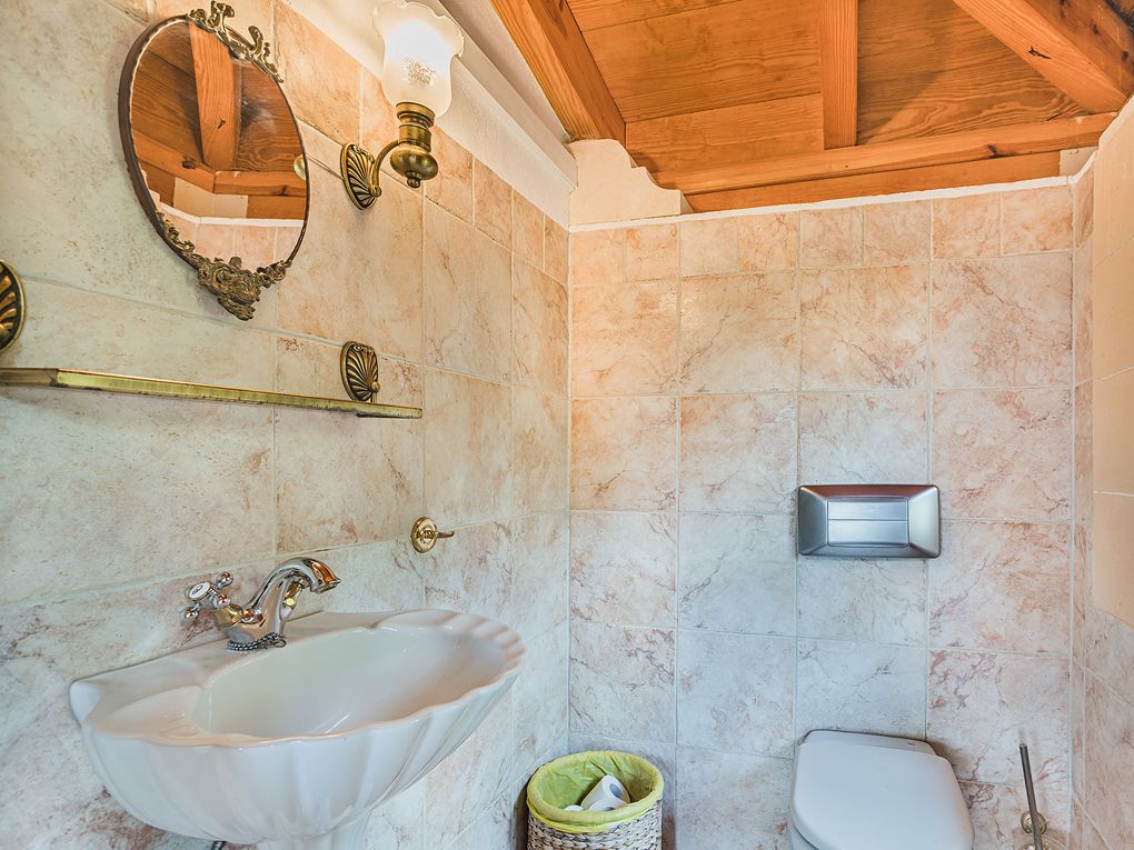 Steps rise to the formal dining room, an elegant setting for memorable gatherings. The spacious country-style kitchen, fully equipped and featuring an informal dining area, opens directly onto the terraces, allowing indoor living to blend seamlessly with the outdoors.