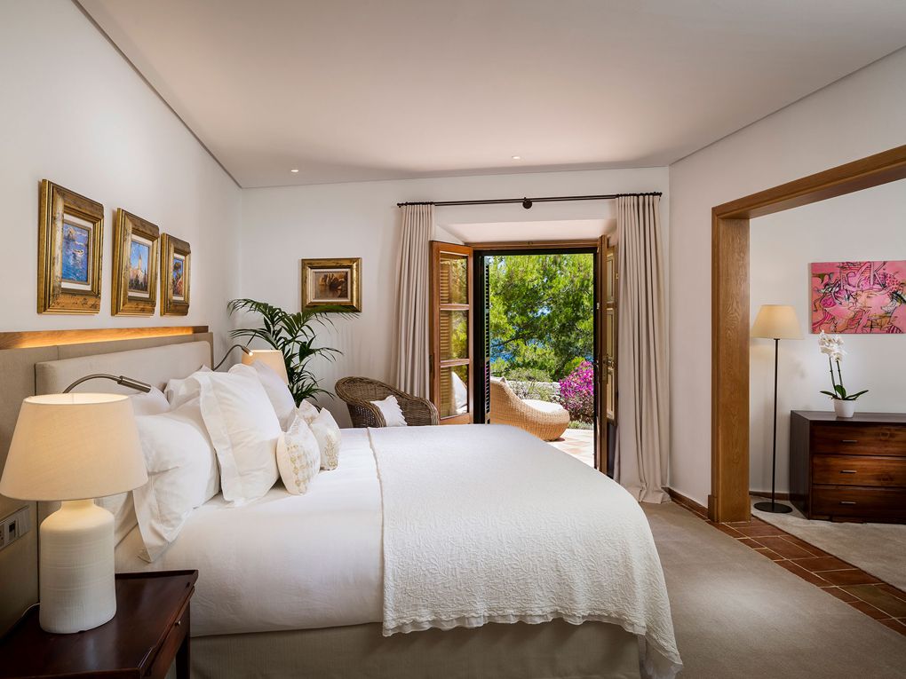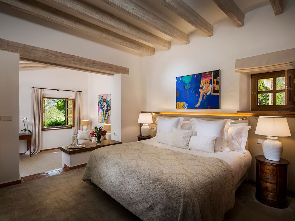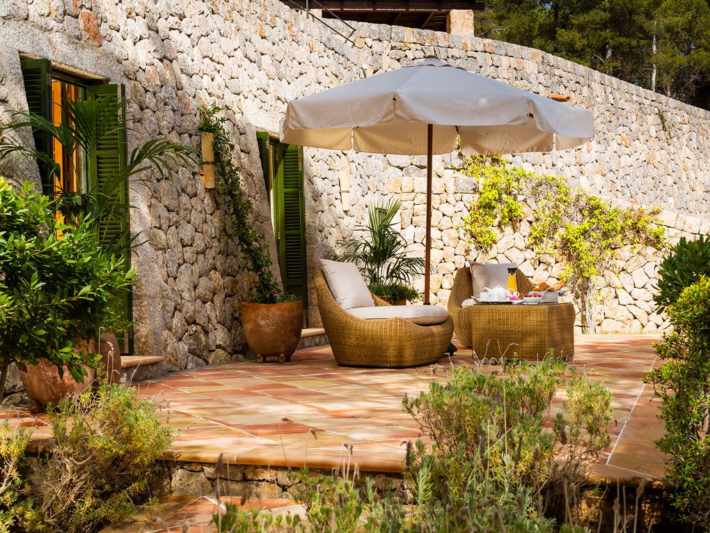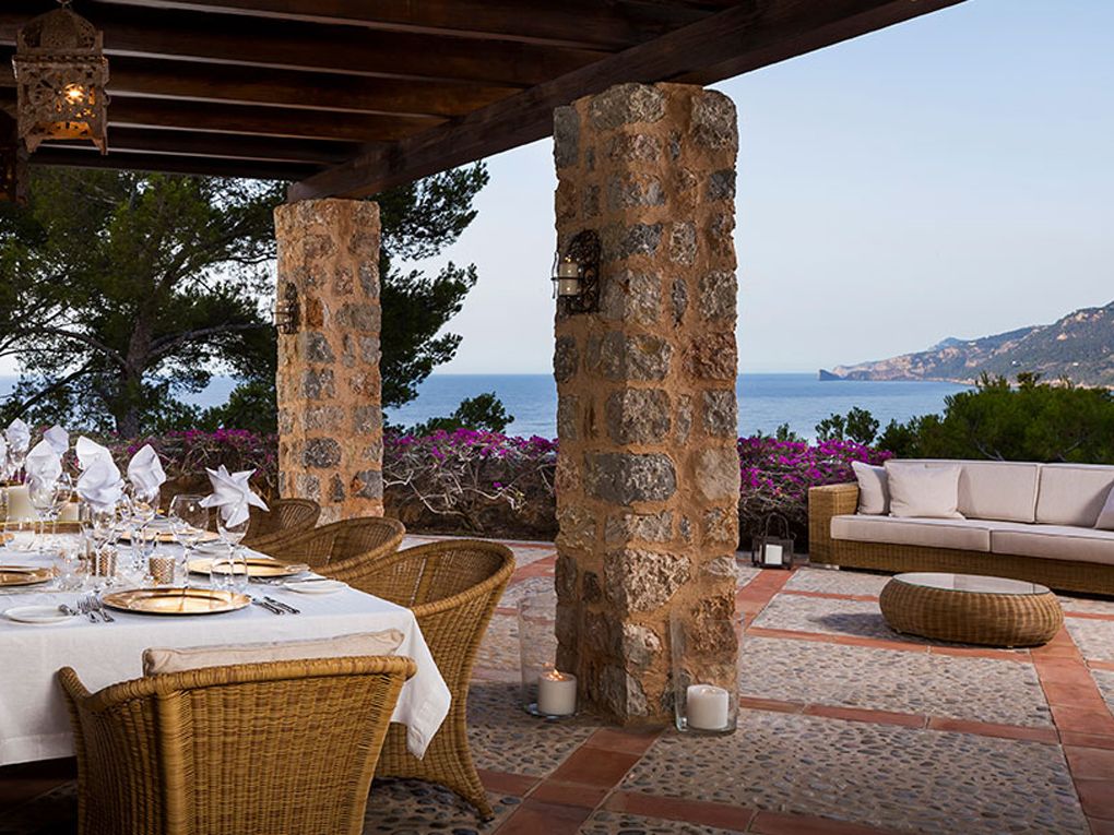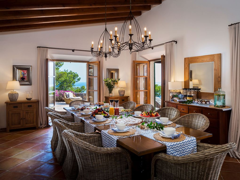 Sa Punta de S'Aguila One of three villas in the Virgin Limited Edition. Sa Punta de S'Aguila, translated as "Eagle's Point," is a five-bedroom villa located along the coastline. Built in the traditional Mallorcan style with exposed ceiling beams and terracotta tile floors, it has been integrated into the landscape and offers panoramic views of the sea and mountains. Sa Punta de S'Aguila has a private heated 15-meter pool, kitchen, living room, and dining area. This villa comfortably accommodates 10 adults in 5 bedrooms with en-suite bathrooms. All bedrooms have a terrace with a table and two chairs.