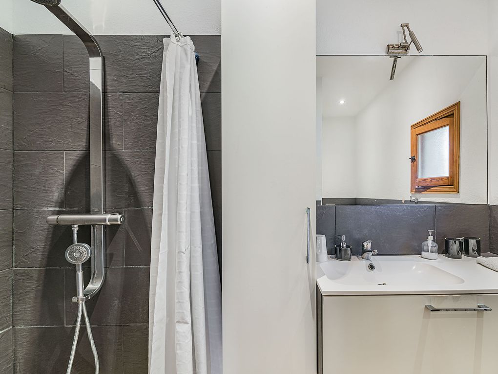 From the terrace, a set of steps leads down to the independent annex, which offers a generous double bedroom with an en-suite bathroom featuring a shower. This room, also equipped with air conditioning, enjoys large windows overlooking the patio and direct access to the pool area with sun loungers and inviting seating spaces. A spacious built-in barbecue area completes this charming Mediterranean retreat.