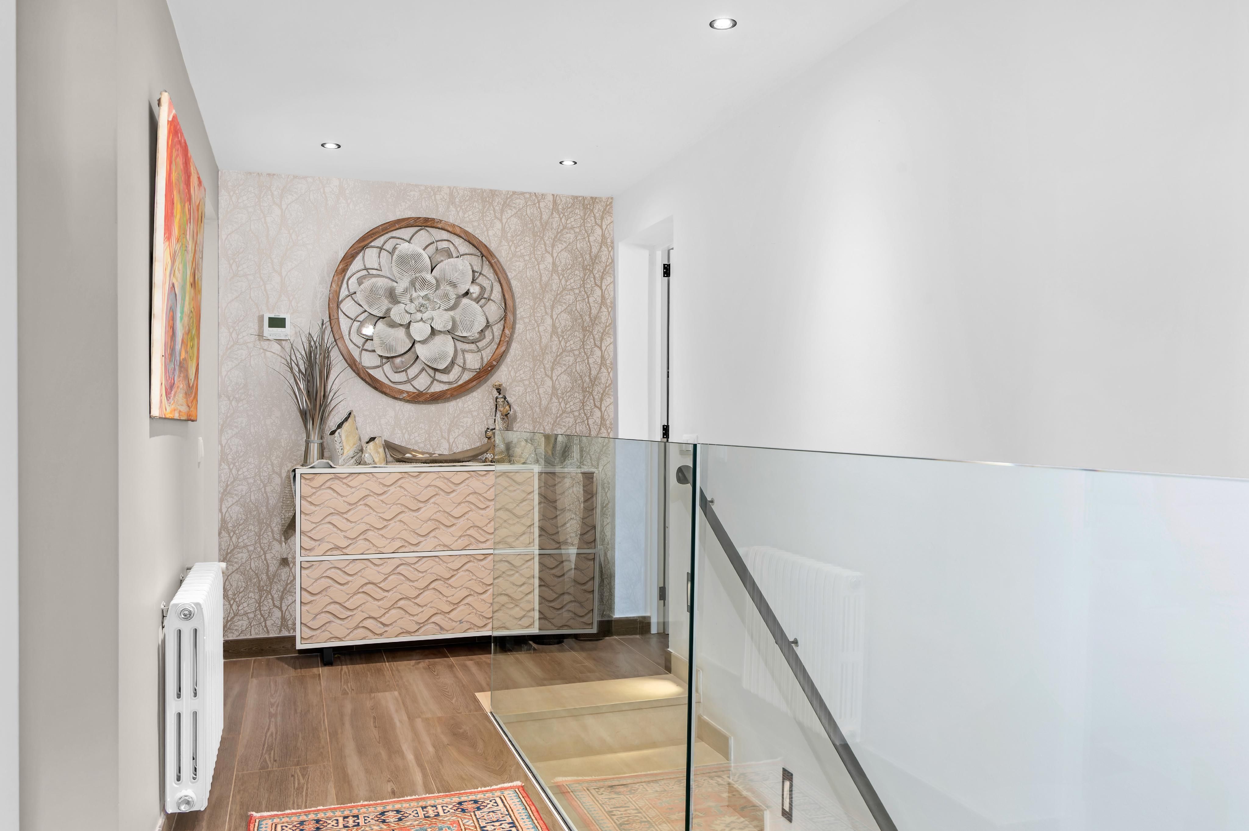 This exclusive finca is located in the sought-after area of Calvià and offers a unique living experience surrounded by nature. Set on a spacious plot of approximately 15,000 m², you can enjoy complete privacy and breathtaking, unobstructed views of the surrounding countryside. The charming property extends over two floors and has a total of five spacious bedrooms, ideal for families or guests. Bright rooms and high-quality materials create a warm and inviting atmosphere. Outside, you will find a magnificent pool with a counter-current system – perfect for athletic swimmers or relaxing hours under the Mallorcan sun. Thanks to the ideal south-facing orientation, you can enjoy optimal sunlight throughout the day. The finca combines rural charm with modern comfort and offers numerous possibilities for individual design. Here you can experience the tranquillity of nature without having to forego the amenities of Calvià and the beaches in the southwest of Mallorca.