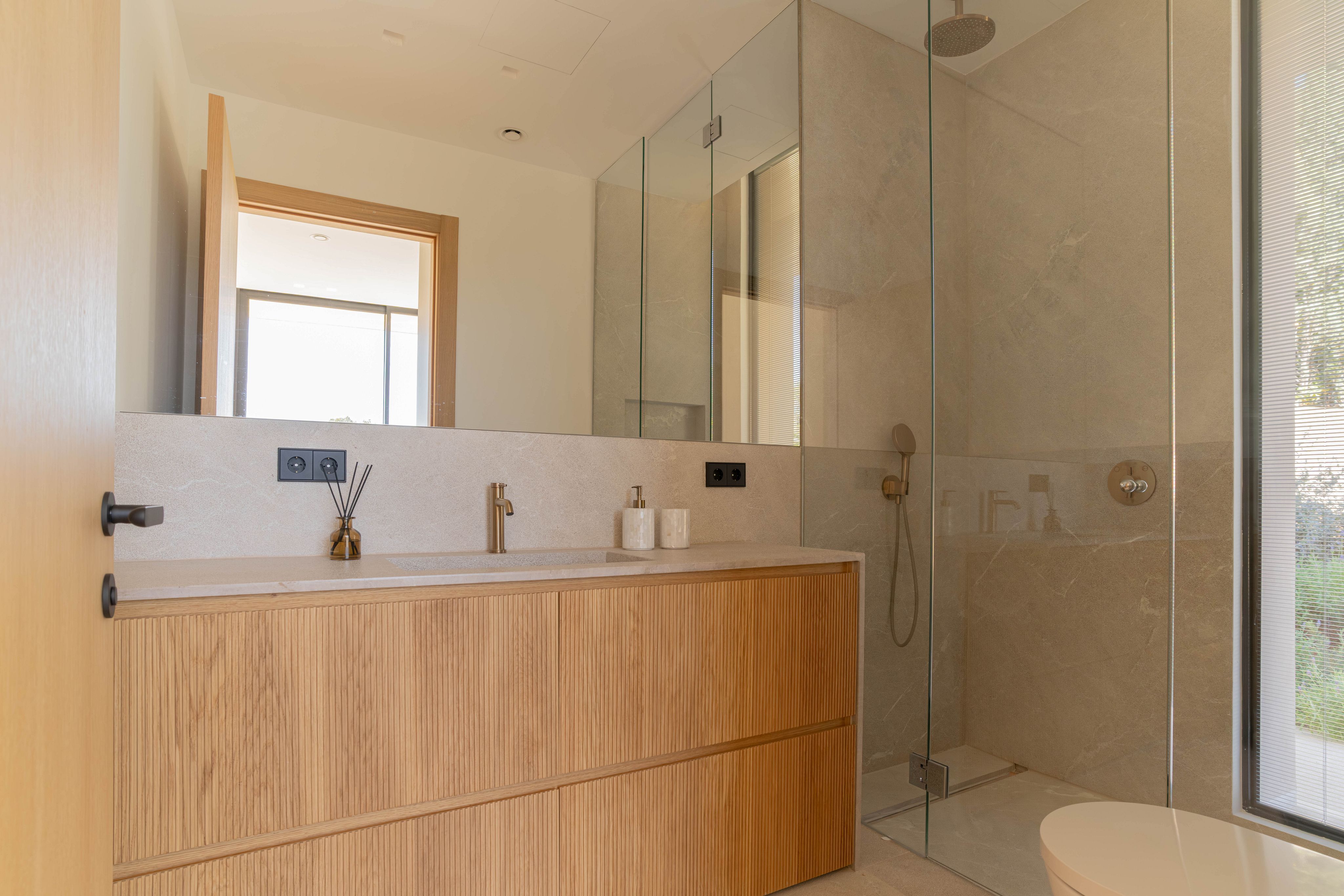 This exceptional newly built villa combines contemporary design with luxurious comfort, set in a privileged location offering breathtaking sea views. Designed to maximize light and space, the property provides an elegant yet relaxed Mediterranean lifestyle. The villa features five spacious bedrooms, each thoughtfully designed, along with six modern bathrooms finished to the highest standards. The heart of the home is a large open-plan living and dining area seamlessly connected to a fully equipped, state-of-the-art kitchen—perfect for both everyday living and entertaining. Expansive glass doors open onto a generous ground floor terrace at the rear of the property, ideal for al fresco dining and enjoying warm evenings outdoors. The beautifully landscaped garden surrounds a private swimming pool, complemented by a dedicated BBQ area, creating an inviting space for gatherings with family and friends. Additional features include a large garage with capacity for up to five vehicles, ensuring convenience and ample storage. This villa represents a perfect blend of modern architecture, comfort, and stunning sea views—an ideal home for those seeking luxury living in an exclusive setting.