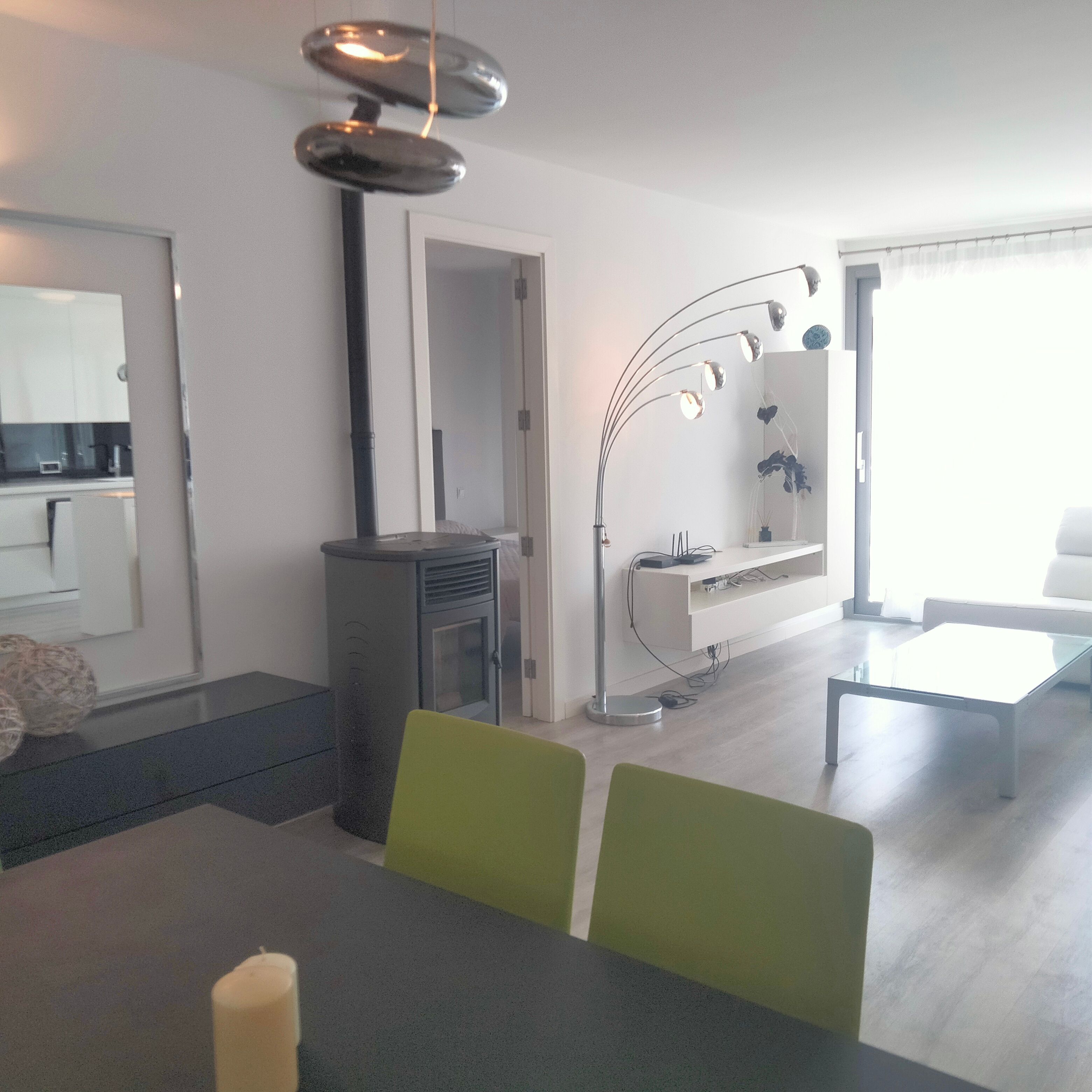 The apartment offers three double bedrooms with fitted wardrobes and two bathrooms, providing generous space and comfort. It is equipped with hot and cold air conditioning as well as a pellet stove, ensuring a pleasant indoor climate throughout the year.