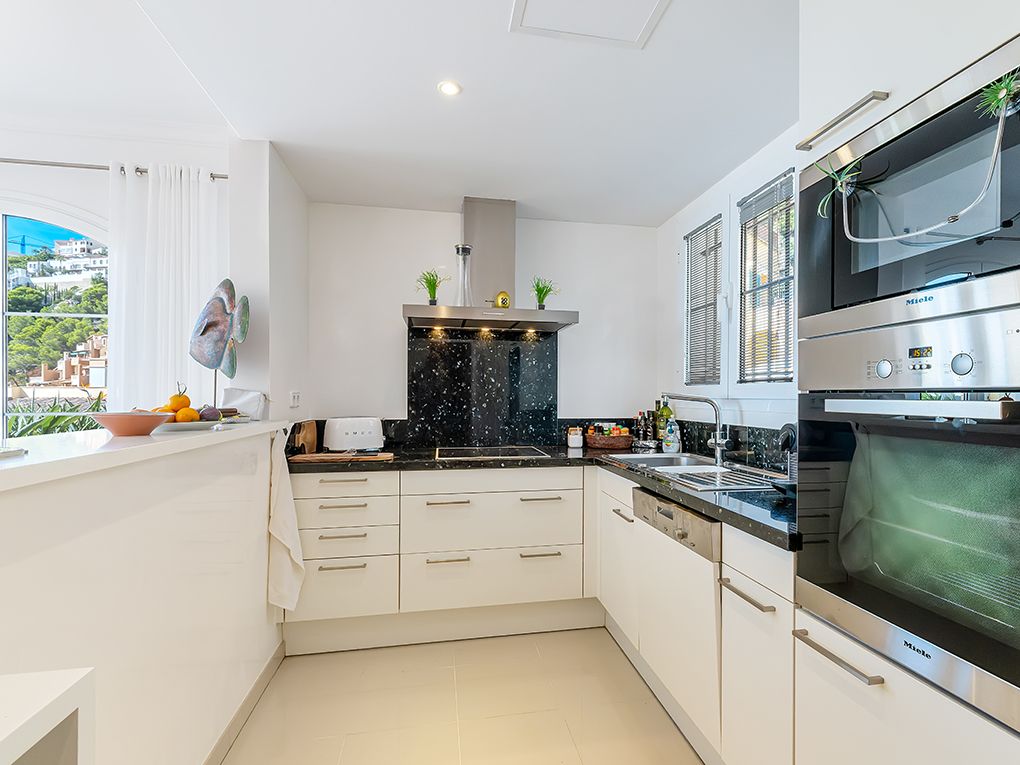 The apartment is located in a small exclusive community in Cala Llamp. In addition to the dream location with sea views, this new complex impresses with the successful outdoor concept with the large pool area and the well-kept green area. The property has two bedrooms, two bathrooms (one en suite), an open fully equipped kitchen and a spacious terrace area with direct access to the pool. The famous "Beach Club" with restaurant, bar, salt water pool and direct sea access is within 5 minutes walking distance. The harbor promenade of Port Andratx with a variety of restaurants, bars and stores is only a few minutes drive away. Other features include: Air conditioning w/c, underfloor heating in the bathrooms, utility room, open and covered terraces, parking space and elevator. The apartment is sold furnished.