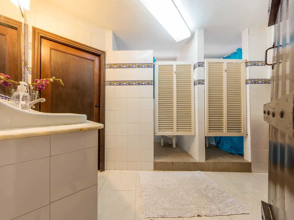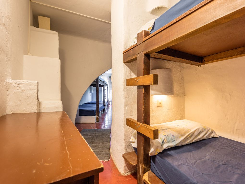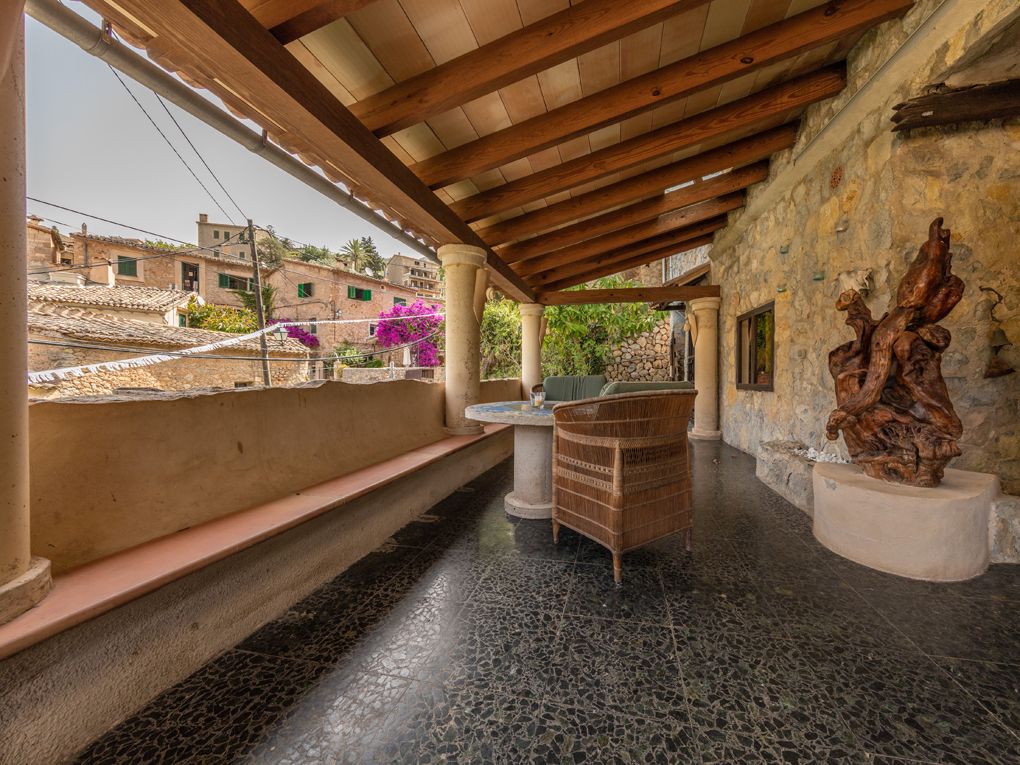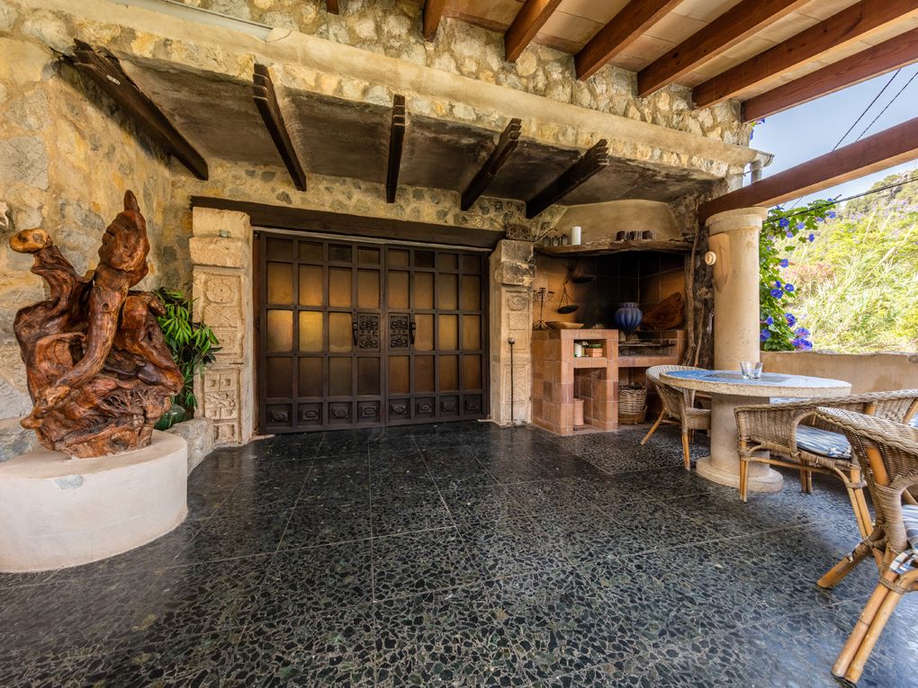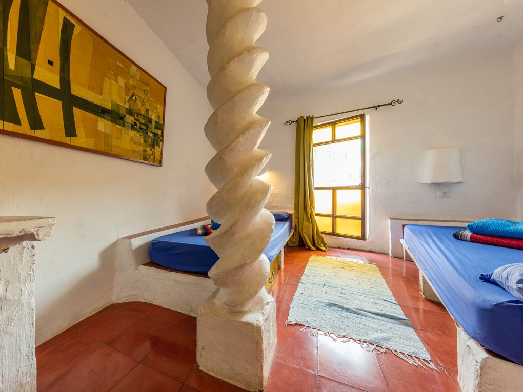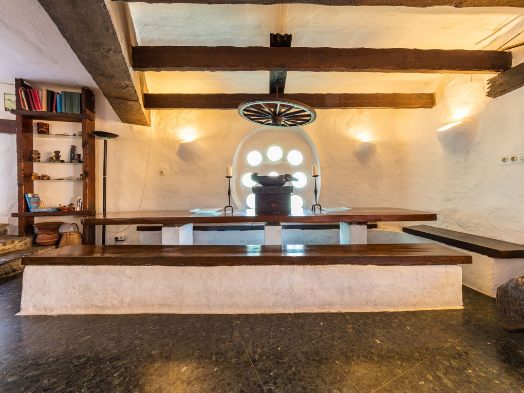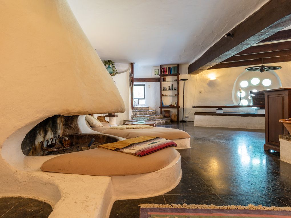 Designed and built by artist/arqueologist William Waldren in 1973, this unique house of stone, cement, wood and plaster has been a cultural, research, study-center and home since its inception. The ground floor is an apartment (can be used as commercial premises) with sitting room, bedroom, industrial kitchen, bath/shower room with wheelchair access. The first floor large terrace overlooks the village and opens through wide front doors with golden glass and hand-carved door handles based on Native American crows and masks. Inside is the black marble floored salon with white sculpted fireplace, a wall of natural rock, a fully equipped kitchen, a guest toilet, and a nine foot long dining table made from solid pieces of Mahogany Wood. Upstairs, on the second floor, there are two double bedrooms opening onto a small balcony, a third bedroom, a dormitory with eight bunk beds, a two shower bathroom and guest toilet and a studio flat with a small salon, bedroom, terrace and kitchenette. The third floor is an open terrace and three rooms that can be an attic flat, work rooms, studios or offices, etc. Adjoining land with lemon-grove. The location is ideal for walking to shops, restaurants and bars.