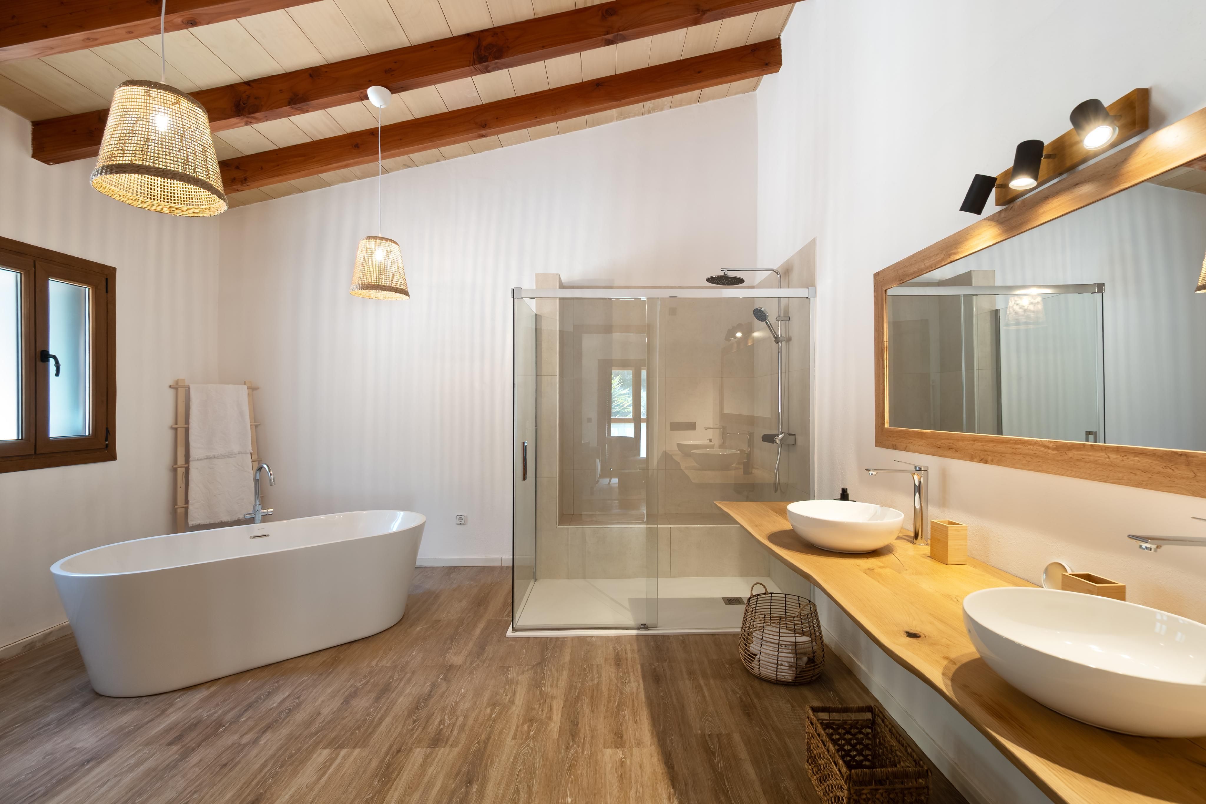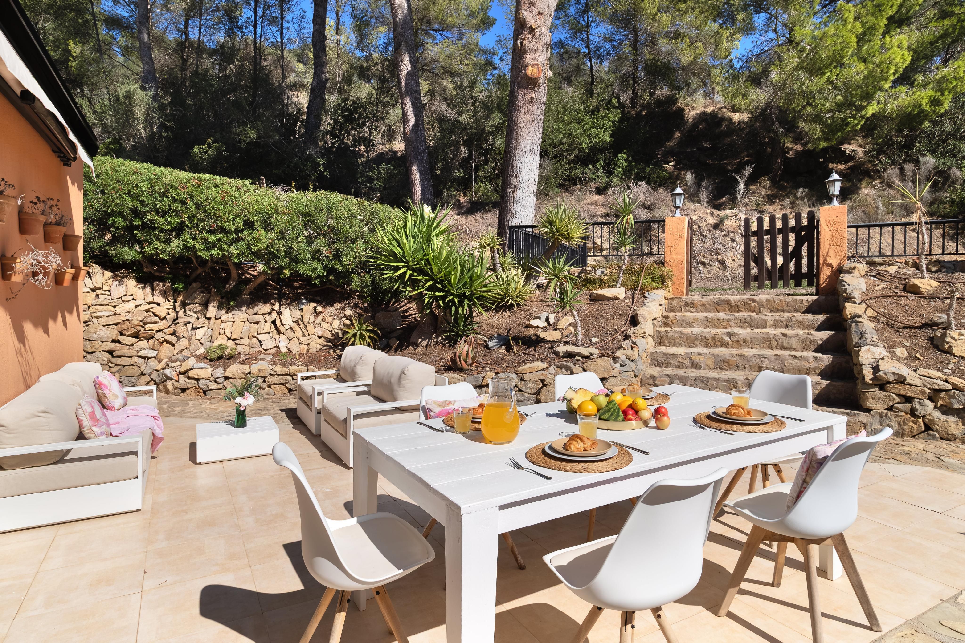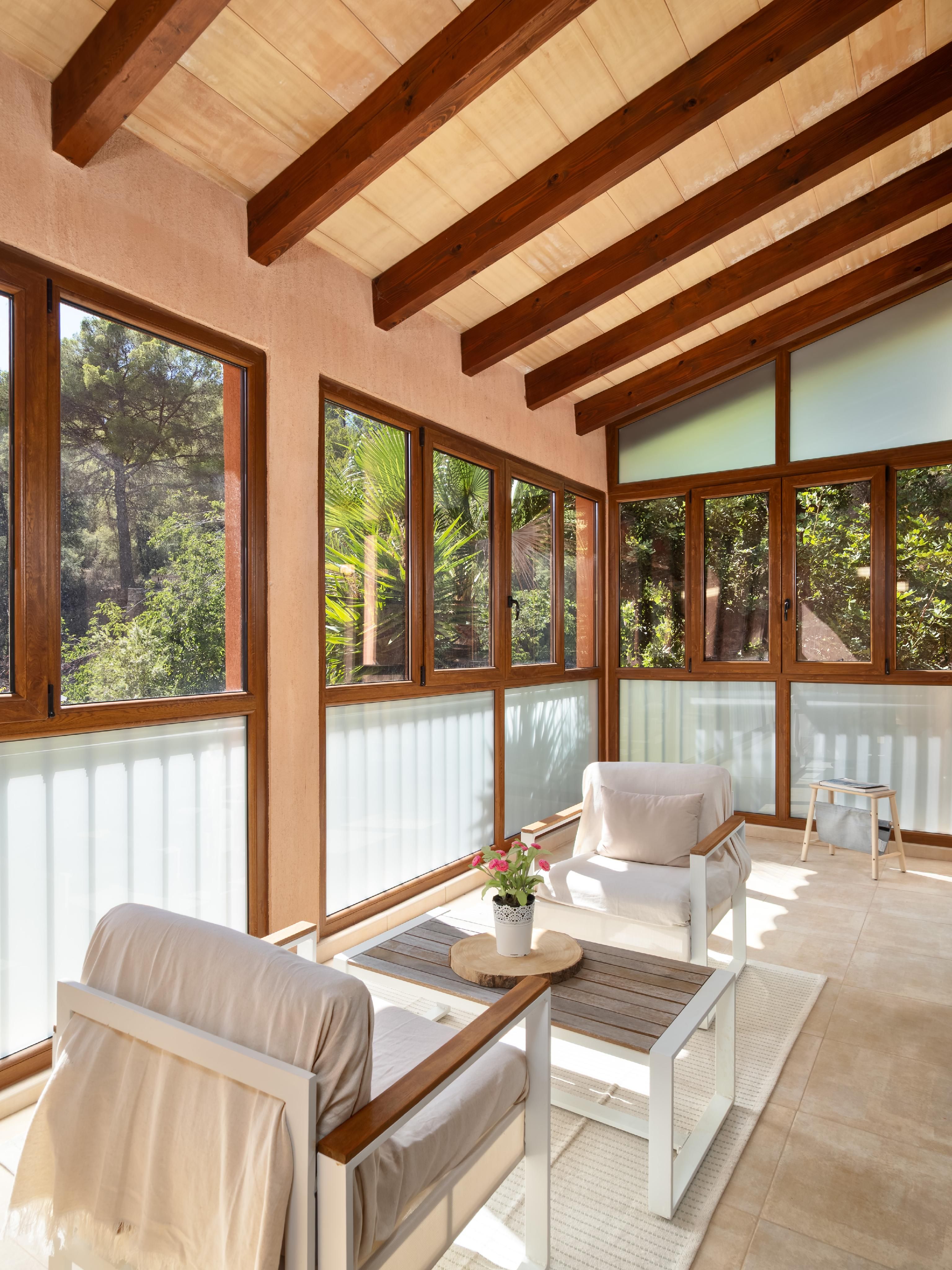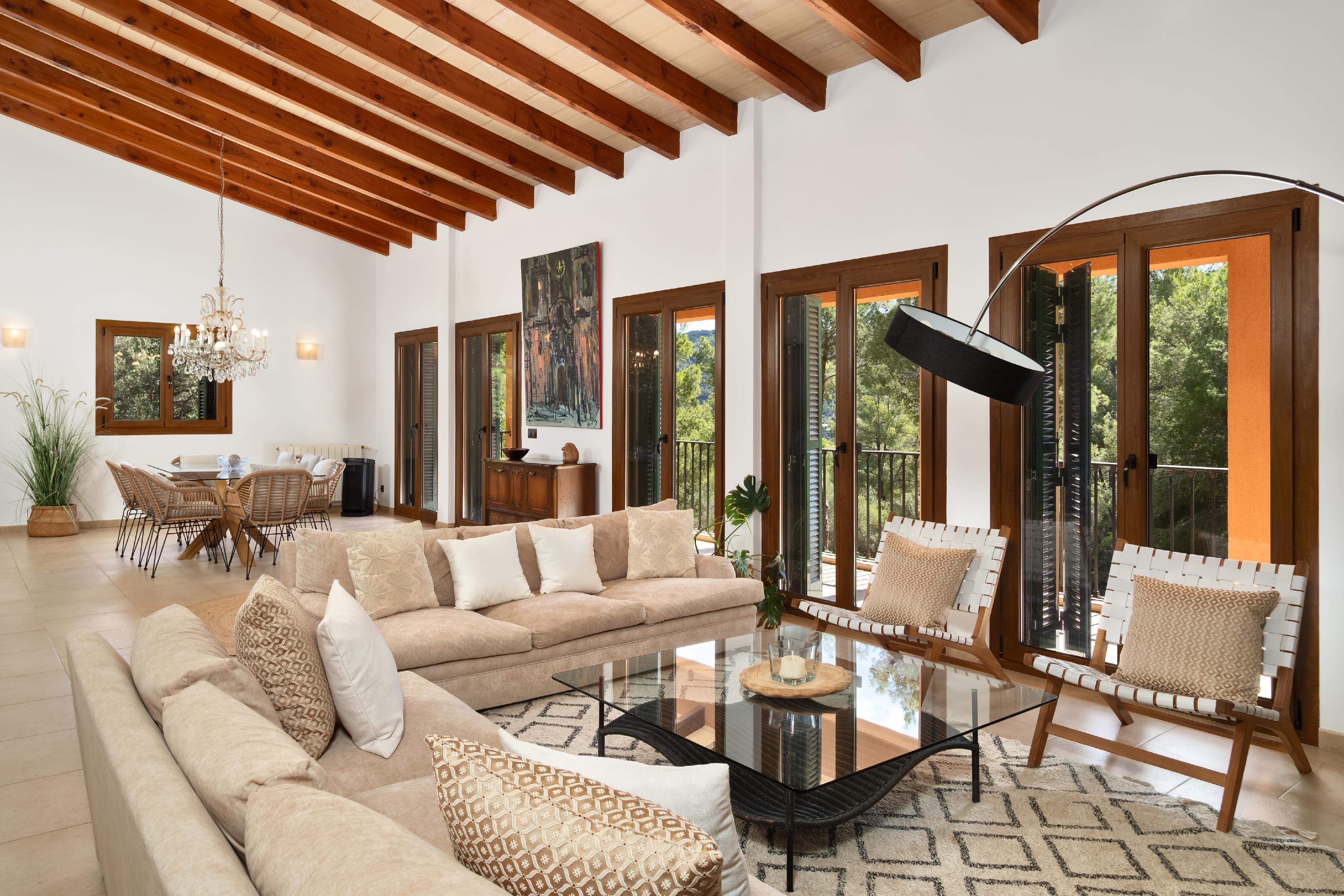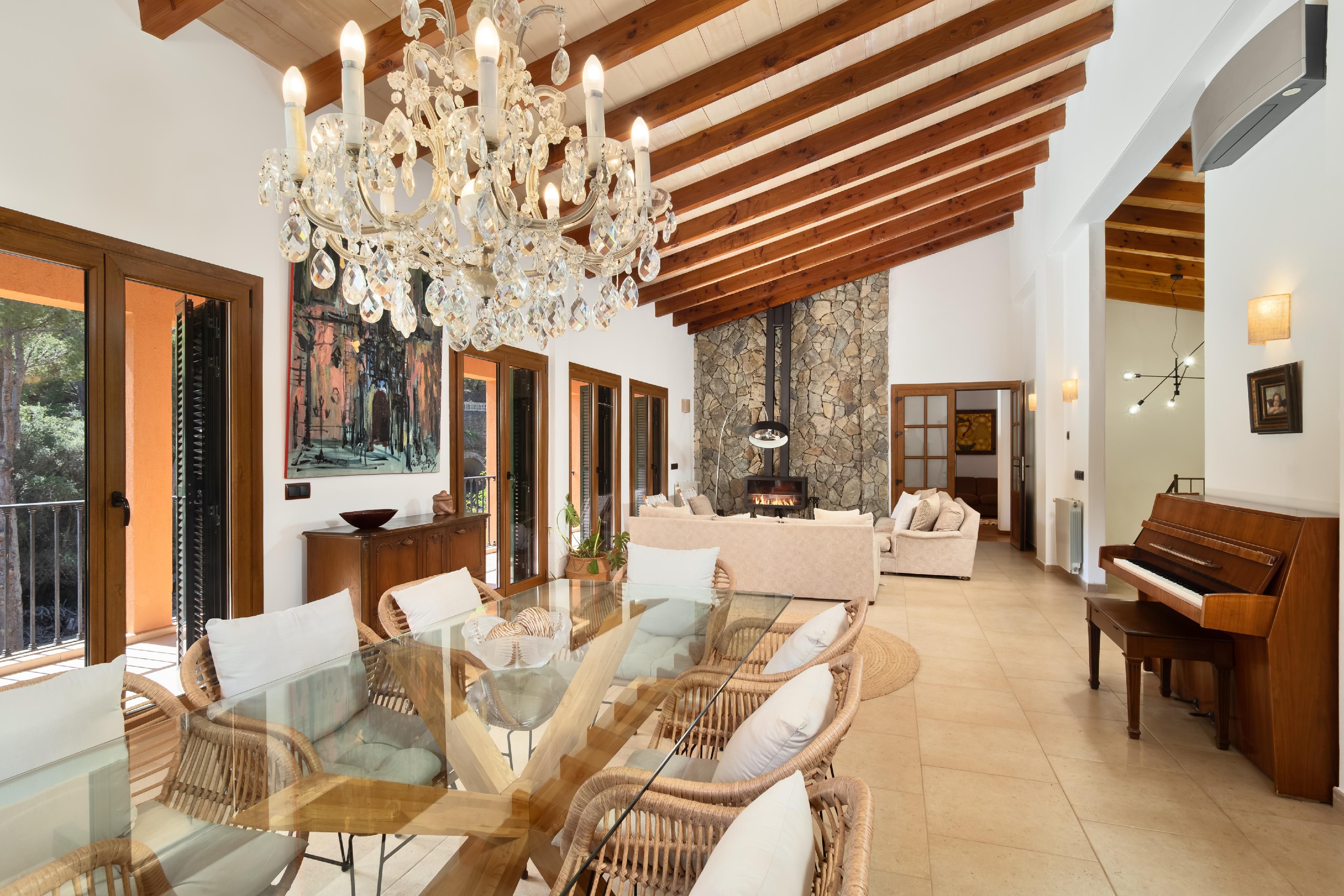 Nestled in the peaceful hills of Andratx, this impressive country estate offers a true sense of nature, privacy, and Mediterranean charm. A private driveway meanders through the estate’s own forest and natural landscape, leading to the main house, surrounded by pine trees and open countryside views. The property extends over approximately 60,000 m² and offers total tranquility, yet is located just a few minutes from the harbor of Puerto Andratx. The estate also benefits from a holiday rental license, making it an excellent investment opportunity as well as a private retreat. The main residence is spread over two floors with a total built area of approximately 530 m², of which around 455 m² correspond to living space. On the main floor, a generous entrance hall welcomes you, leading to a bright and spacious living and dining area with high ceilings, wooden beams, and a fireplace — creating a warm and elegant atmosphere. From here, you step out onto a large covered terrace overlooking the gardens and surrounding greenery. On this level there is also a fully equipped kitchen with direct access to the outdoor area and pool, as well as a large master suite with a private lounge, en-suite bathroom, and glazed terrace. On the lower level, three additional bedrooms — each with an en-suite bathroom — open directly onto the garden. The outdoor area features a large swimming pool (approx. 72 m²), sun terraces, and various relaxing corners surrounded by nature. A guest house and garage complete this exceptional property. This stunning property, set on an expansive plot of approximately 60,000 m², offers complete privacy and a serene setting with its own private forest, while being just minutes from Puerto Andratx. The residence boasts a living area of around 455 m² and a total constructed area of approximately 530 m², featuring four bedrooms, four bathrooms, and a charming guest house. Designed for comfort and modern living, it includes a fireplace, solar panels, garage, and a swimming pool, making it an exceptional retreat that combines natural beauty with luxury amenities. This finca is ideal for those seeking peace, authenticity, and a deep connection with nature — all within close reach of the exclusive port of Andratx.