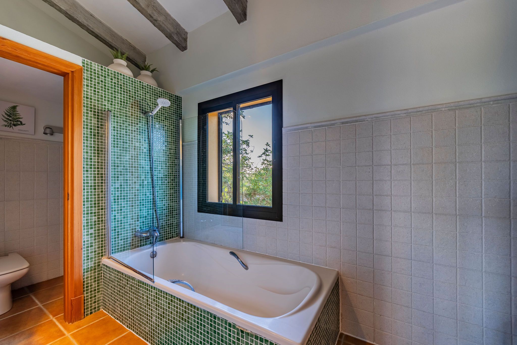 This finca, built in 2004, is quietly located on the outskirts of Ses Salines on a 18,037 m² plot. It holds one of the sought-after vacation rental licenses for up to six beds. Upon entering, you arrive in a spacious entrance area with a high ceiling. Centrally located is the staircase to the upper floor; to the side, a passage leads directly into the dining room, the focal point of the lower living area. From here, the path opens into the large living room with a charming fireplace. Both rooms provide access to a covered terrace, ideal for shared outdoor hours. Adjacent is the fully equipped kitchen, which also leads to a rear terrace. A bathroom with shower completes the ground floor. Upstairs are three bedrooms and two bathrooms, one of which is en suite. The master bedroom and another room have a large terrace with a wide view of the landscape towards the island of Cabrera, and the third bedroom has a balcony. The Mediterranean garden features a 48 m² saltwater pool, which can be heated with a heat pump. An adjacent pool house can be flexibly used as a guest house, gym, or workspace and is equipped with a bathroom, underfloor heating, and air conditioning. The technical equipment includes an oil heating system with radiators and split air conditioning units in the bedrooms. A garage offers space for a car, an existing tractor, and is also used as a workshop. This finca combines a well-thought-out room concept, diverse usage possibilities, and a quiet location near Ses Salines.