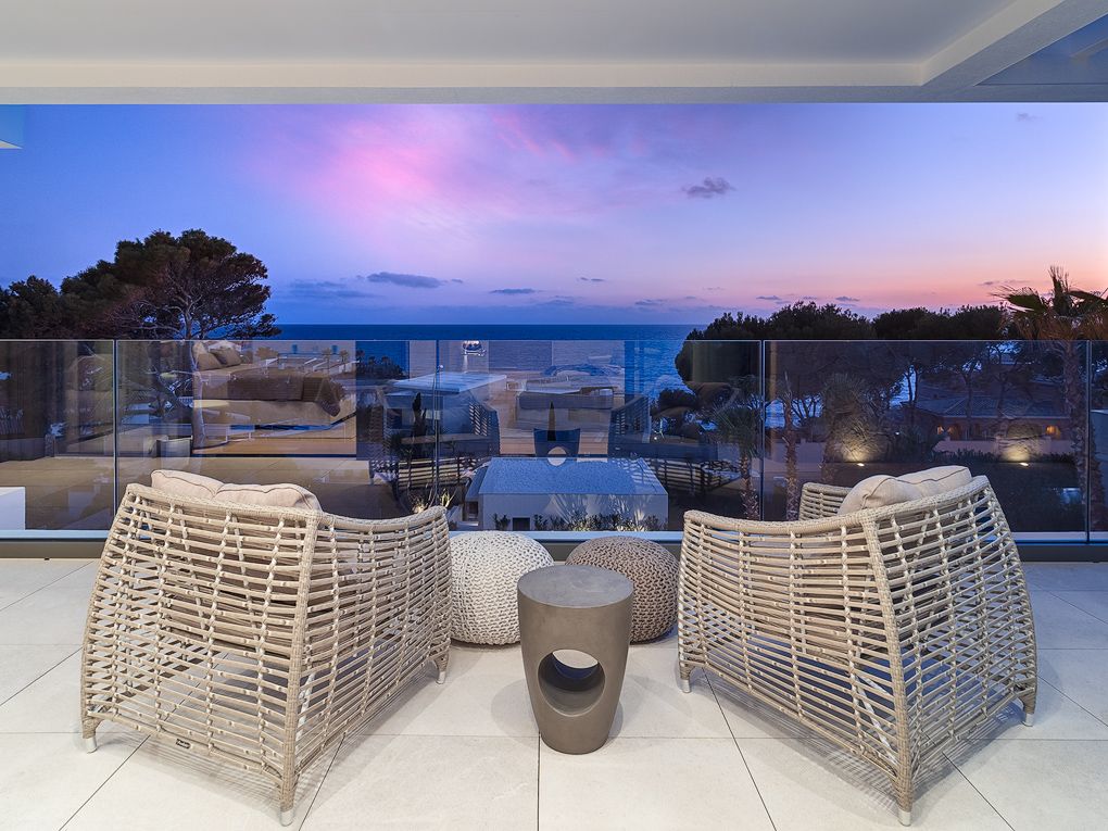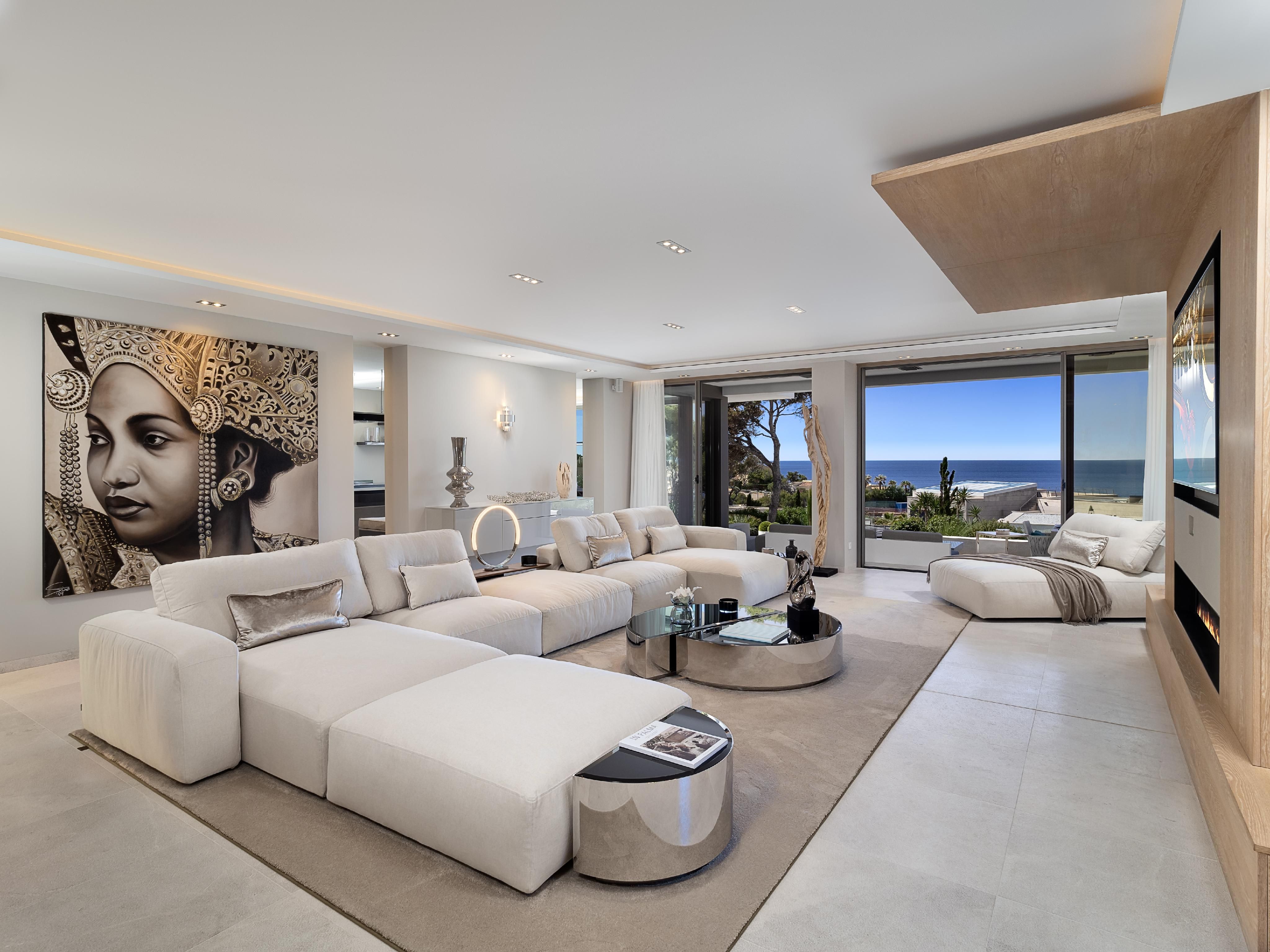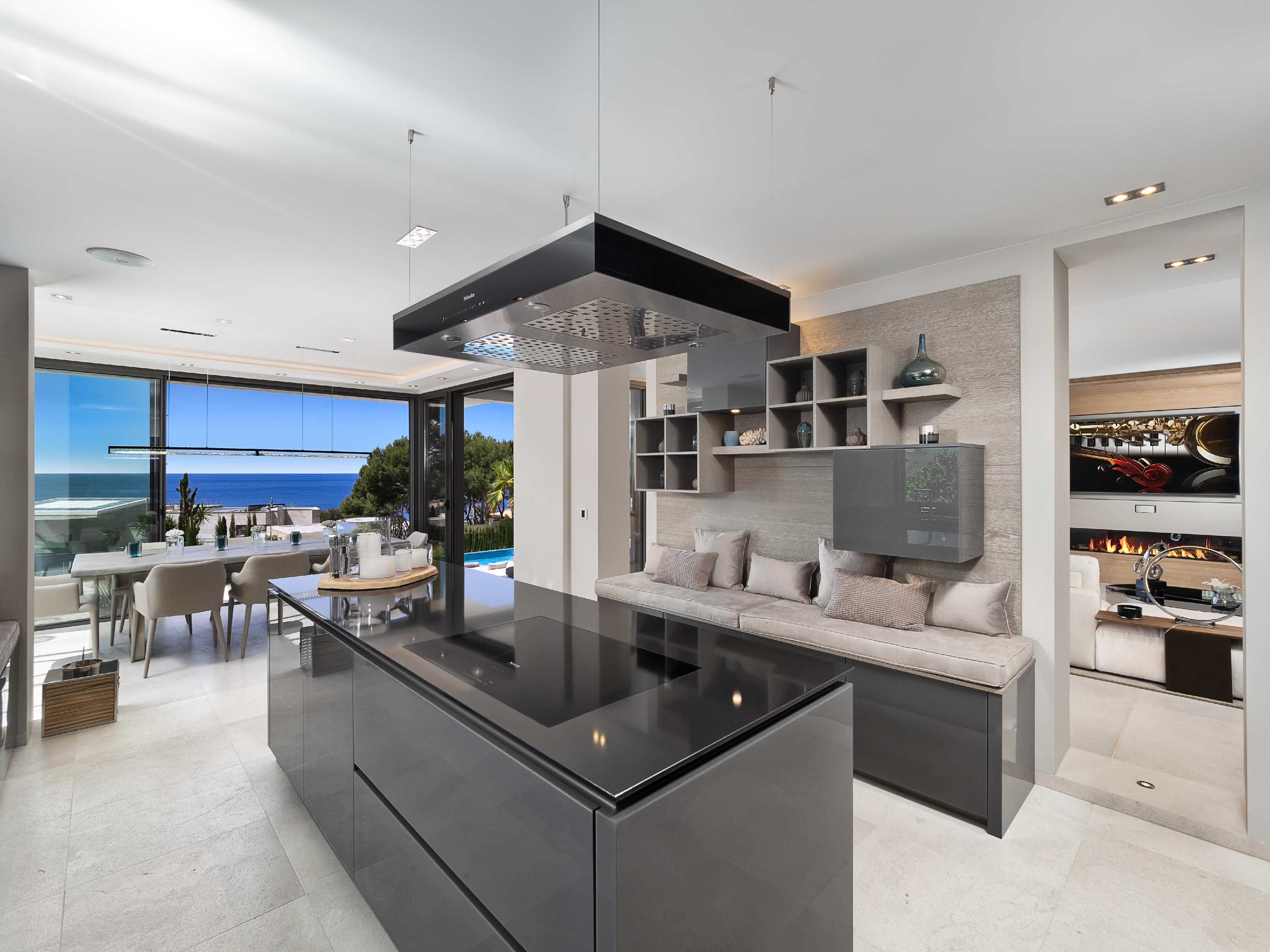 This beautiful modern villa, in a prime location in Nova Santa Ponsa, offers refined living just one row from the sea, with ideal southern exposure and breathtaking views from every level. Designed in a contemporary, light-filled architectural style, the property showcases first-class construction quality and premium materials throughout. The residence features four spacious bedrooms, each with its own en suite bathroom, along with a separate guest WC. The open-plan designer kitchen is outfitted with top-of-the-line appliances by Miele and Bosch, seamlessly blending style and functionality. A generously proportioned living area with a gas fireplace opens directly onto the terrace, creating a warm and inviting atmosphere, particularly during the cooler months. Outdoors, an elegant overflow pool is complemented by lovely sun terraces, a fully equipped outdoor kitchen, and thoughtfully designed covered lounge areas that provide shade in summer. Thanks to the extensive use of glass elements, the villa is bathed in natural light throughout the winter months. Additional features include a double garage, underfloor heating with a solar-assisted heat pump, reversible air conditioning, high-end natural stone flooring in the living areas, and oak parquet in the bedrooms. The Mediterranean garden is enhanced by ambient lighting and an automatic irrigation system, while superior insulation and double-glazed aluminum windows with slimline frames ensure year-round comfort. This is a wonderful opportunity to acquire a luxury villa in one of the most sought-after locations in the southwest of Mallorca.