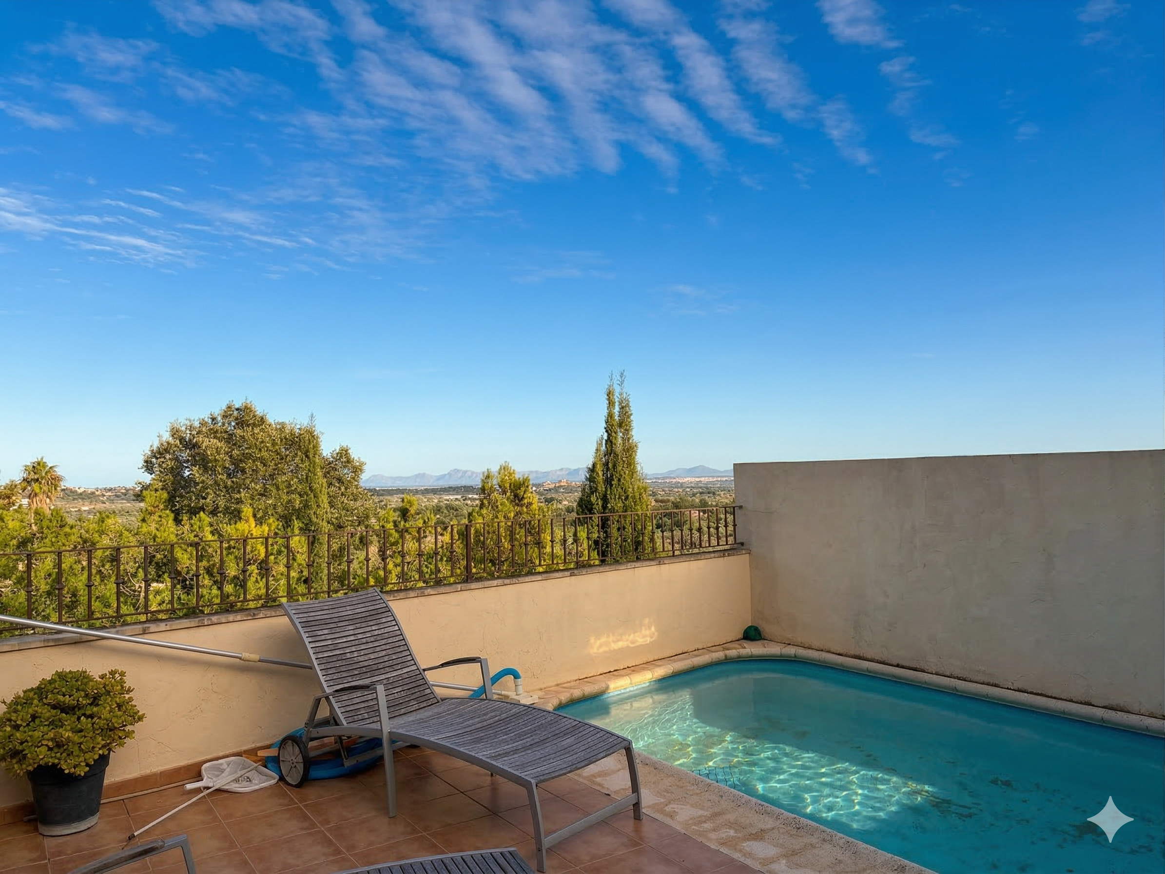 The heart of the home is the cozy kitchen-dining area, which flows seamlessly into the private outdoor space. Here, the sunny terrace and swimming pool invite you to relax and enjoy the Mediterranean lifestyle. A unique highlight is the spacious basement, accessible directly from the terrace, which houses a large entertainment room equipped with a rustic fireplace, a kitchenette, and a separate bathroom—perfect for hosting gatherings.