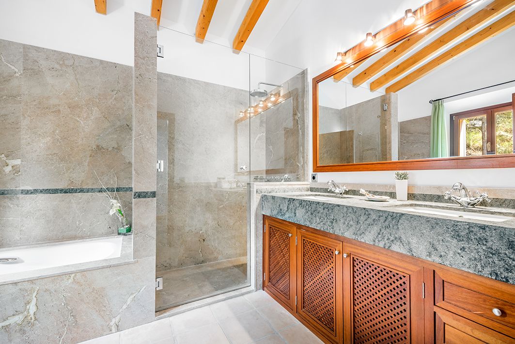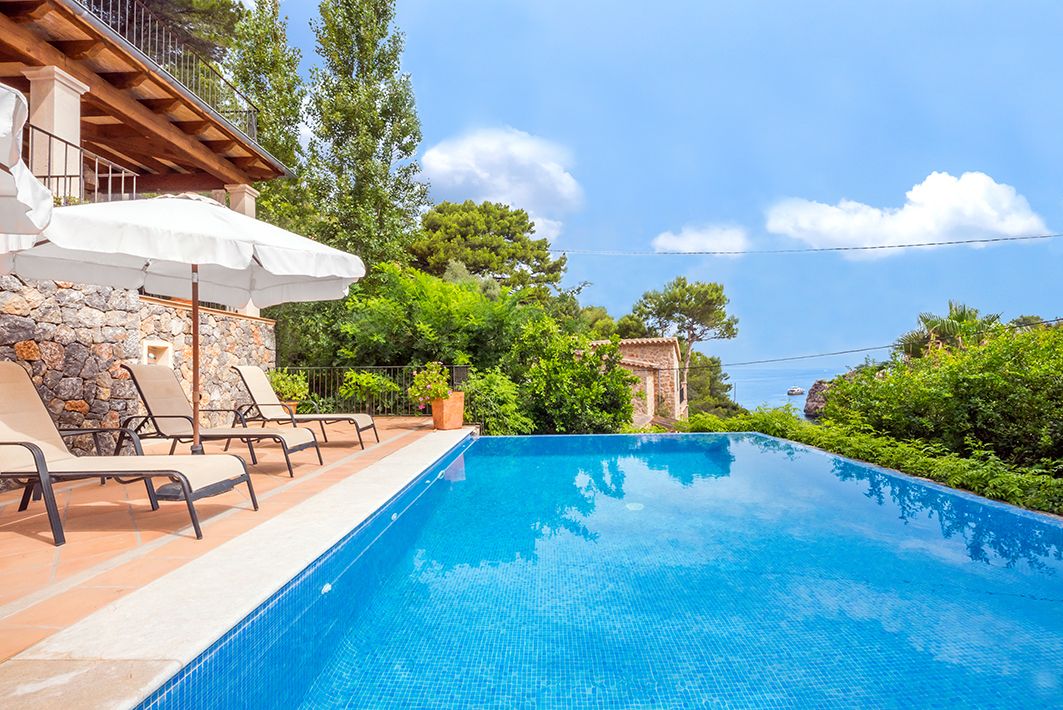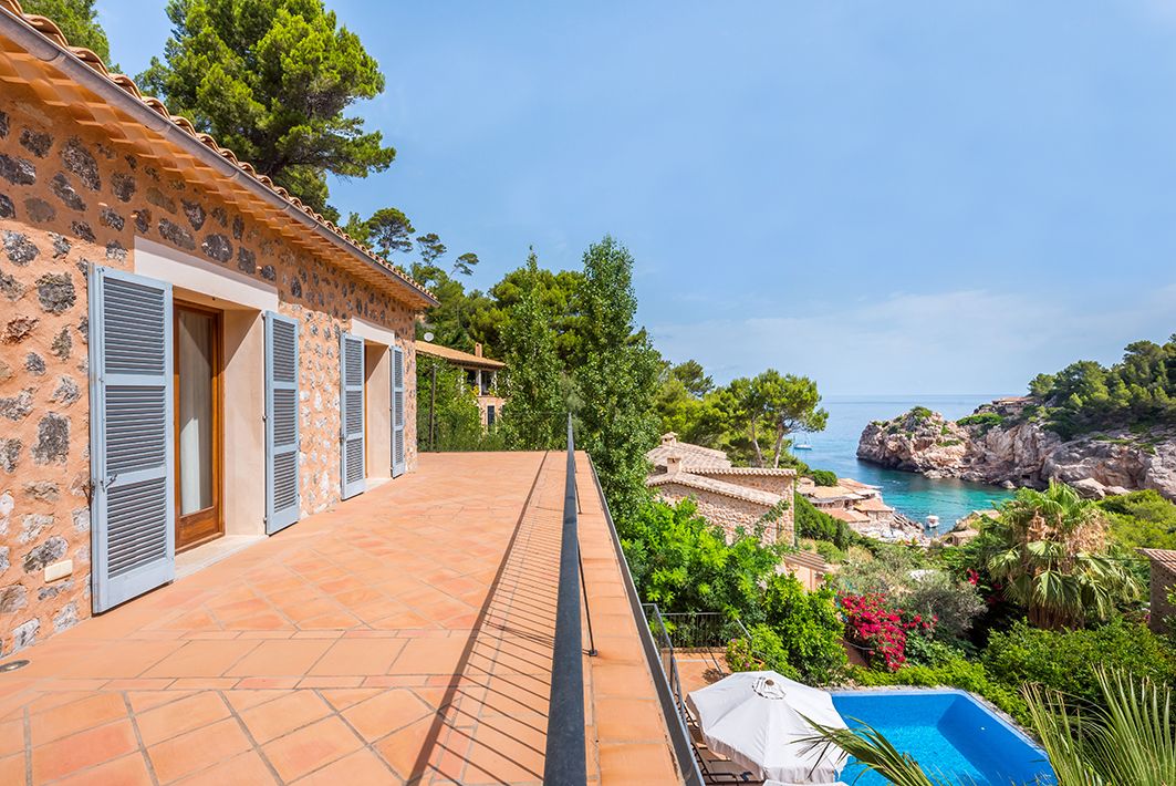 Great villa located in Cala de Deià, with stunning views of the sea and mountains, barely 100 meters from the beach. The house is built in traditional Mallorquin style, with the highest-quality rustic finish. It has three stages, connected by a staircase as well as a lift. At semi-basement level, we find a bedroom with en-suite bathroom, a utility room, a gym with a Jacuzzi and indoor pool, a machine room and a two-car garage. The first floor contains a fully-equipped kitchen, and a combination dining-living room with fireplace. These have access to a covered terrace with a barbecue and an outdoor pool, a guest toilet and a bedroom with en-suite bathroom. The top floor has two additional bedrooms, each with a walk-in wardrobe and en-suite bathroom, both having access to a 60m² terrace. This is without doubt a place with a unique location, and one of the last available properties in the area to own a holiday-rental license.