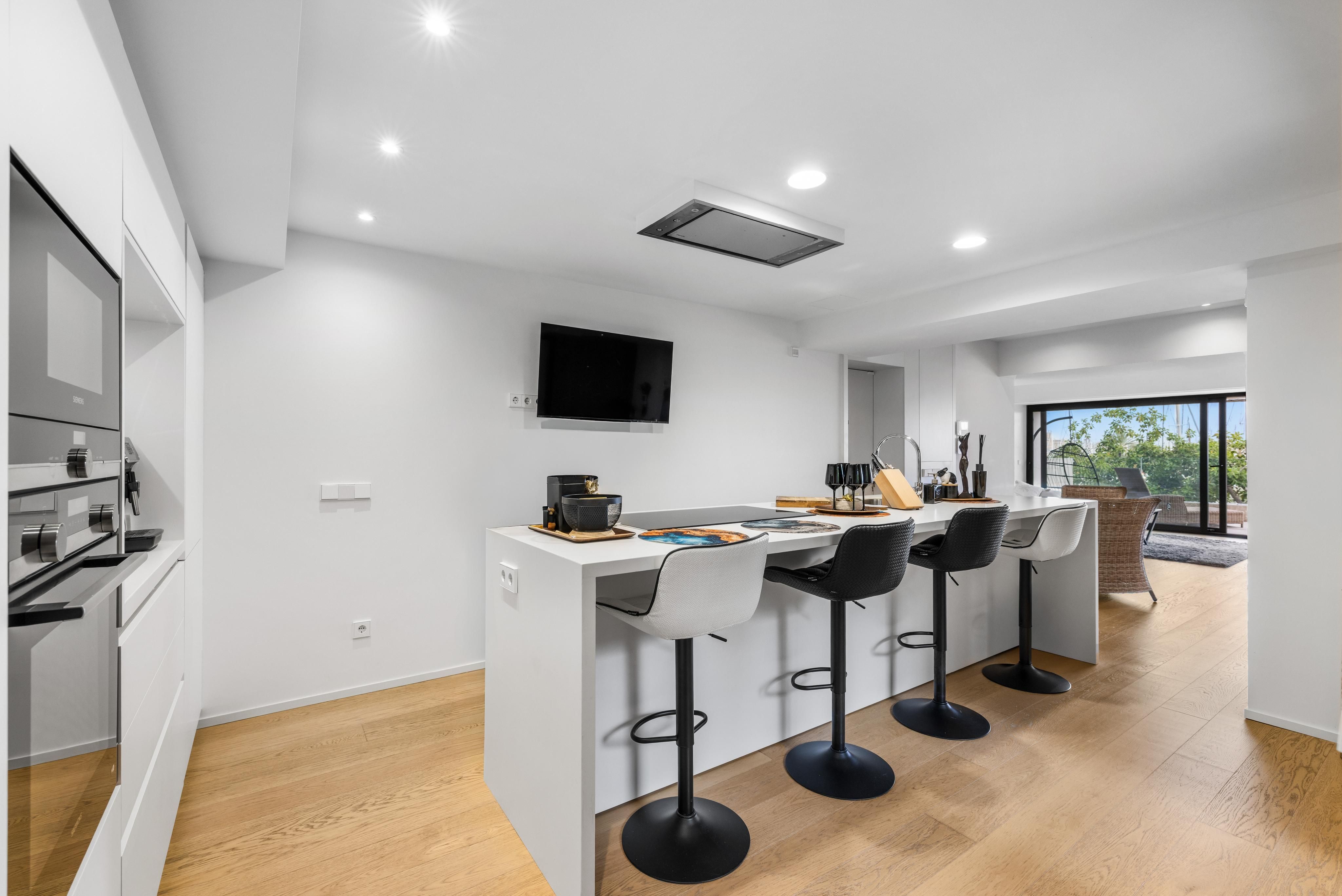 The heart of the home is its spacious living and dining area with an integrated kitchen, conceived as a fluid and elegant space that opens directly onto a generous terrace with unobstructed views of the water and the harbour. This outdoor setting becomes a natural extension of the interior, ideal for enjoying the Mediterranean lifestyle all year round.