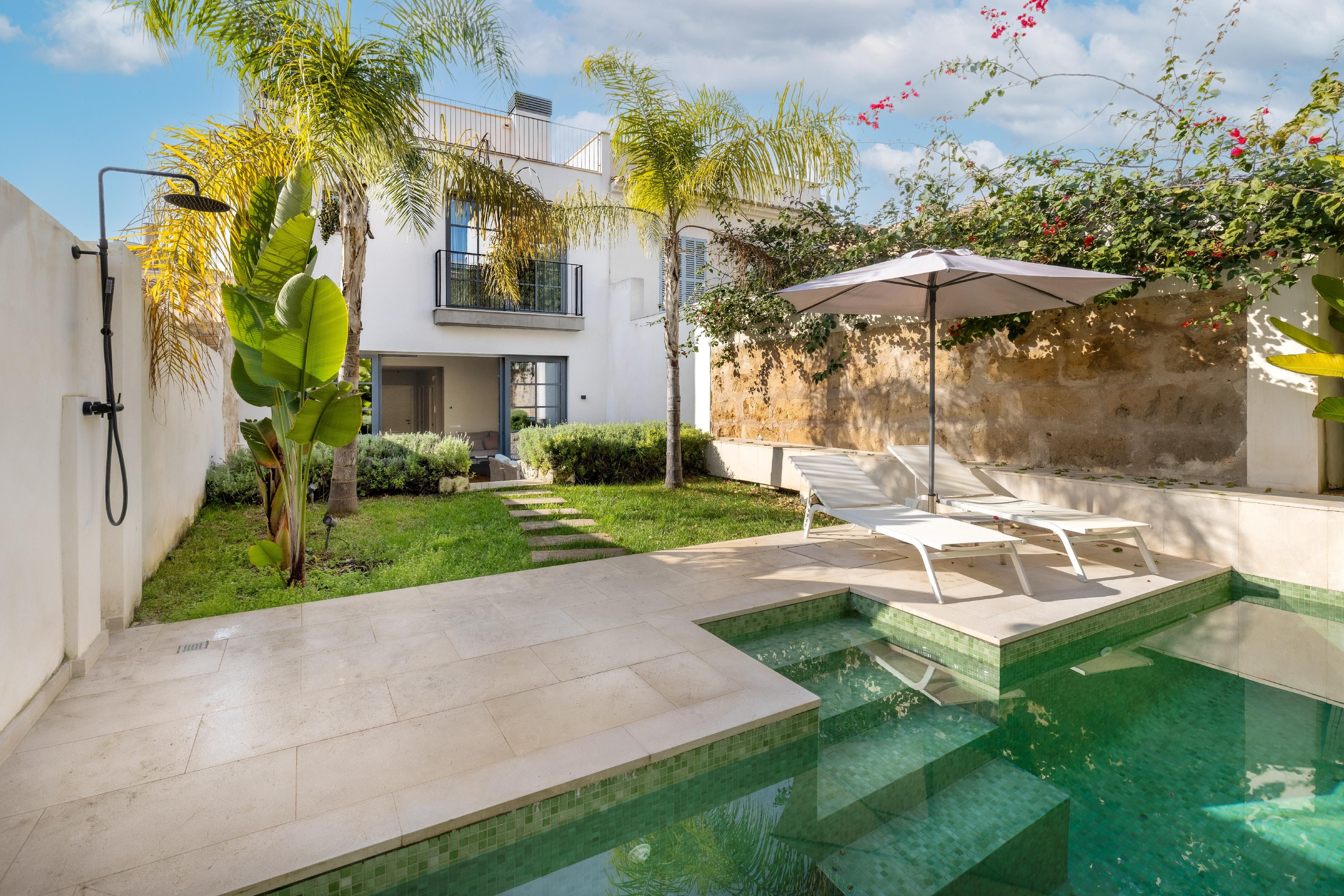 Where modern, central living meets cozy privacy, this beautiful townhouse in Palma offers an exceptional home designed for both relaxation and entertaining. Step inside and be welcomed by an inviting living and kitchen area that flows effortlessly into the charming outdoor spaces. On the ground floor, you will also find a dedicated office, a guest toilet, and direct access to the garden featuring a stunning saltwater swimming pool, an outdoor shower, and two cozy seating areas,perfect for unwinding in total privacy.