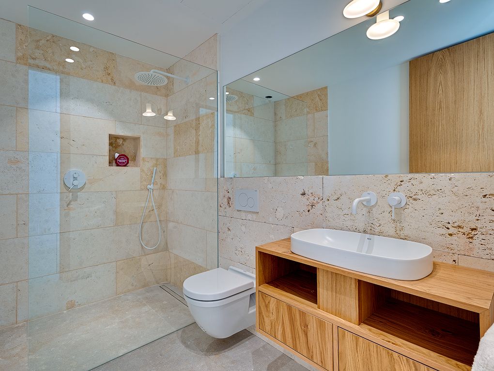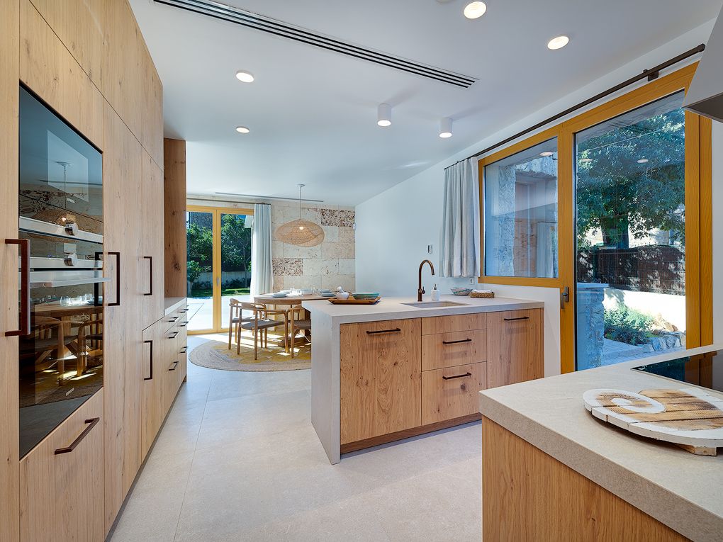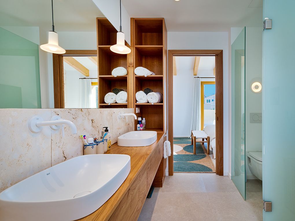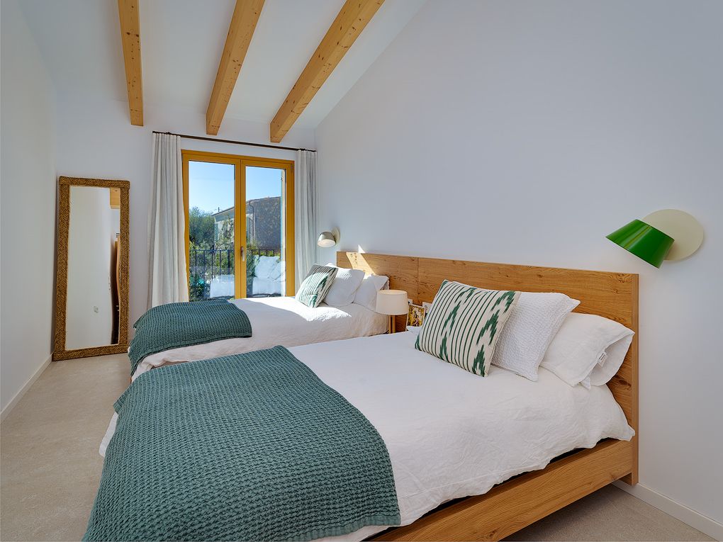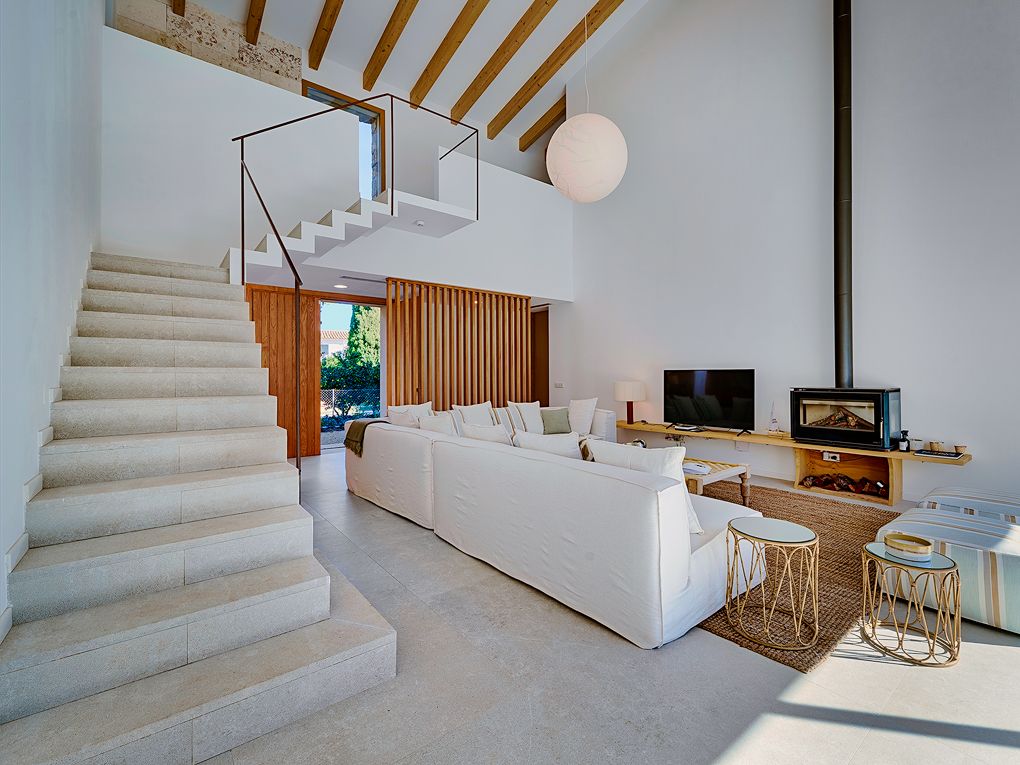 This villa built to the highest standards in a Finca style offers a well thought out living comfort with light-flooded open spaces. The harmonious combination of traditional and modern, as well as fine and natural stone give this villa an inviting character. The Mediterranean garden creates a high degree of privacy, the covered terrace, as well as an outdoor kitchen with barbecue and saltwater pool invites you to spend relaxing days at home. The open design with double height ceilings in the living room as well as the large floor-to-ceiling windows create a lot of free space and atmosphere. The custom-made designer kitchen is equipped with the modern appliances, such as a wine fridge, osmosis system for drinking wáter, etc. On the same level is a guest toilet and a spacious bedroom with en-suite bathroom and access to the pool, garden and a utility room and garage. The upper floor has three bedrooms with private terraces, one of them as a master has en suite bathroom. Impressive The ceilings impresses with typical Mallorcan wooden beams. The unique location of this villa allows views of the surrounding village landscape and mountains from every room. Each bedroom has ample storage space, two of which are master bedrooms with en-suite bathrooms. In the basement there is space for a further guest room, wine cellar or a fitness room with a generous spacious wellness/spa area.